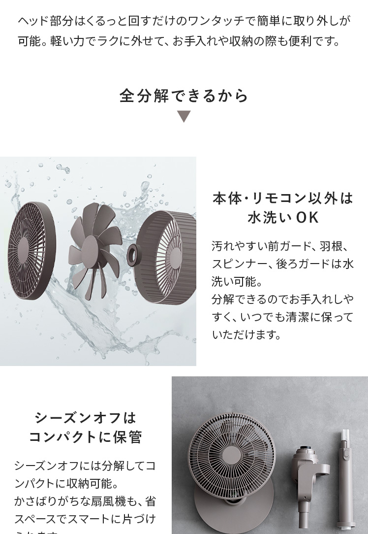 ワンタッチ全分解 扇風機 おしゃれ DCモーター 風量7段階 9枚羽根 全分解 丸洗い リモコン付き OFFタイマー 静音設計 省エネ 360度首振り 真上 高さ7段階 サーキュレーター