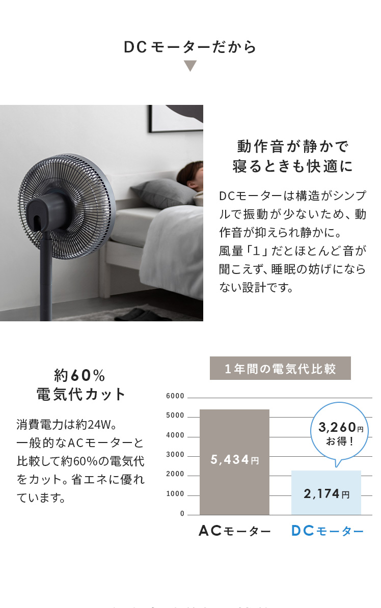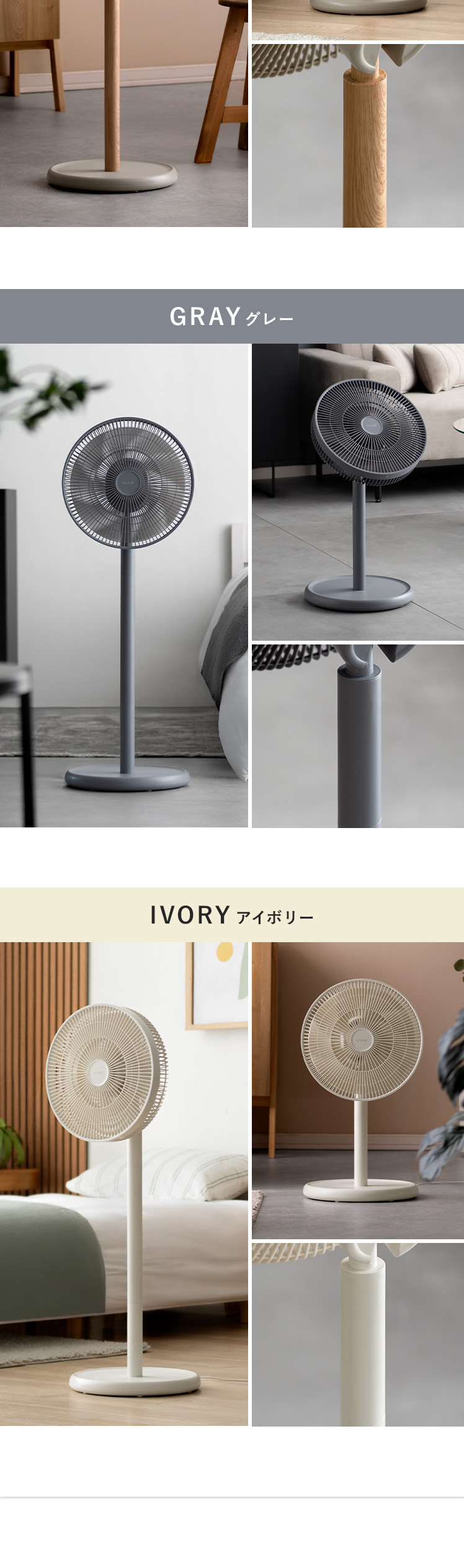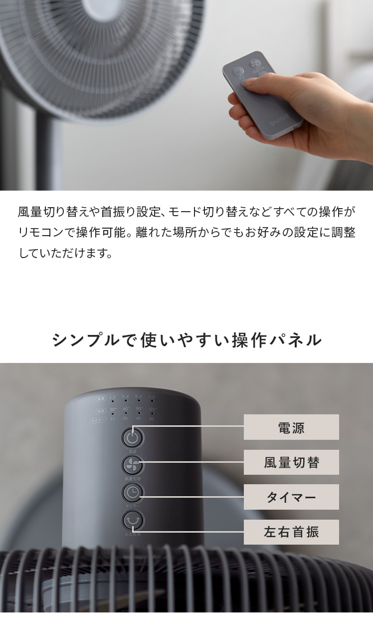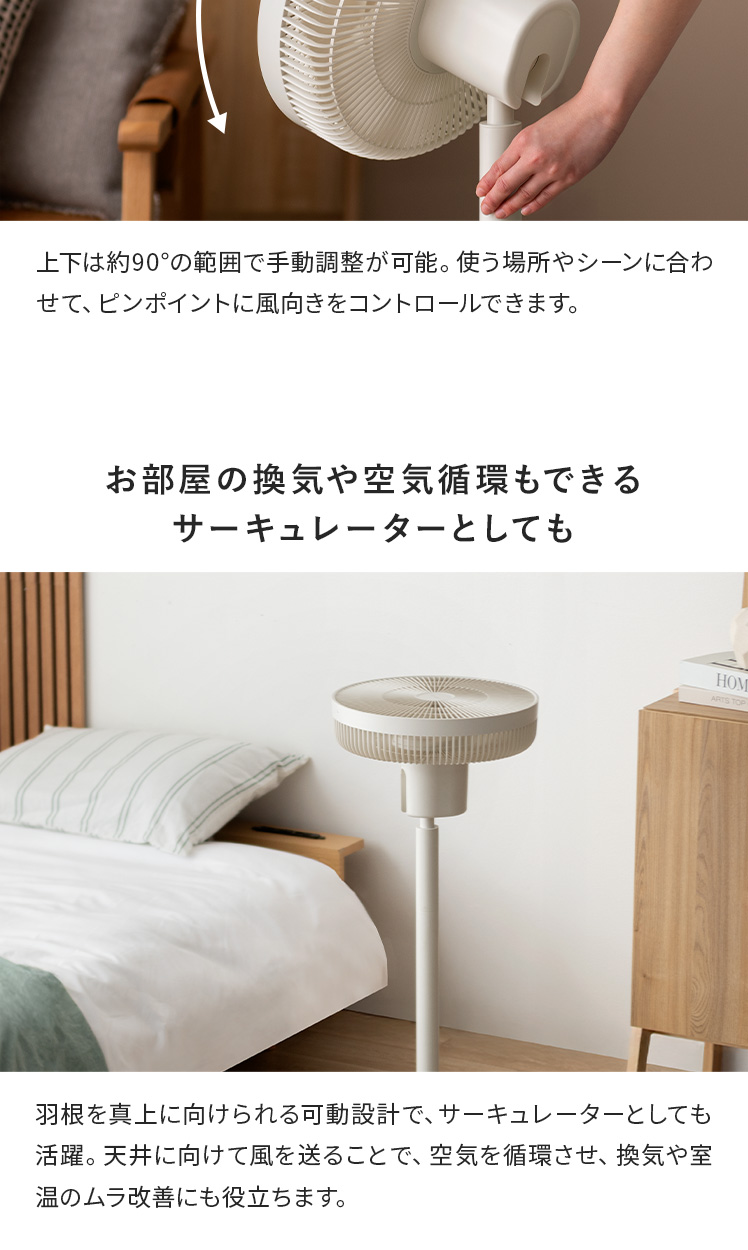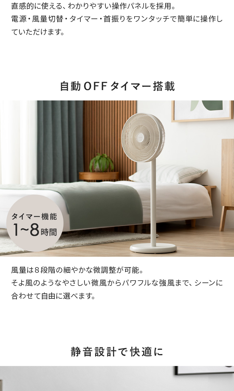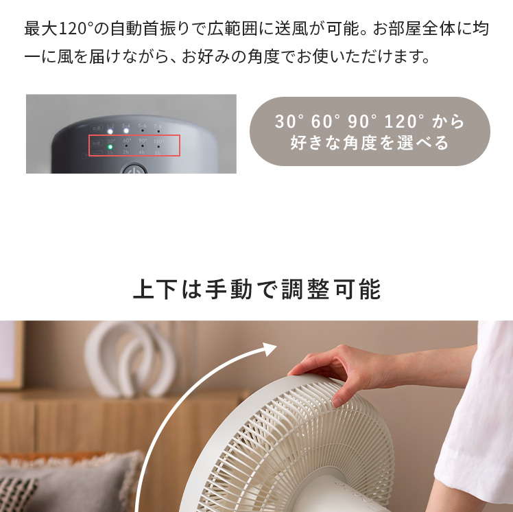 | 機能 | 上下首振り約90°(手動)、左右首振り30〜120°(自動)、風量8段階調整、 ON/OFFタイマー機能(1〜8時間)、高さ2段階調整 |