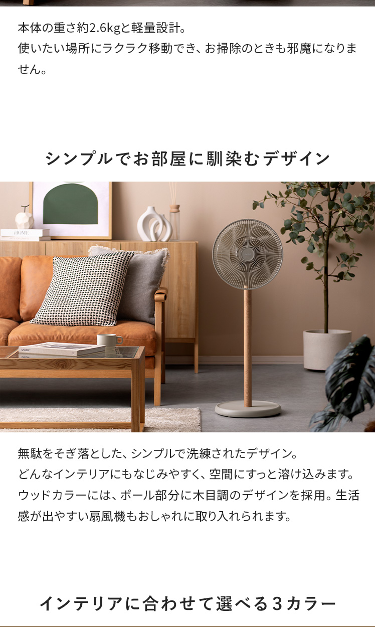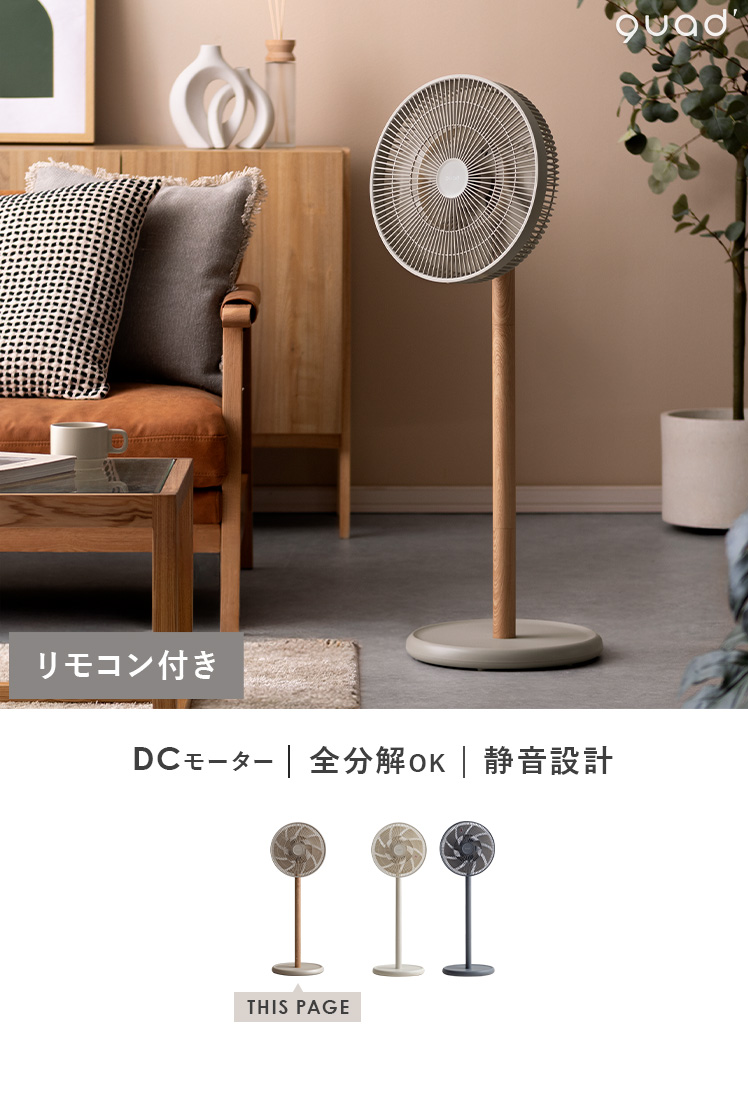 quad'〔クワッズ〕DCリビングサーキュレーターファン スマートエアDC ウッドタイプ/空間に美しく馴染む、シンプルで洗練されたデザイン。14枚の羽根がつくるやわらかく心地よい風が、暮らしを快適に整えます。DCモーター搭載で静音性・省エネ性にも優れ、サーキュレーターとしても活躍。機能性と心地よさを兼ね備えた1台です。