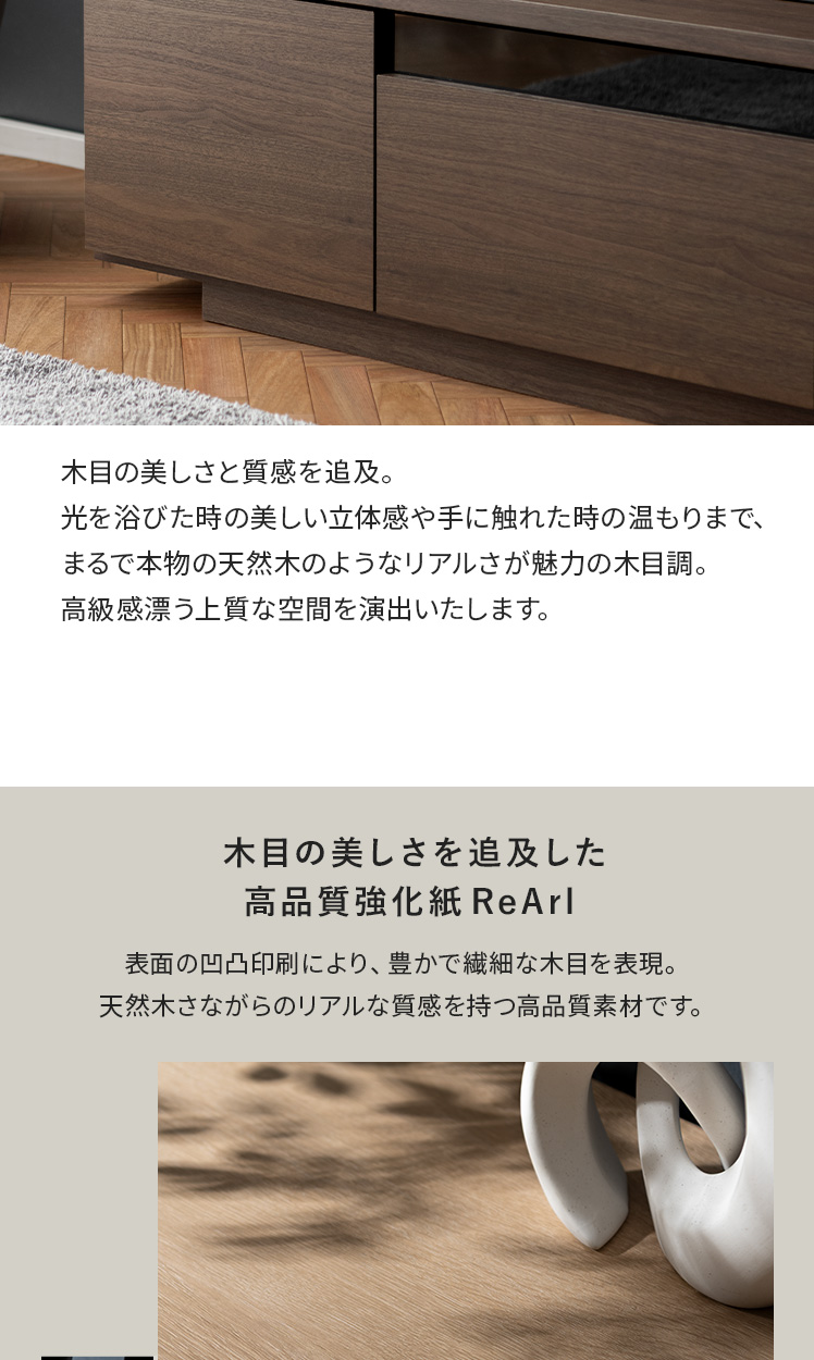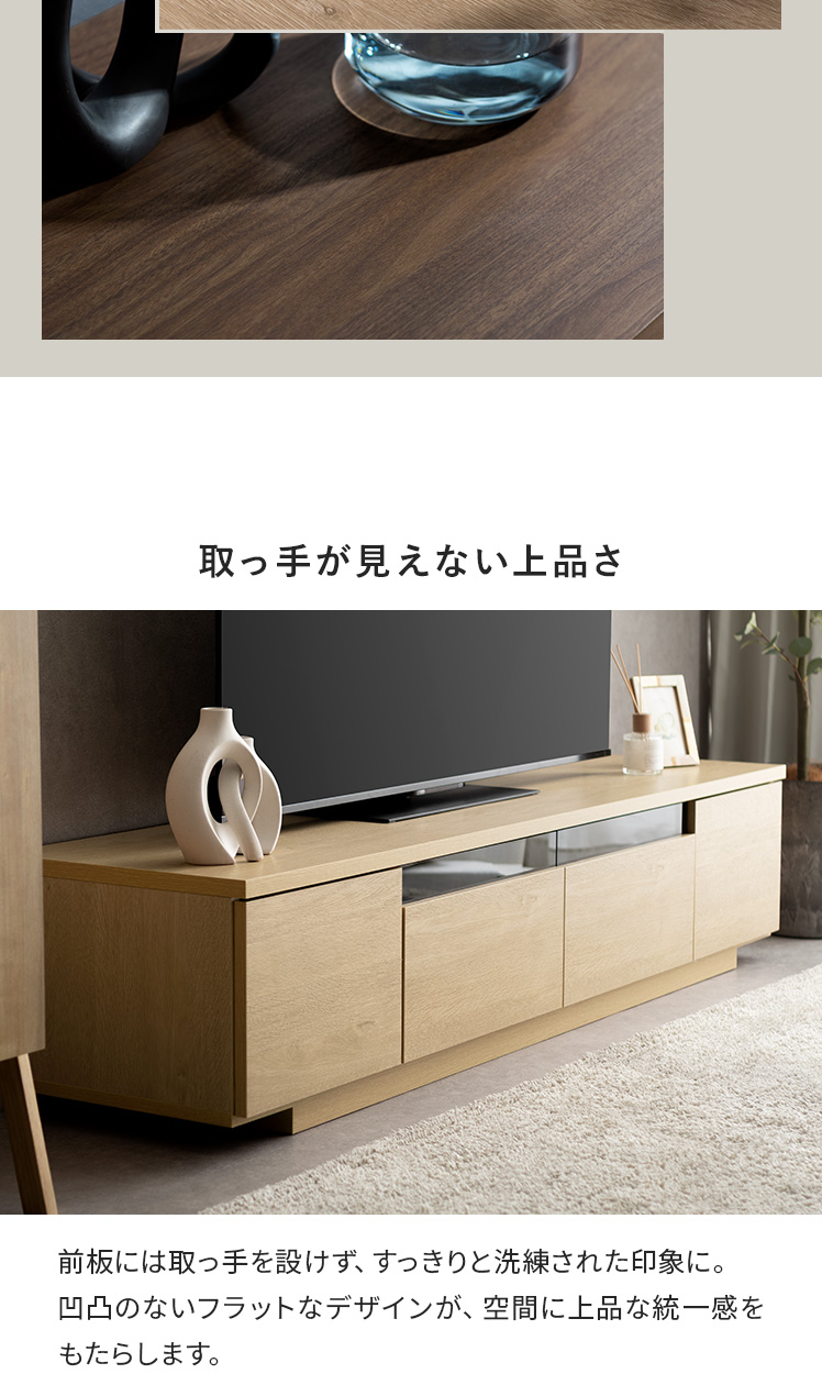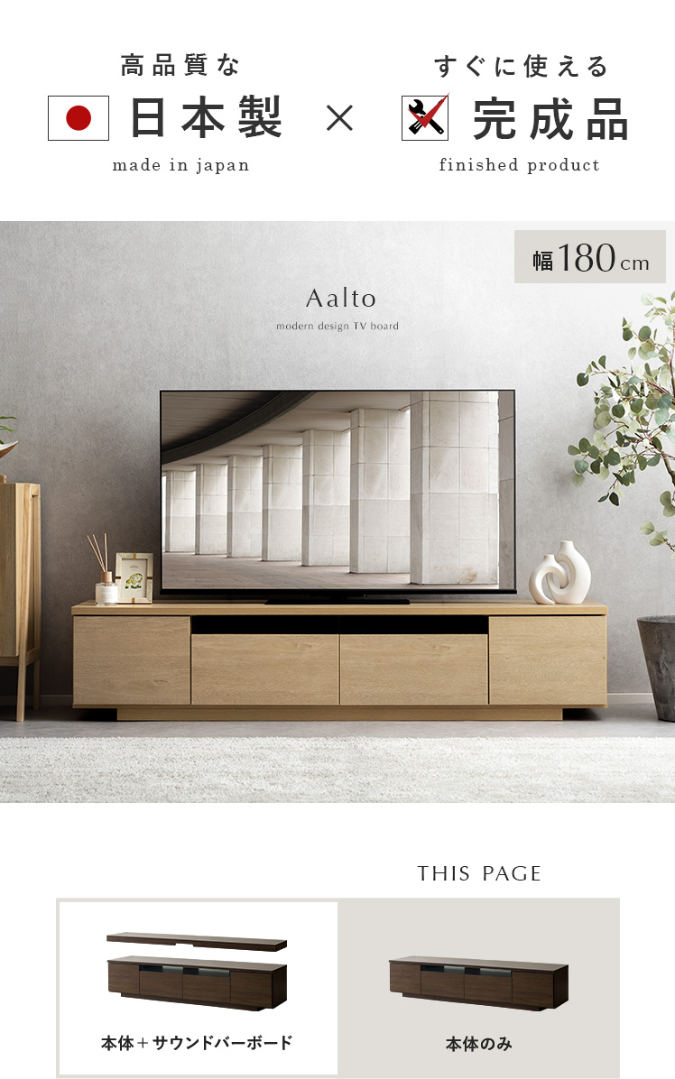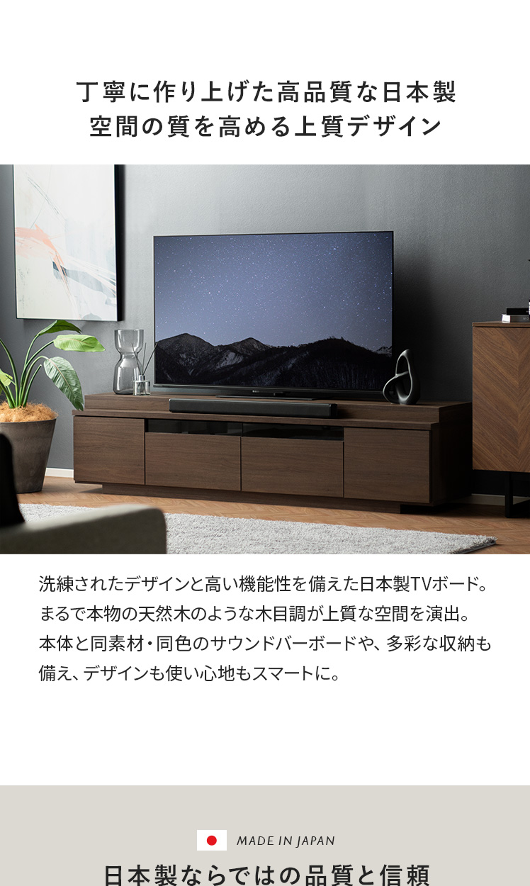 テレビボード Aalto linea〔アールト リネア〕 180cm幅 単品販売/洗練されたデザインと高い機能性を備えた日本製TVボード。まるで本物の天然木のような木目調が上質な空間を演出。本体と同素材・同色のサウンドバーボードや、多彩な収納も備え、デザインも使い心地もスマートに。