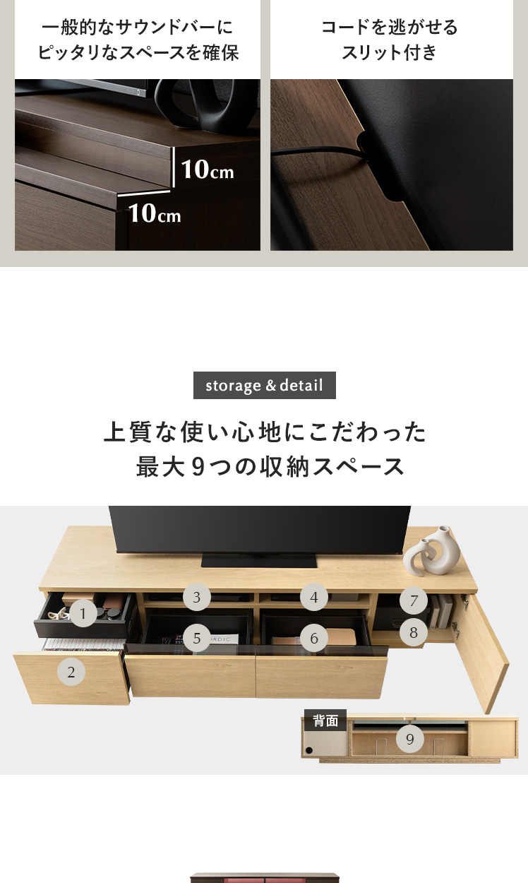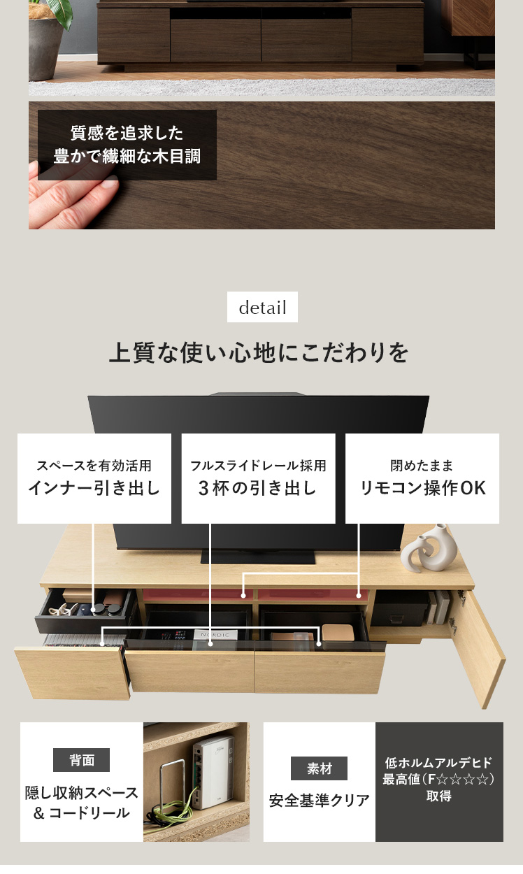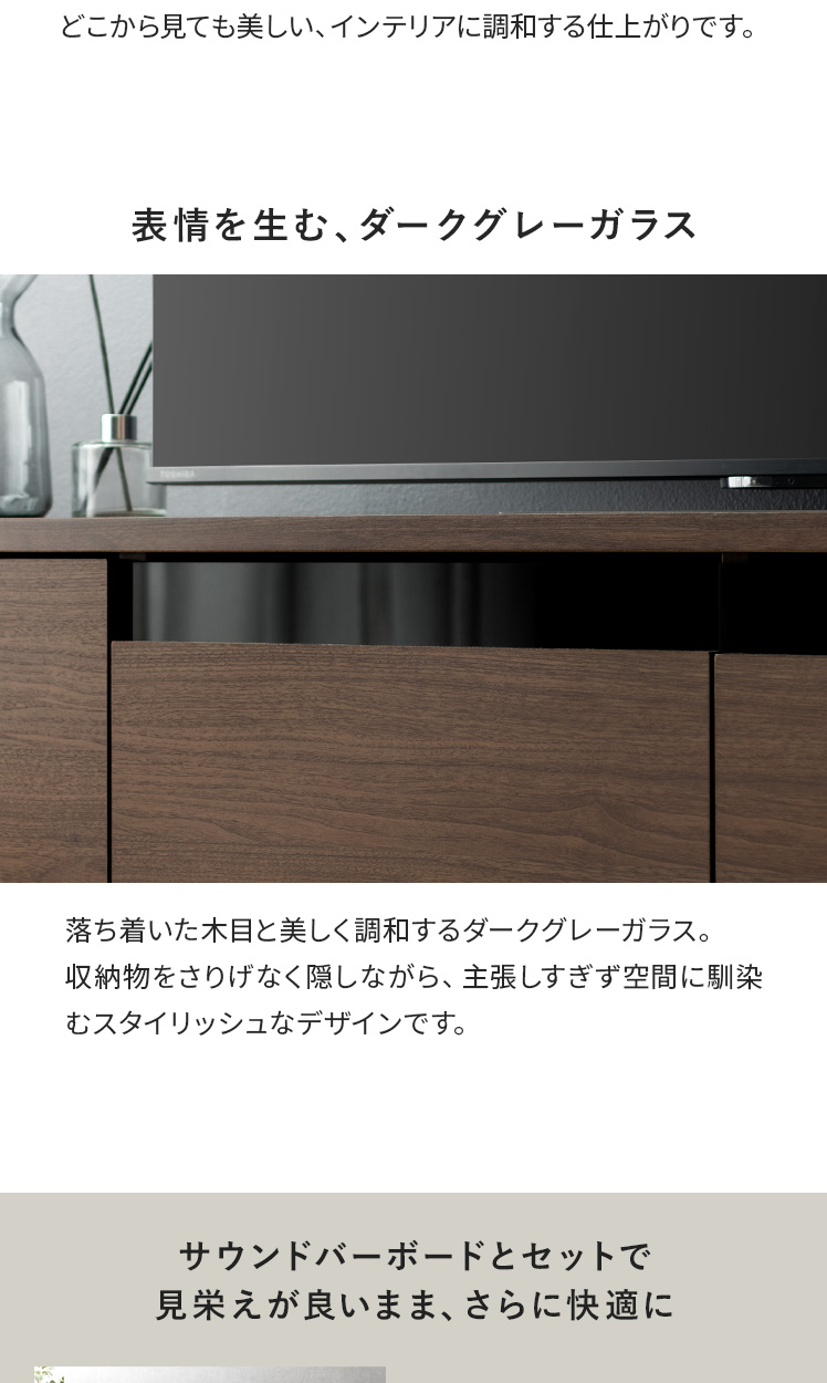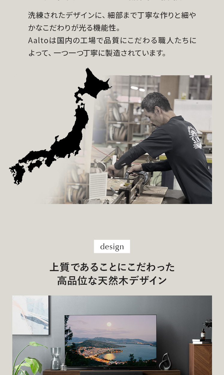テレビボード Aalto linea〔アールト リネア〕 180cm幅 単品販売/洗練されたデザインと高い機能性を備えた日本製TVボード。まるで本物の天然木のような木目調が上質な空間を演出。本体と同素材・同色のサウンドバーボードや、多彩な収納も備え、デザインも使い心地もスマートに。