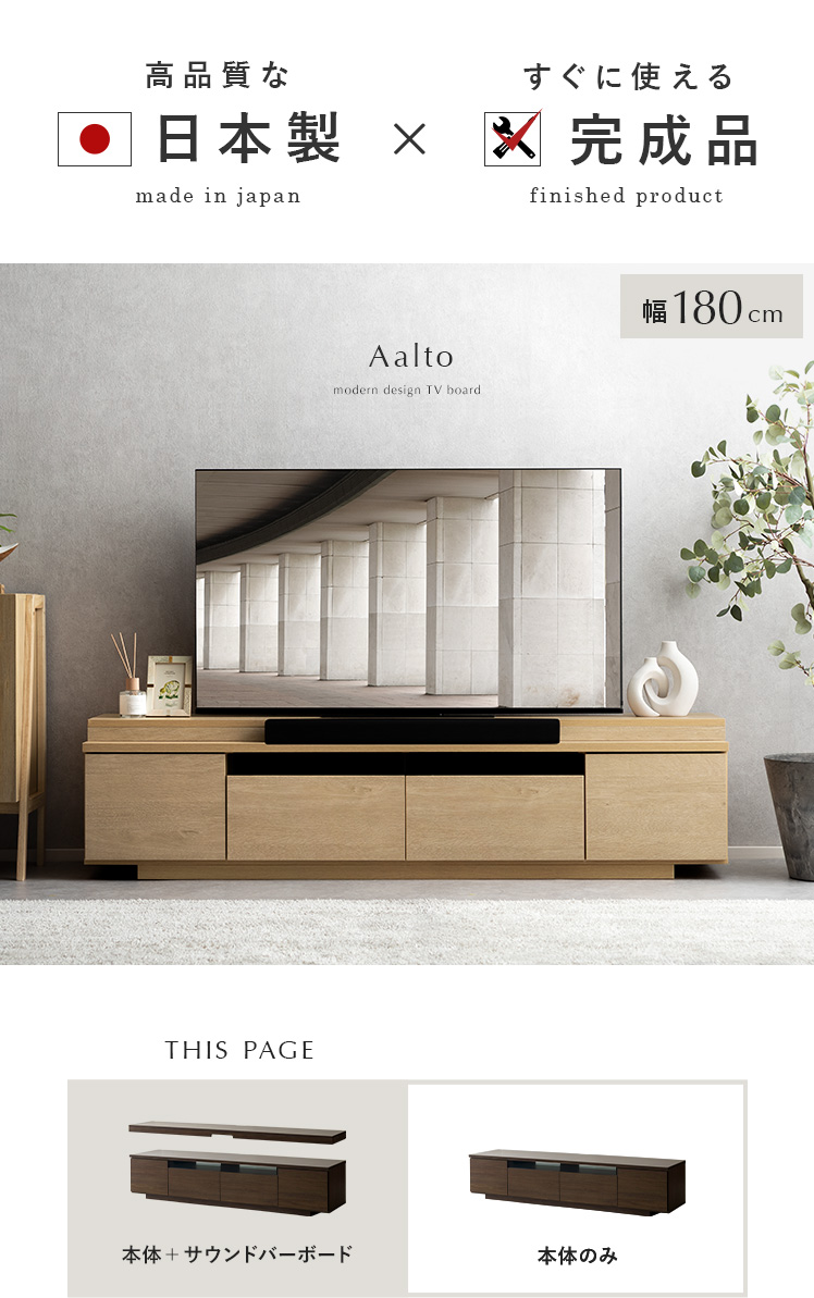 テレビボード+サウンドバーボードセット Aalto linea〔アールト リネア〕 180cm幅 /洗練されたデザインと高い機能性を備えた日本製TVボード。まるで本物の天然木のような木目調が上質な空間を演出。本体と同素材・同色のサウンドバーボードや、多彩な収納も備え、デザインも使い心地もスマートに。