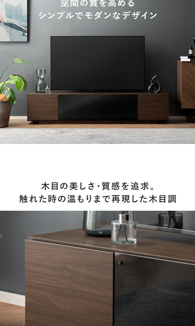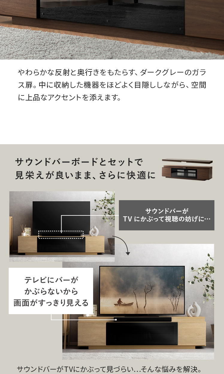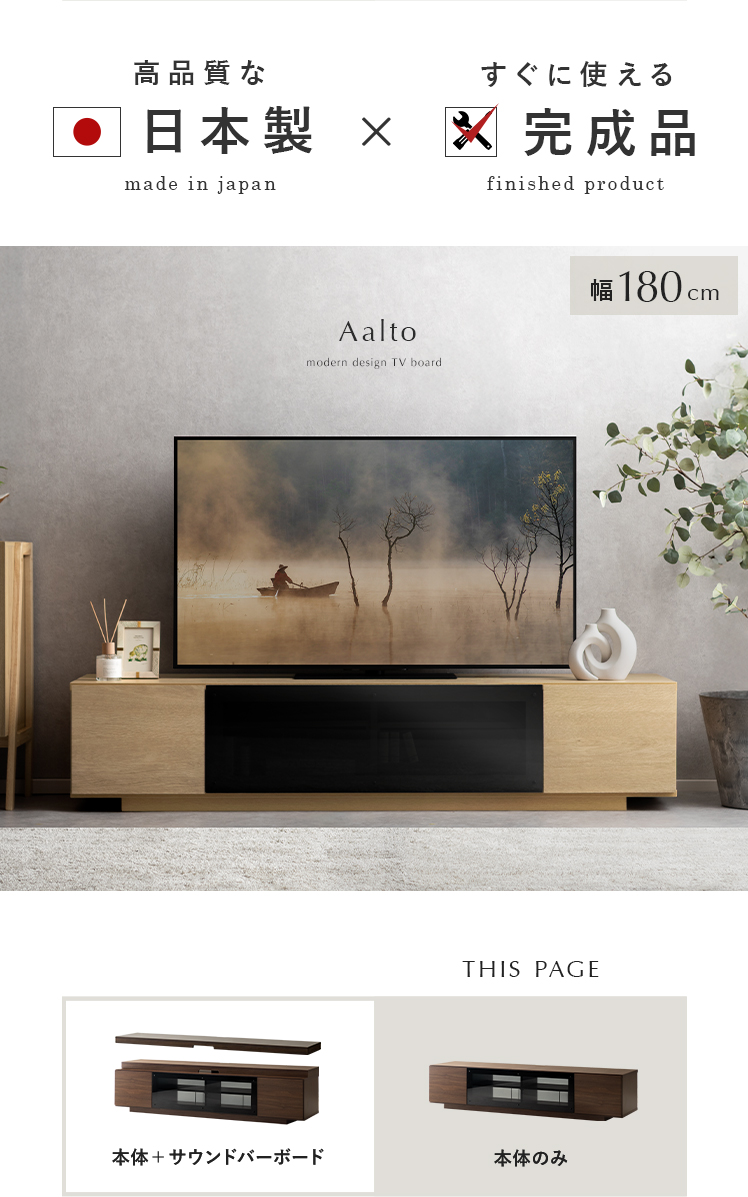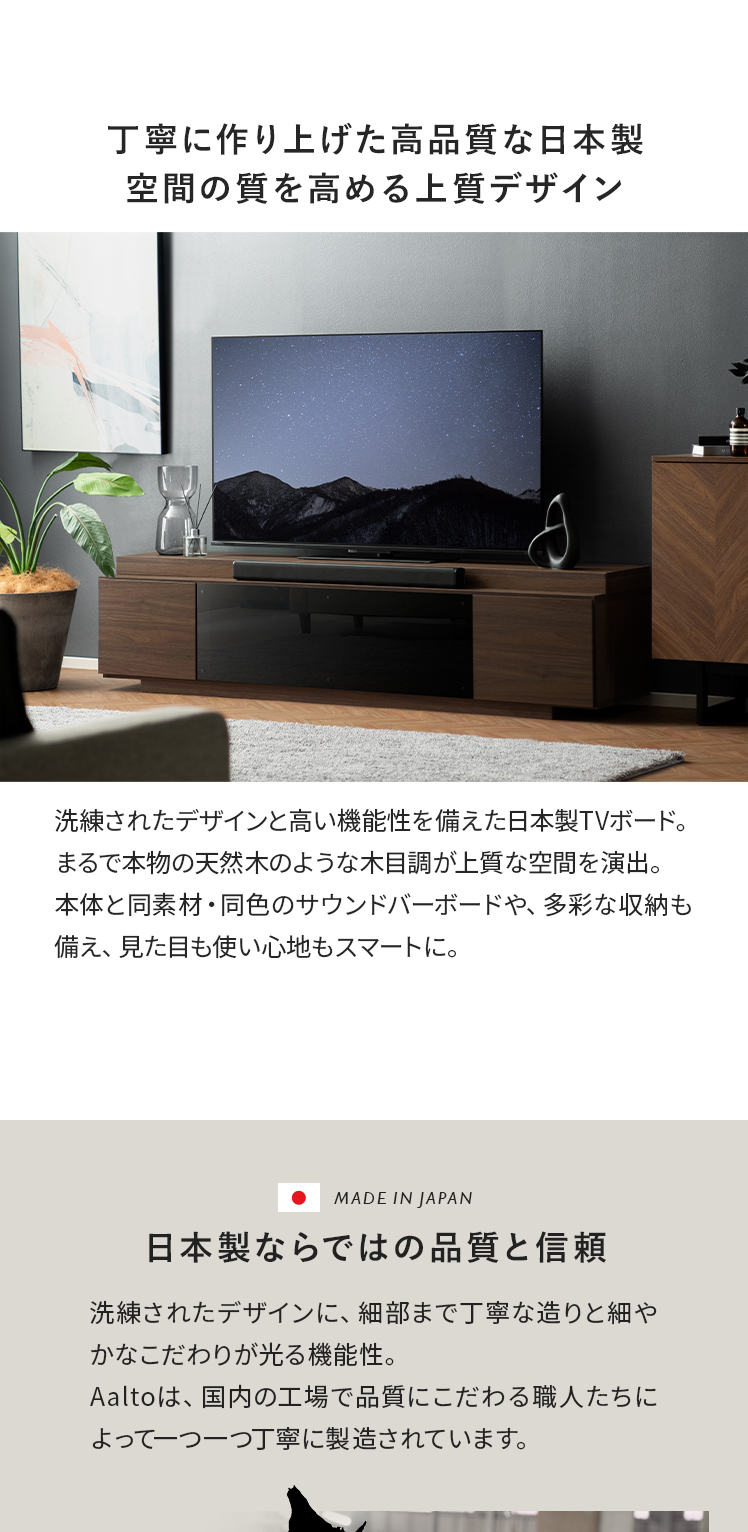 テレビボード Aalto forma〔アールト フォルマ〕 180cm幅 単品販売/洗練されたデザインと高い機能性を備えた日本製TVボード。まるで本物の天然木のような木目調が上質な空間を演出。本体と同素材・同色のサウンドバーボードや、多彩な収納も備え、見た目も使い心地もスマートに。