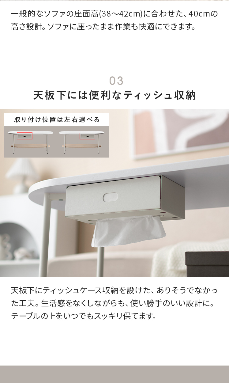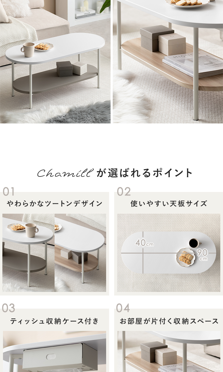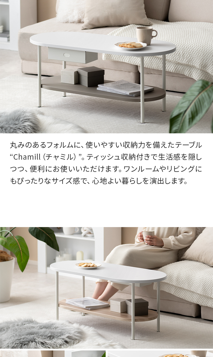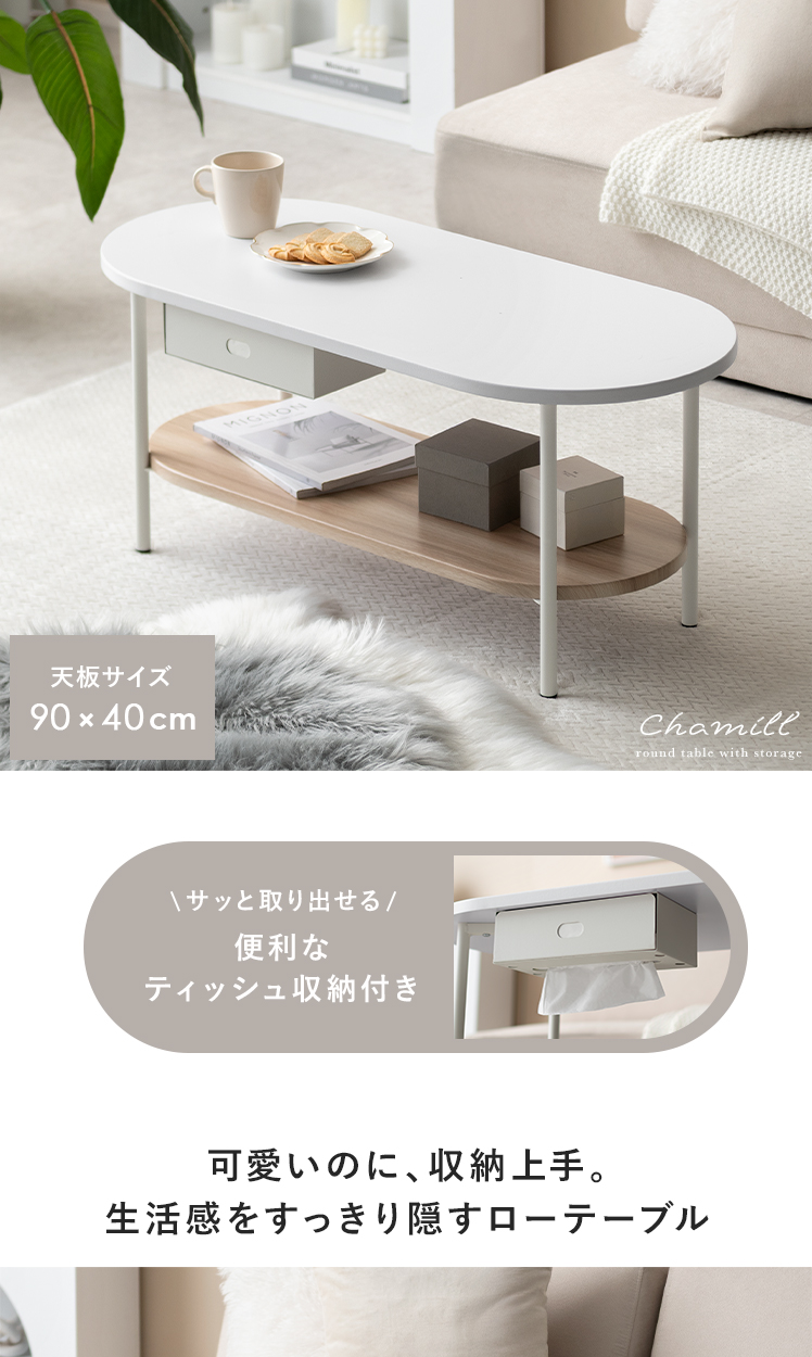 ティッシュ収納付テーブル Chamill〔チャミル〕/丸みのあるフォルムに、使いやすい収納力を備えたテーブル“Chamill(チャミル)”。ティッシュ収納付きで生活感を隠しつつ、便利にお使いいただけます。ワンルームやリビングにもぴったりなサイズ感で、心地よい暮らしを演出します。