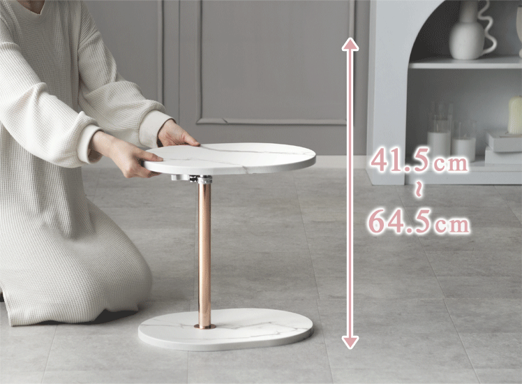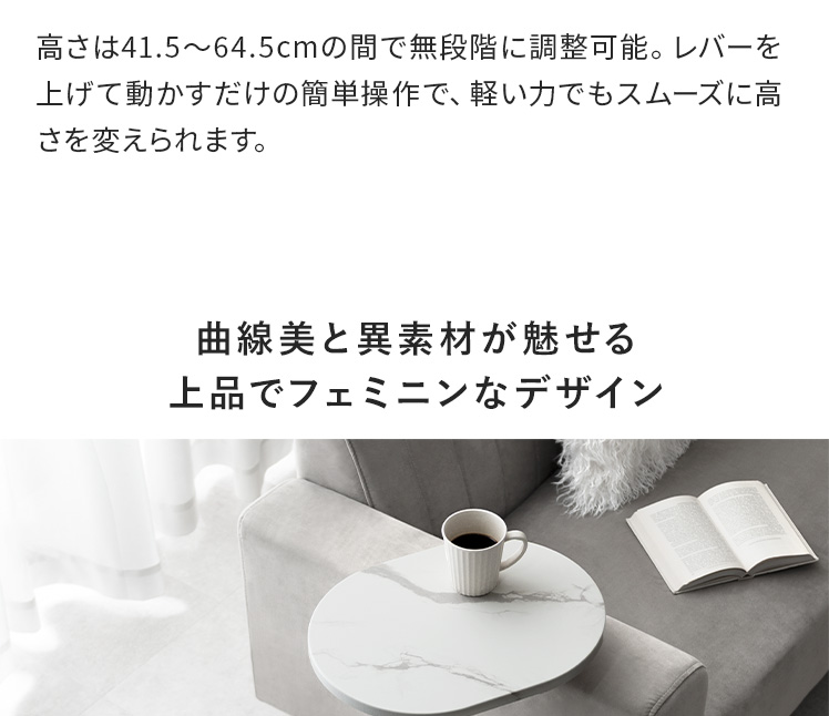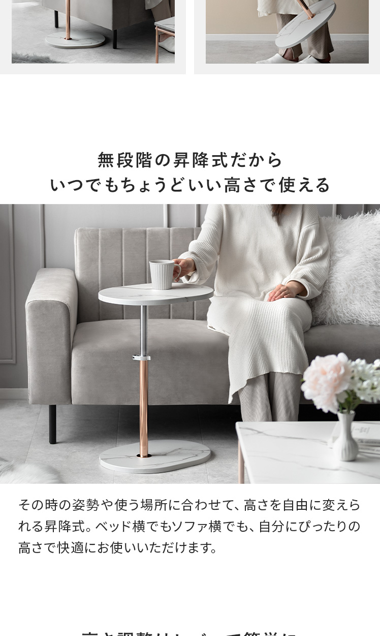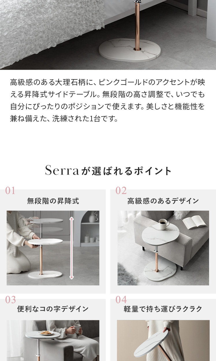 昇降式サイドテーブル Serra〔セラ〕/高級感のある大理石柄に、ピンクゴールドのアクセントが映える昇降式サイドテーブル。無段階の高さ調整で、いつでも自分にぴったりのポジションで使えます。美しさと機能性を兼ね備えた、洗練された1台です。