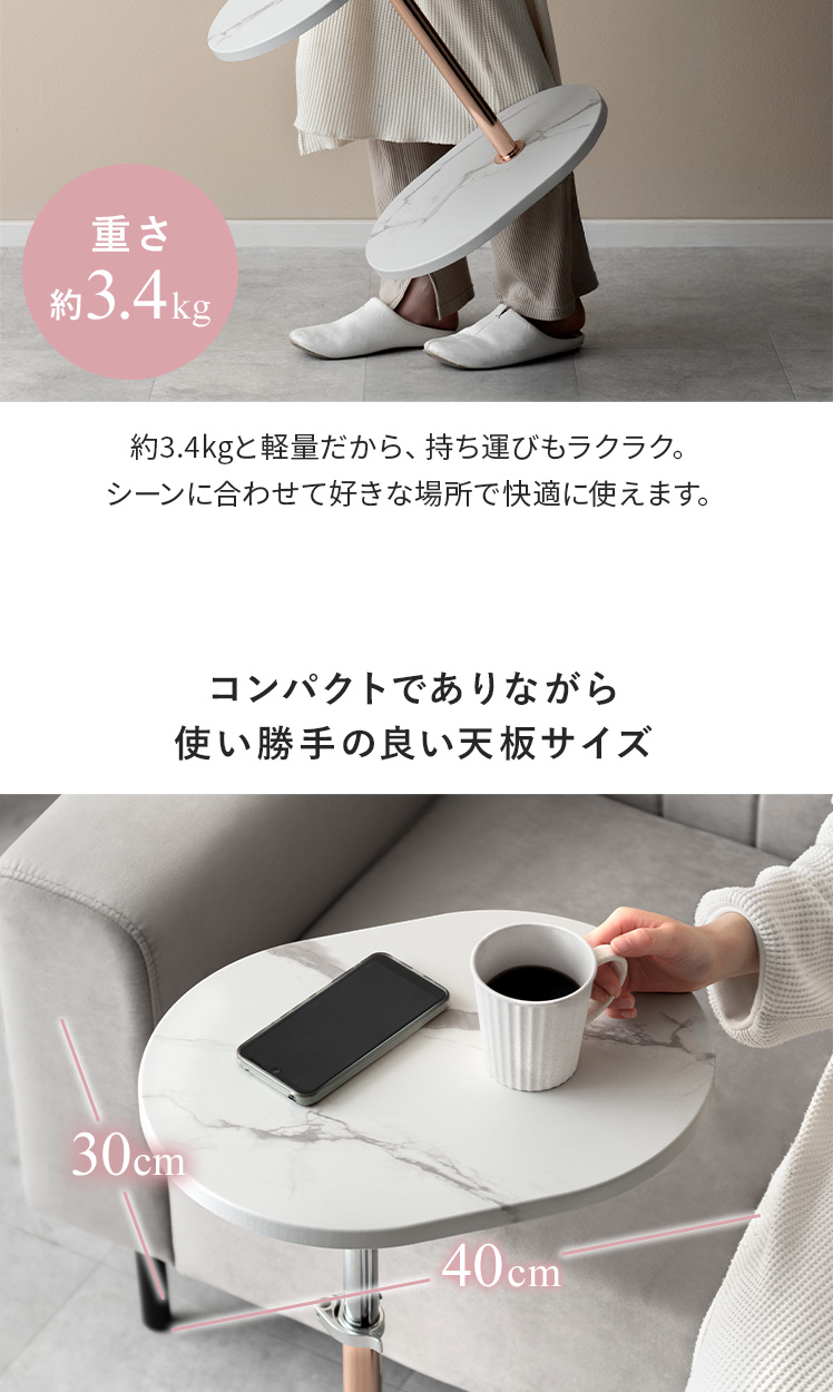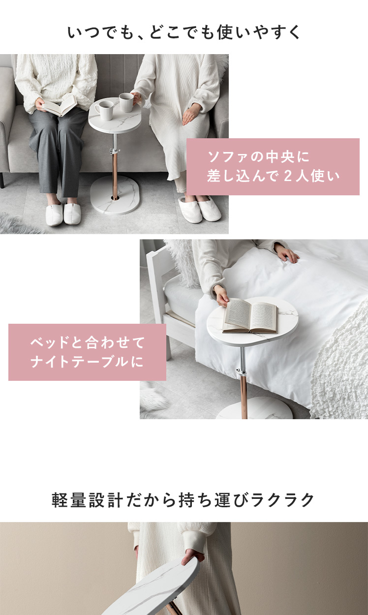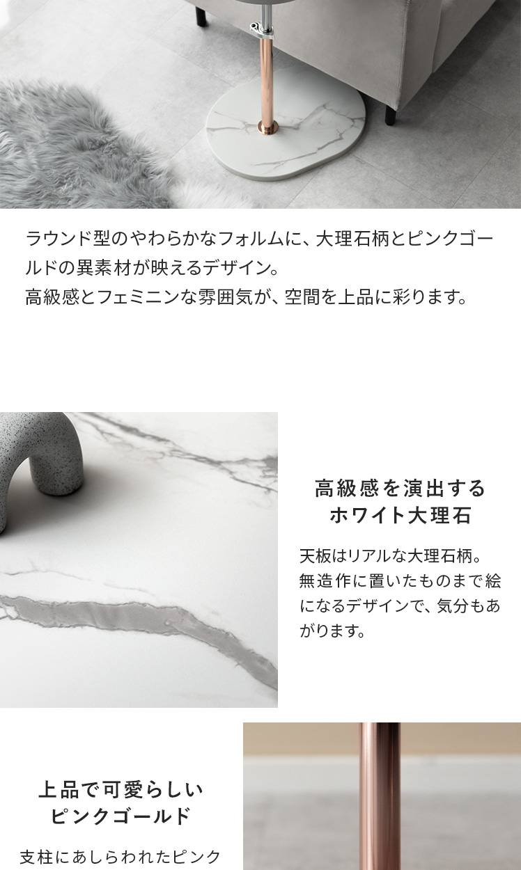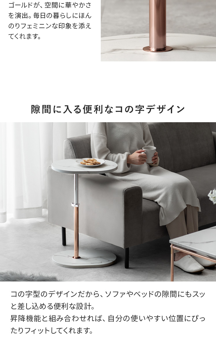 ミニテーブル コーヒーテーブル サブテーブル ナイトテーブル 省スペース ソファ横 コの字 ベッドサイド 昇降式 無段階昇降 高さ調整 ピンクゴールド 大理石調 シンプル モダン フェミニン ホワイト