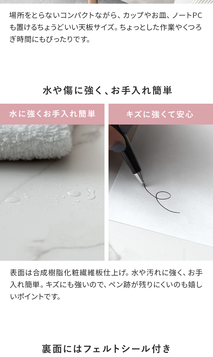| 材質 | 天板/合成樹脂化粧繊維板(塩化ビニル樹脂) フレーム/スチール(メッキ加工) |
