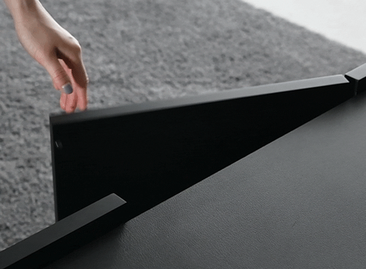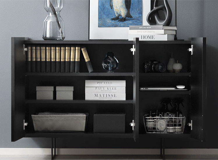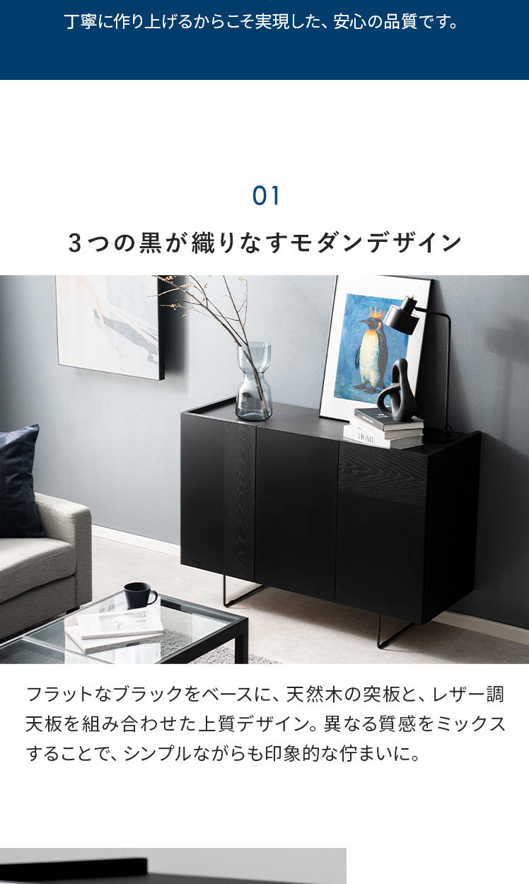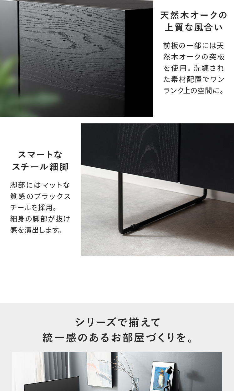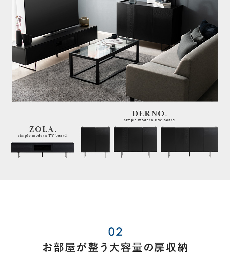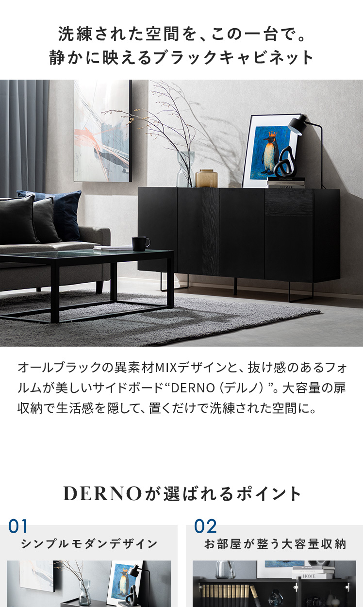 モダンサイドボード DERNO〔デルノ〕幅150cmタイプ/オールブラックの異素材MIXデザインと、抜け感のあるフォルムが美しいサイドボード“DERNO(デルノ)”。大容量の扉収納で生活感を隠して、置くだけで洗練された空間に。