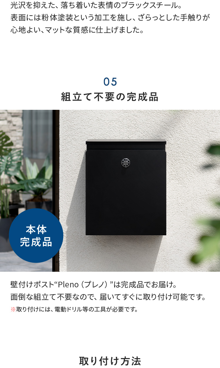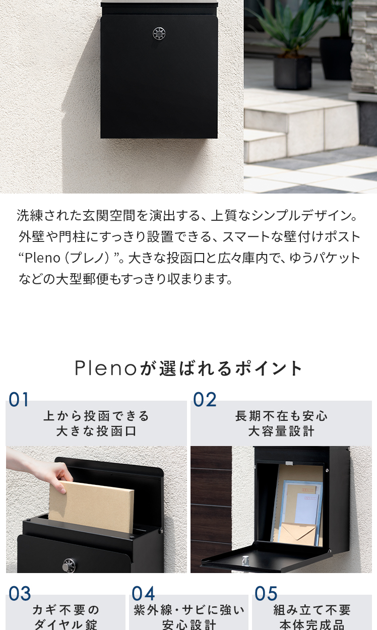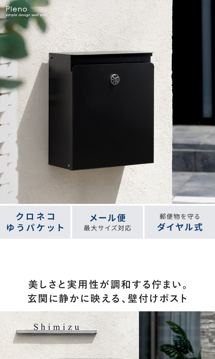 壁付けポスト Pleno〔プレノ〕/洗練された玄関空間を演出する、上質なシンプルデザイン。外壁や門柱にすっきり設置できる、スマートな壁付けポスト“Pleno(プレノ)”。大きな投函口と広々庫内で、ゆうパケットなどの大型郵便もすっきり収まります。