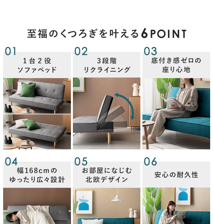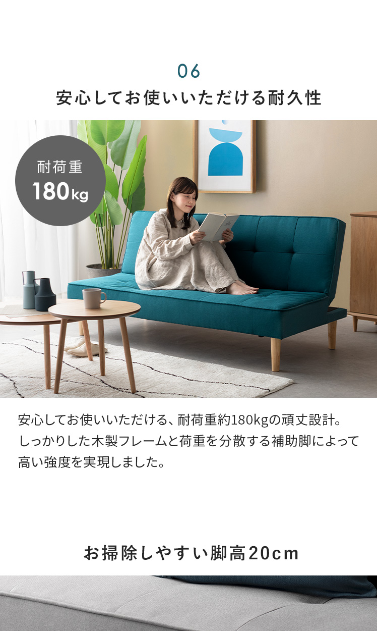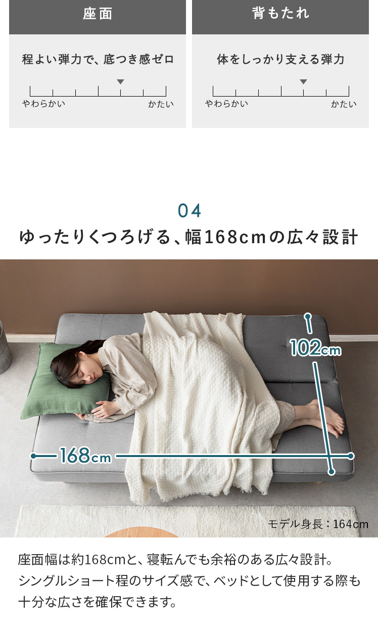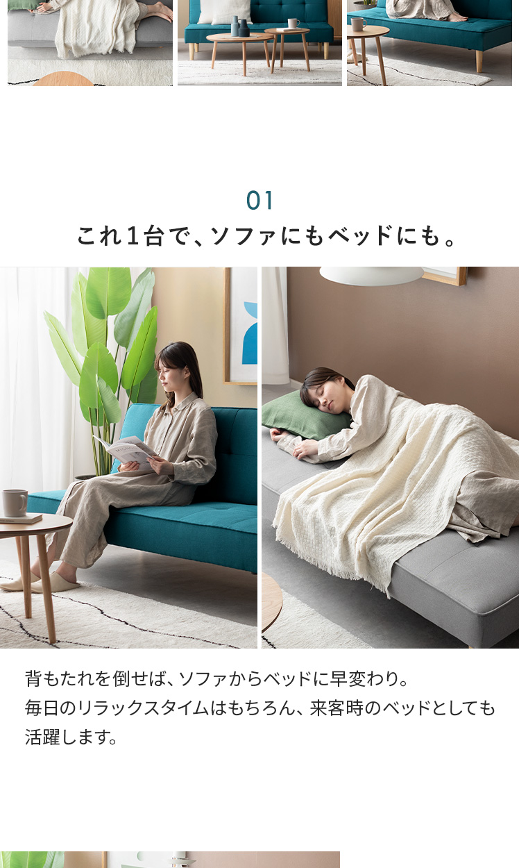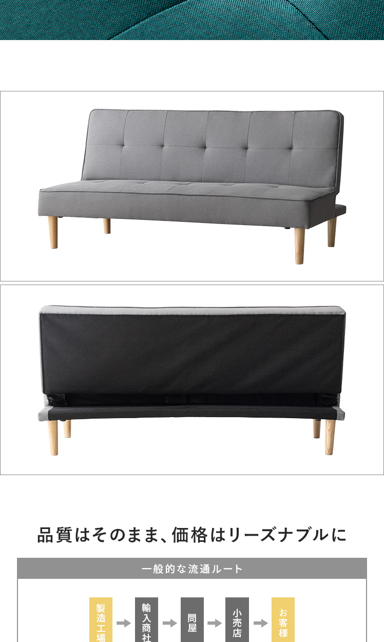| 備考 | 組立式(組立て時間約5分) ※ソファーベッドは商品構造上、背もたれを倒してベッドとして使用する際、背もたれ側の端に体重をかけると不安定になる場合がございます。 ご使用の際は、壁面設置を推奨しております。 ※若干の個体差により、表記サイズと多少の差異が生じる場合がございます。 |