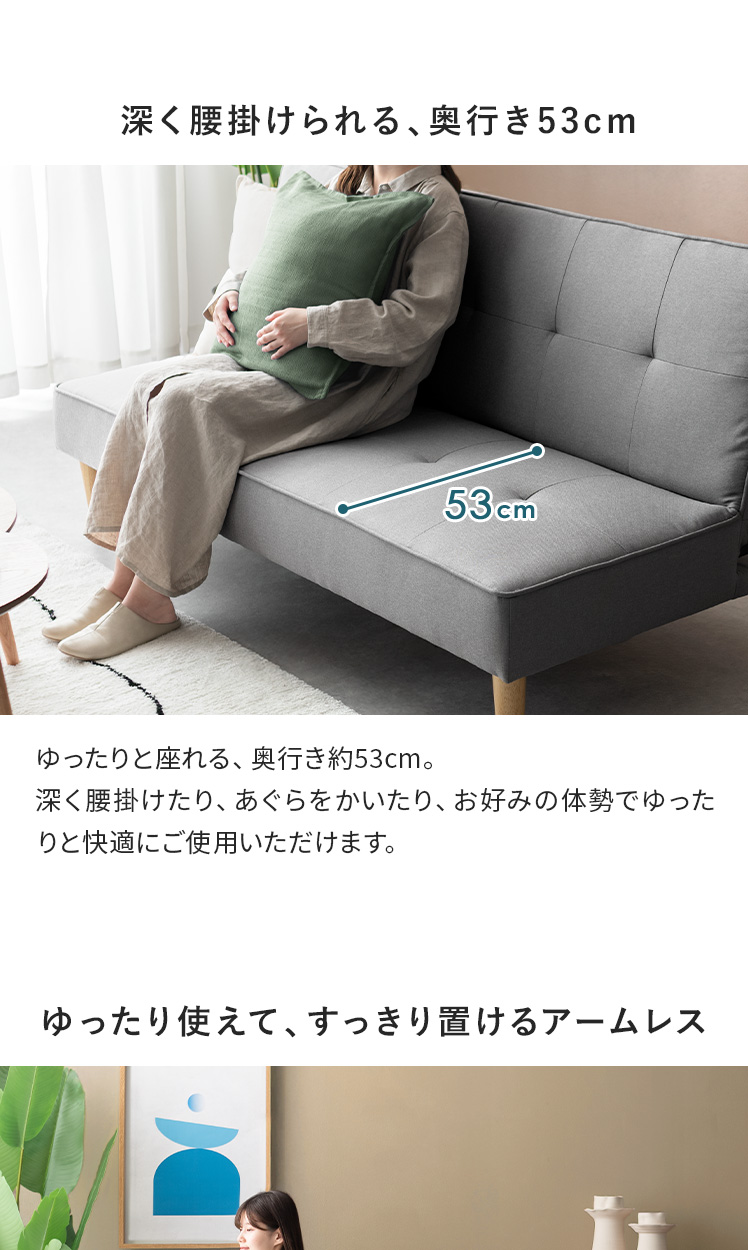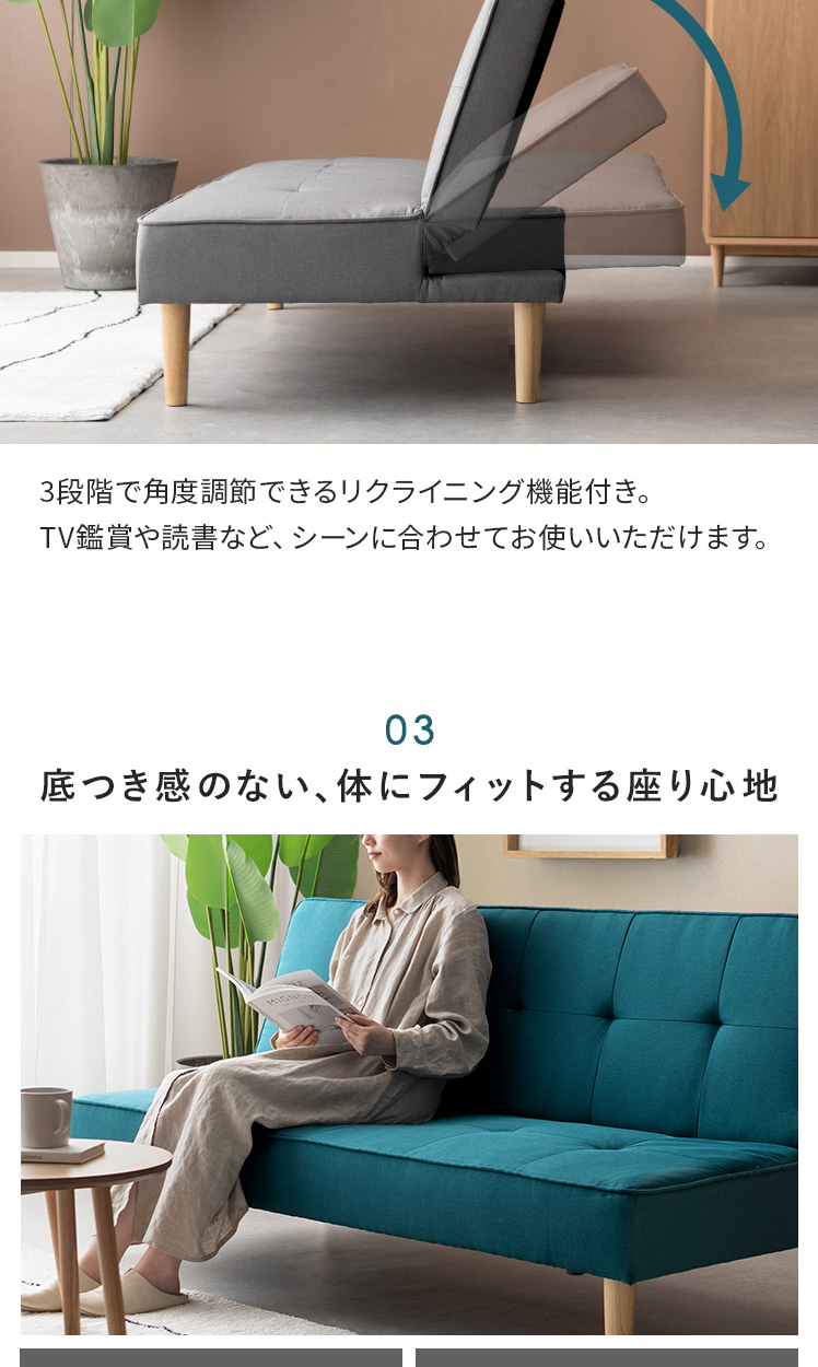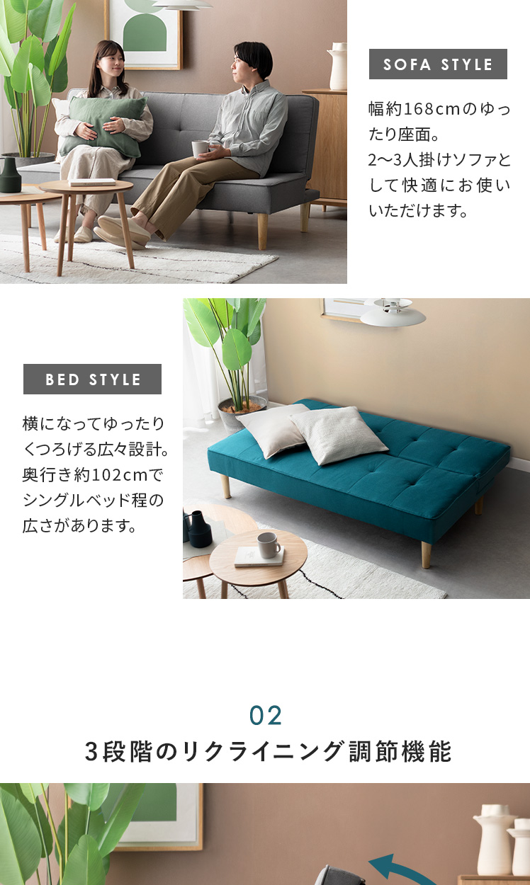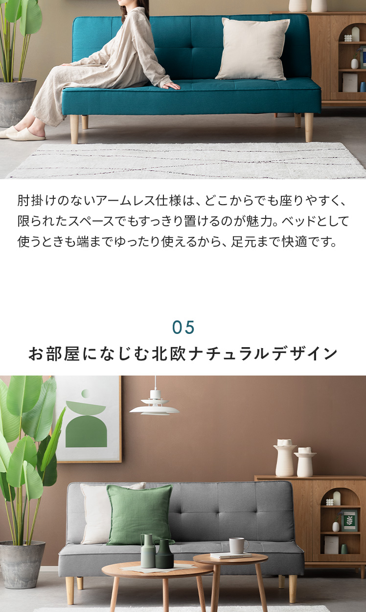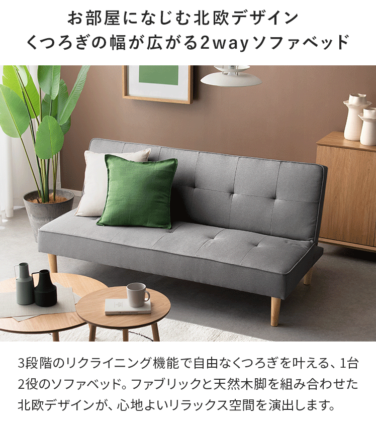 2way アームレス 3段階リクライニング 北欧デザイン 木製脚 奥行102cmシングルベッド程度 ファブリック