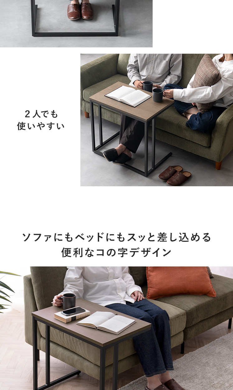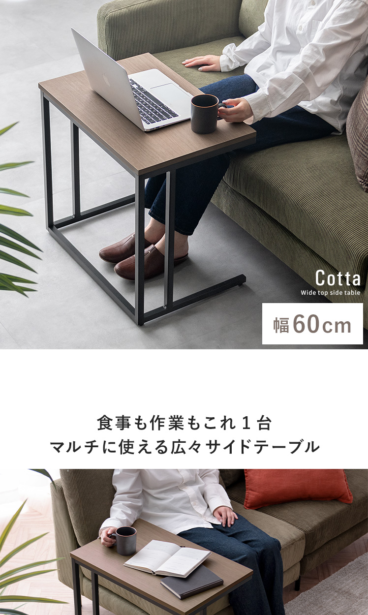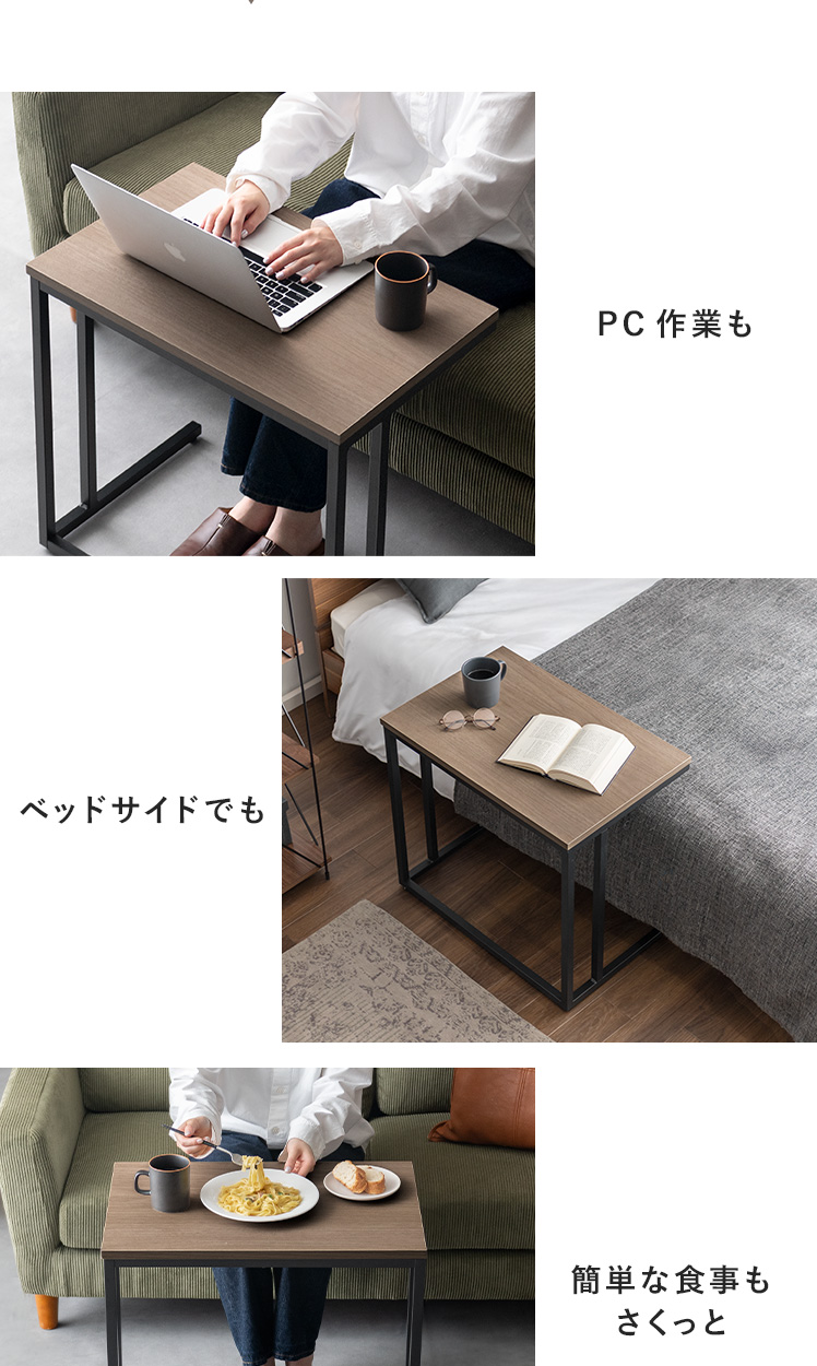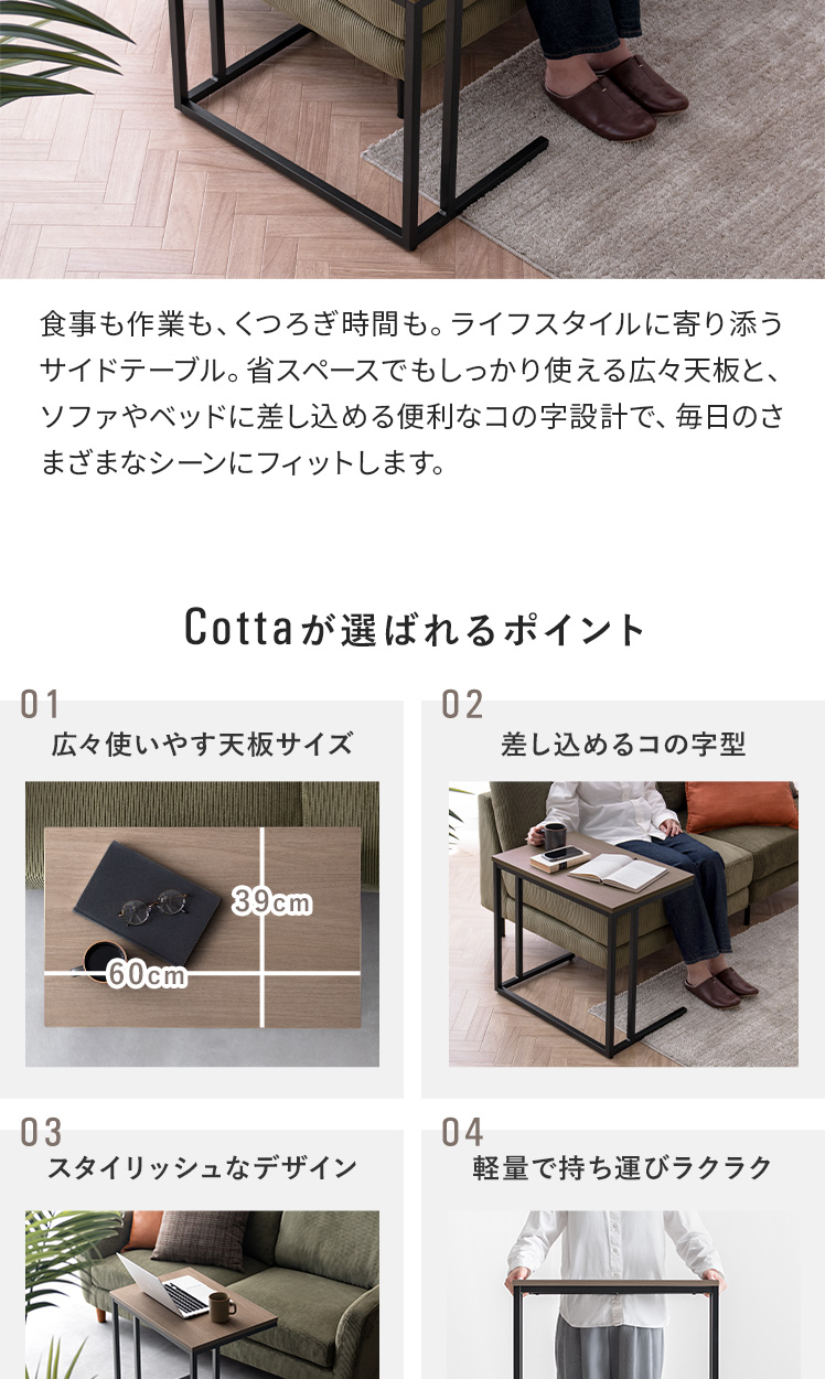 コの字サイドテーブル Cotta〔コッタ〕/食事も作業も、くつろぎ時間も。ライフスタイルに寄り添うサイドテーブル。省スペースでもしっかり使える広々天板と、ソファやベッドに差し込める便利なコの字設計で、毎日のさまざまなシーンにフィットします。