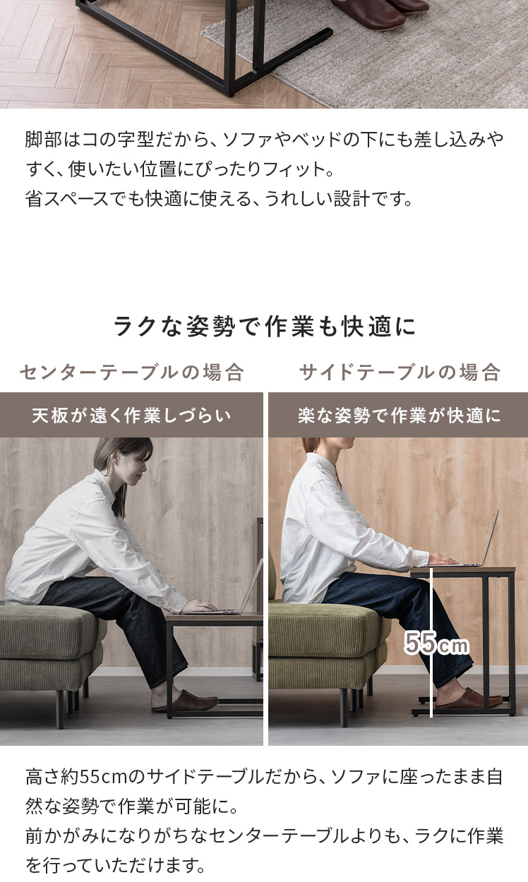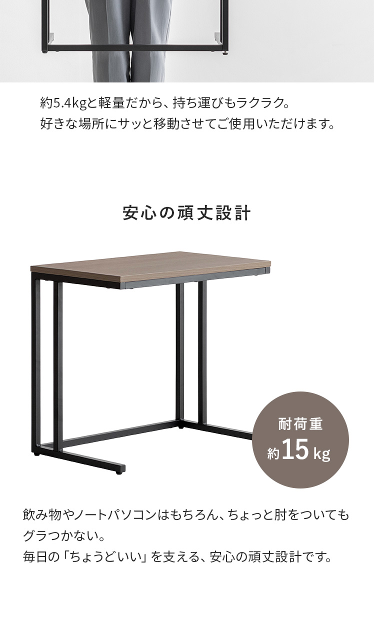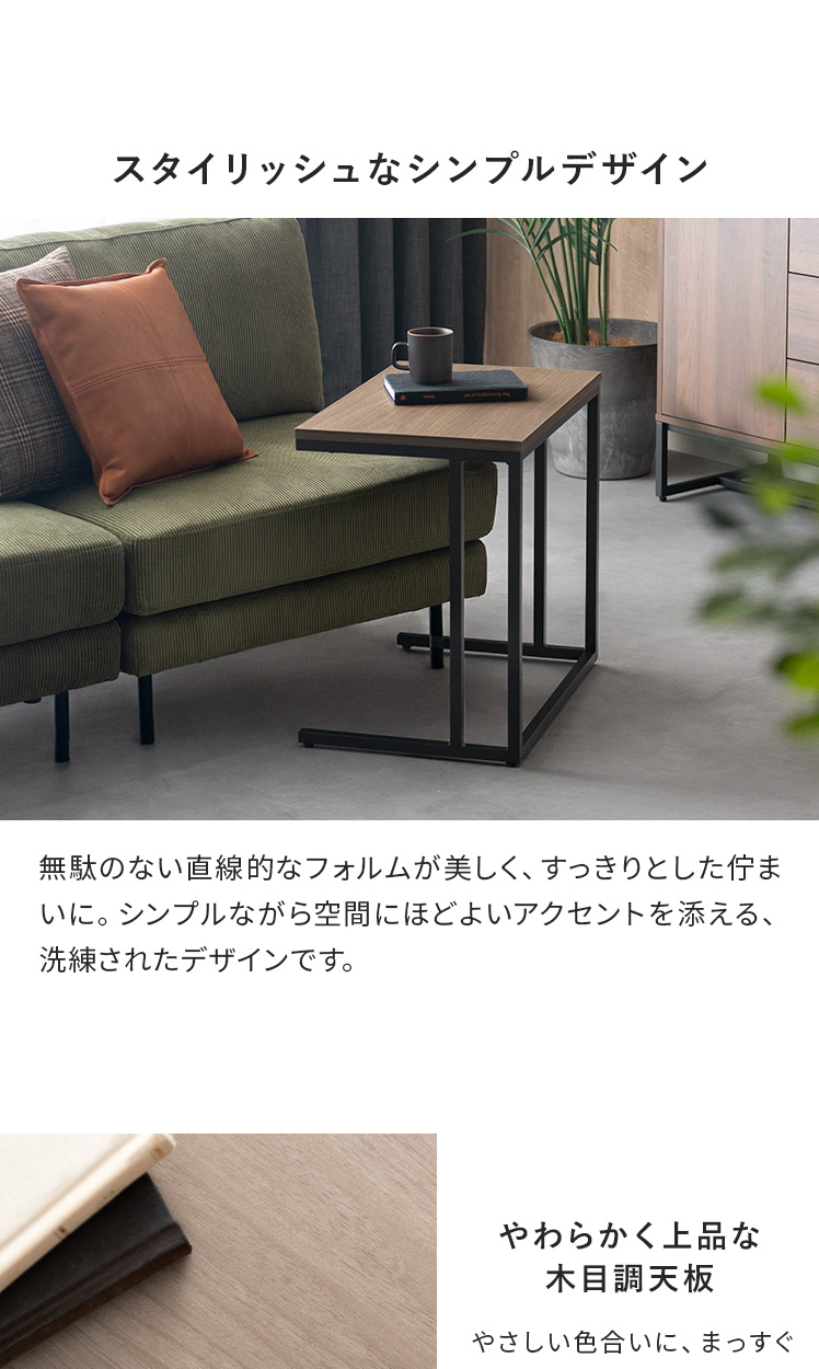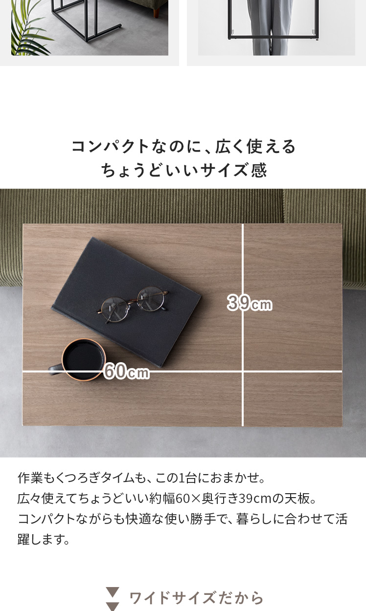 コの字サイドテーブル Cotta〔コッタ〕/食事も作業も、くつろぎ時間も。ライフスタイルに寄り添うサイドテーブル。省スペースでもしっかり使える広々天板と、ソファやベッドに差し込める便利なコの字設計で、毎日のさまざまなシーンにフィットします。