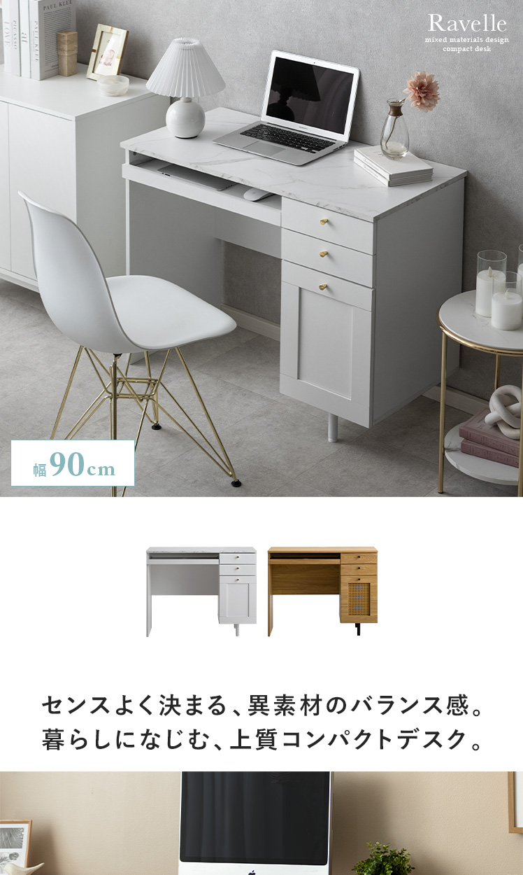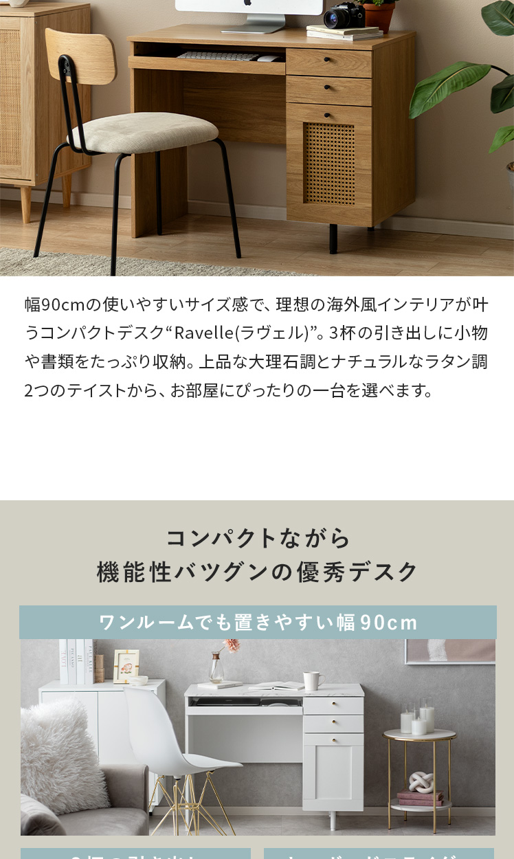 選べる2素材デスク Ravelle〔ラヴェル〕/幅90cmの使いやすいサイズ感で、理想の海外風インテリアが叶うコンパクトデスク“Ravelle(ラヴェル)”。3杯の引き出しに小物や書類をたっぷり収納。上品な大理石調とナチュラルなラタン調2つのテイストから、お部屋にぴったりの一台を選べます。