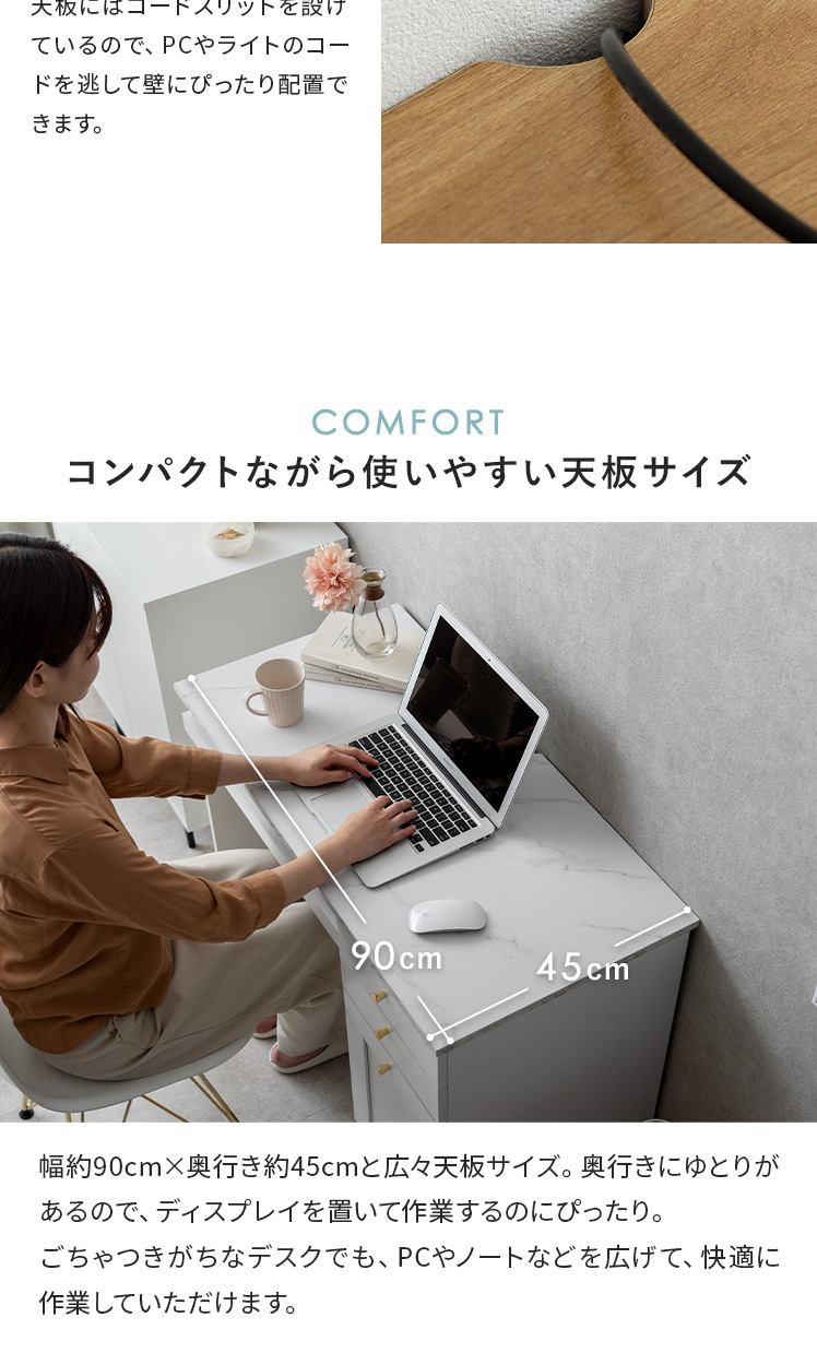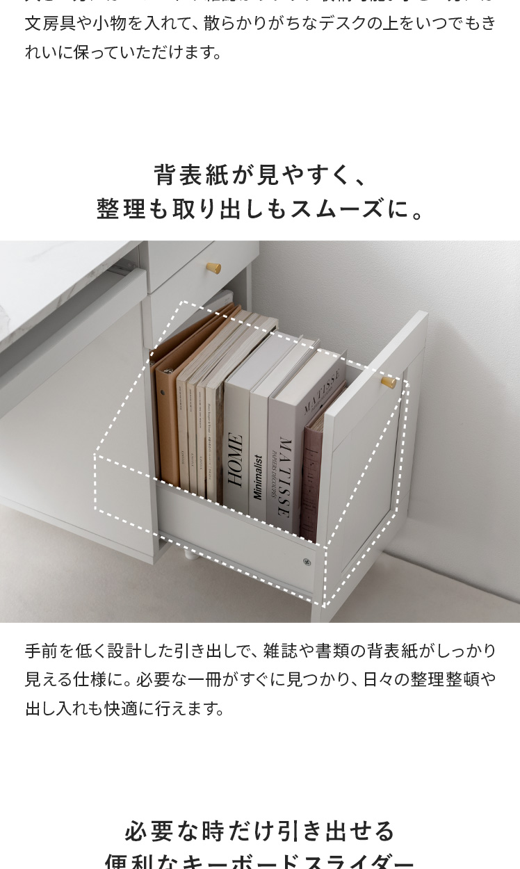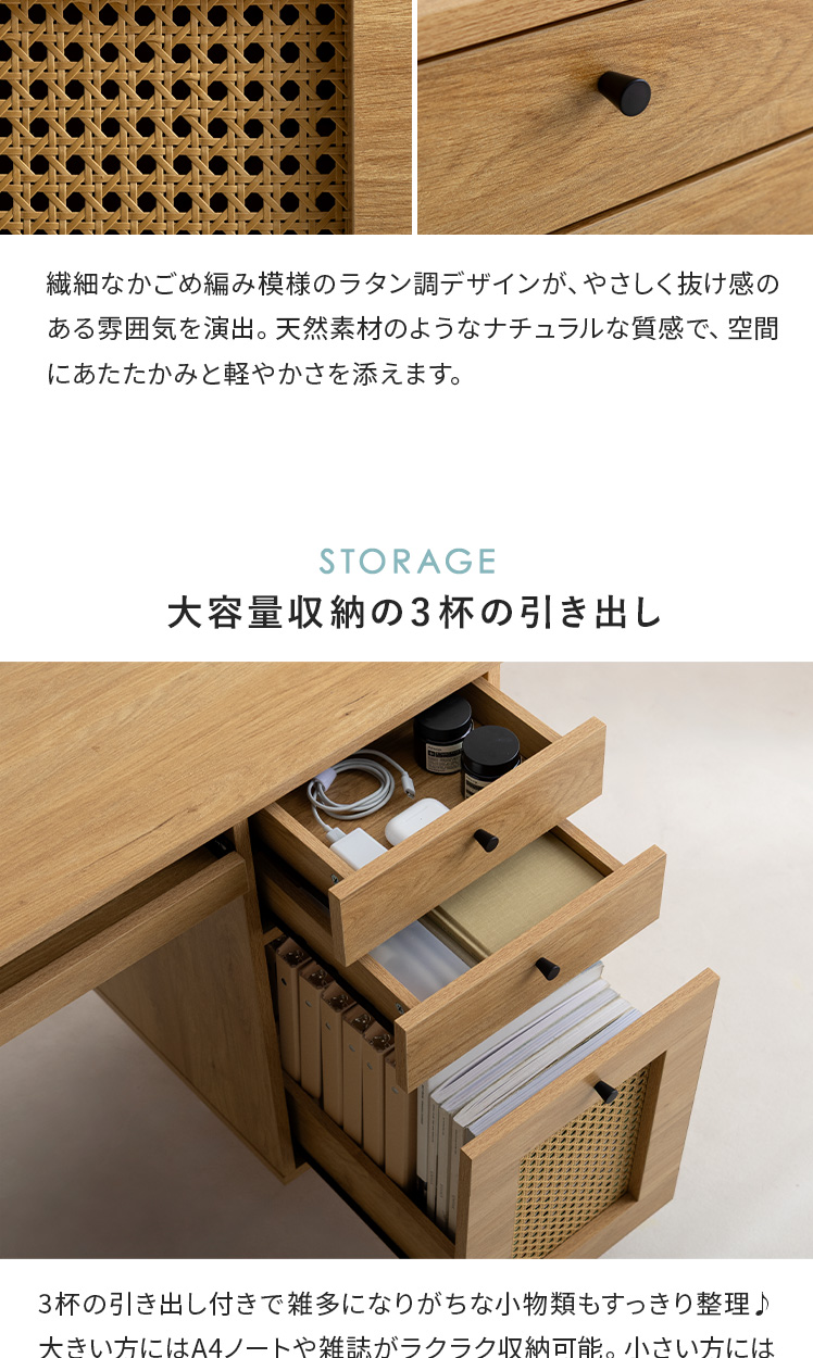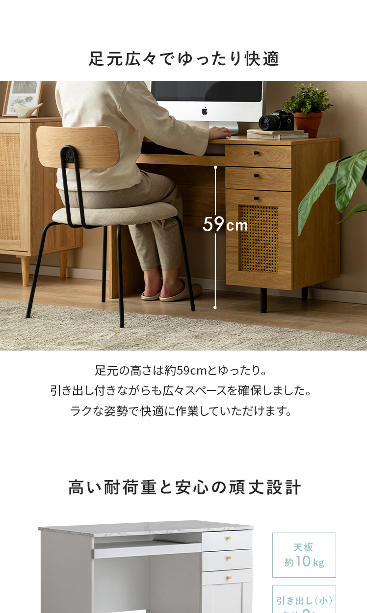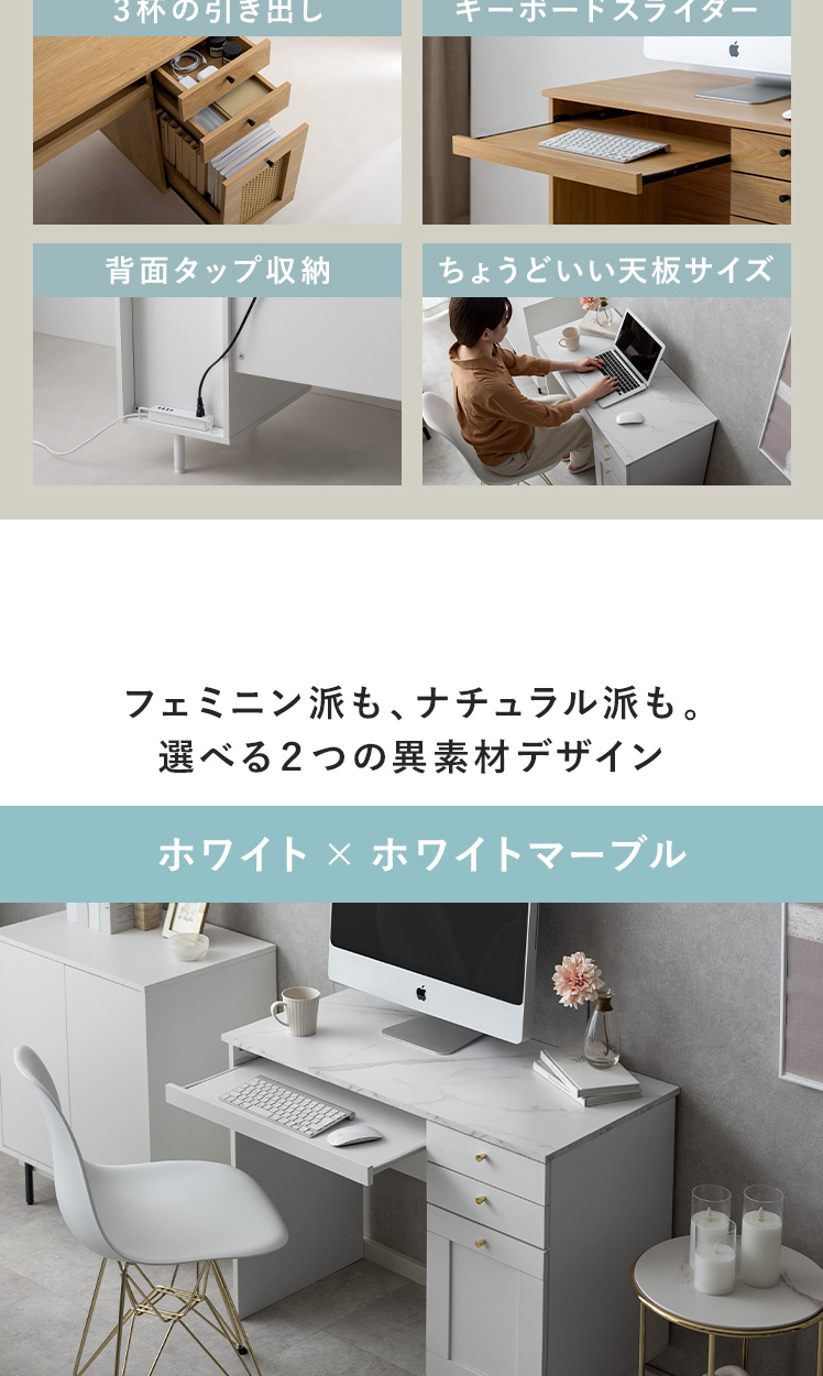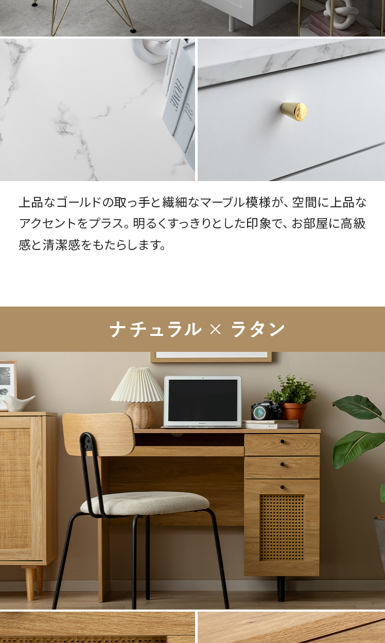 大理石調 or ラタン 海外風インテリア 3杯引き出し キーボードスライダー 収納付き 背面収納 アジャスター スライド天板 おしゃれ ホワイト ナチュラル【5%OFFクーポン対象|公式なら毎日お得】