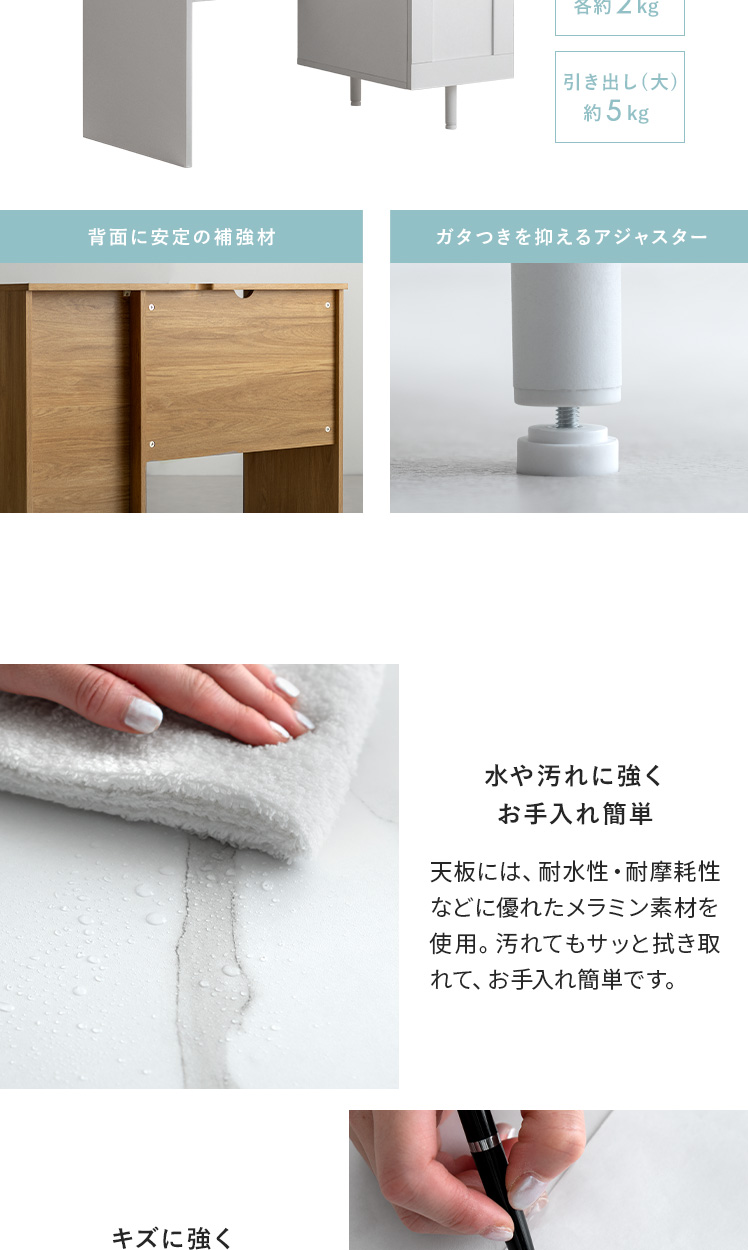 | 耐荷重 | 天板/約10kg、スライド天板/約2kg、引出し(大)/約5kg、引出し(小)/約2kg |