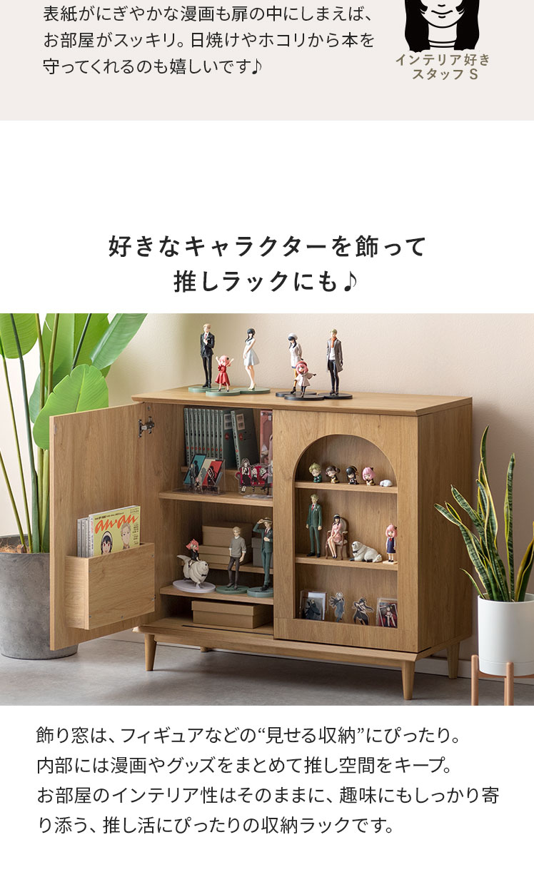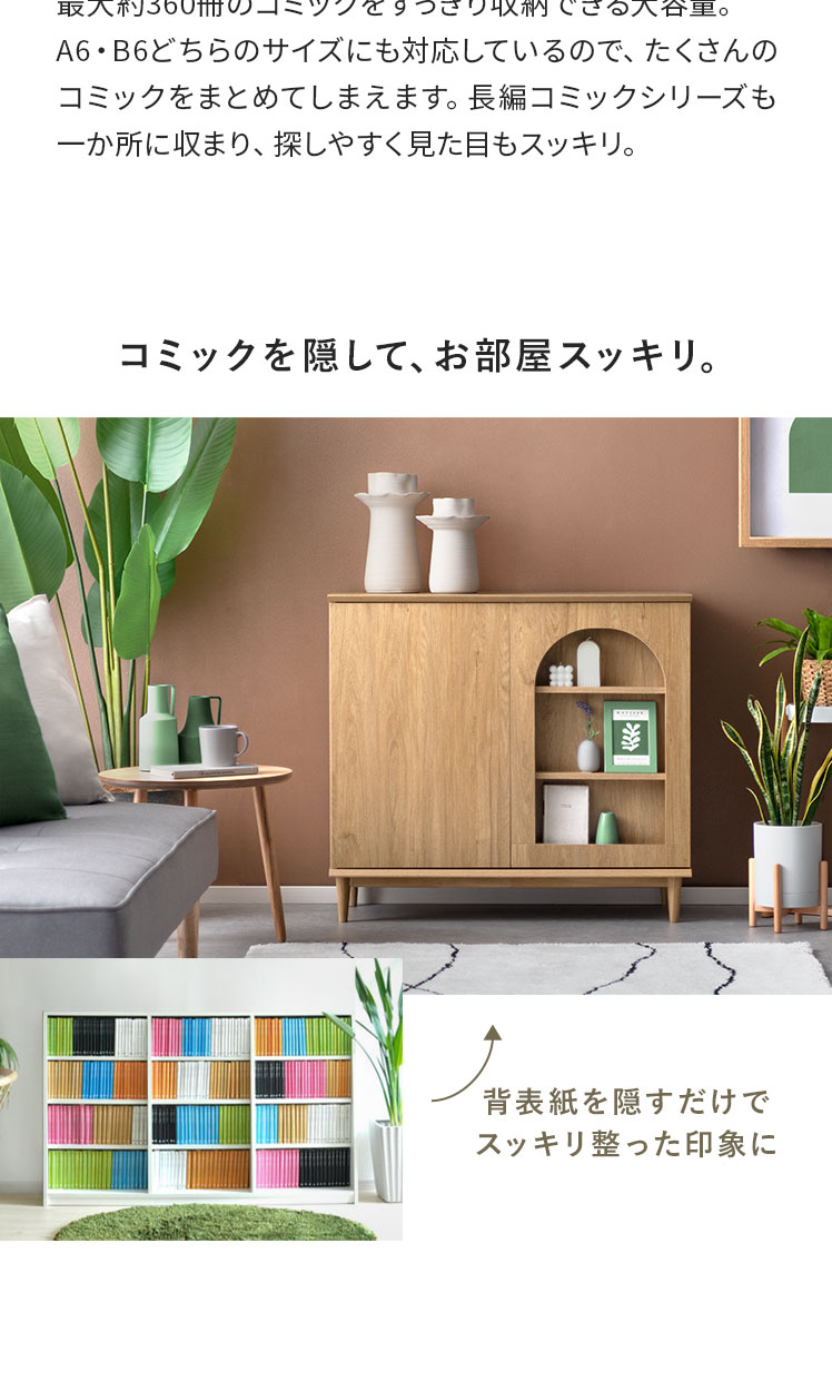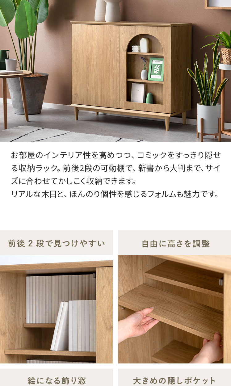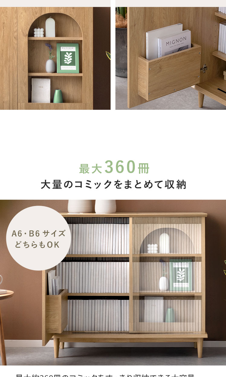 本棚 収納家具 コミックラック コミック最大360冊 スライド扉 可動棚 アーチ窓 サイドボード 扉収納 多目的ラック フリーラック 整理棚 飾り窓 推し活 木目調 ブックラック シンプル ナチュラル インテリア モダン 〇【5%OFFクーポン対象|公式なら毎日お得】