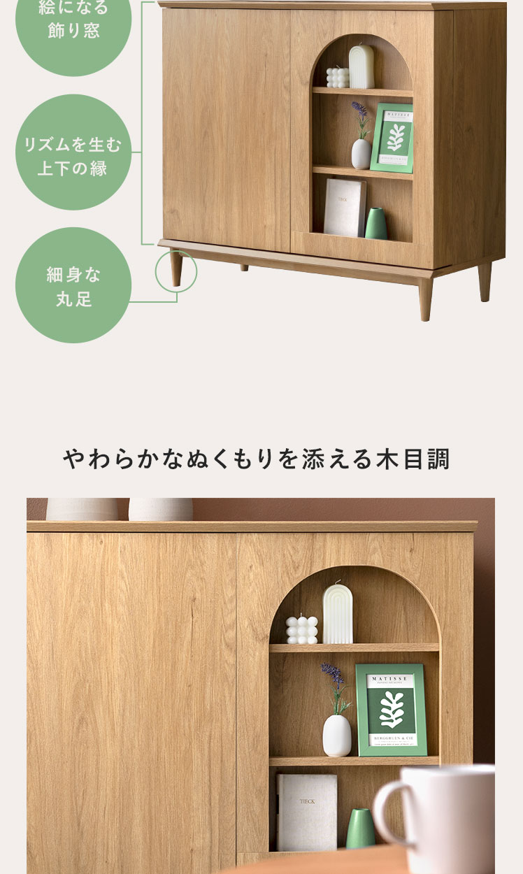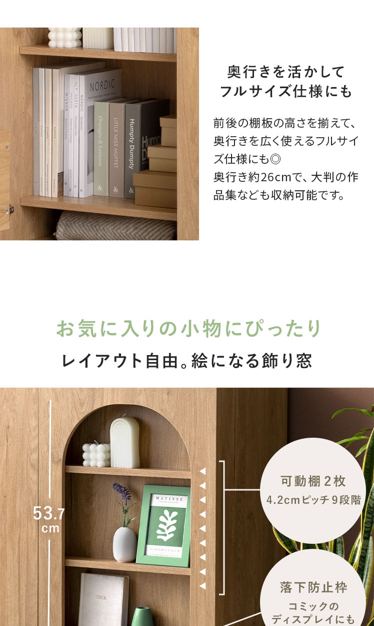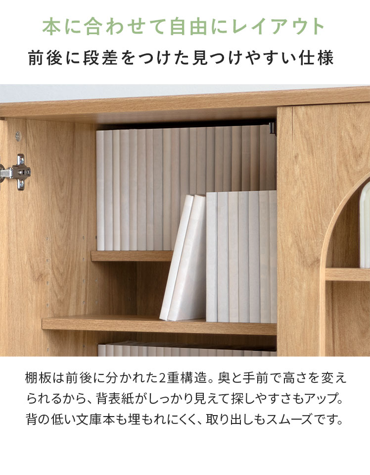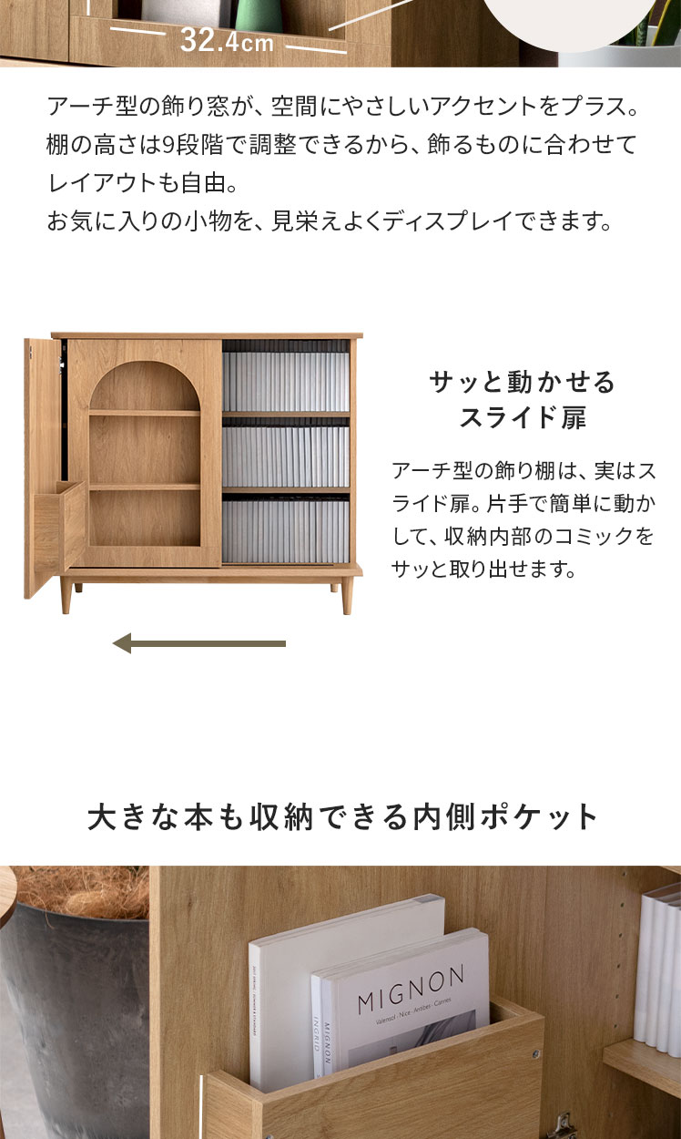 本棚 収納家具 コミックラック コミック最大360冊 スライド扉 可動棚 アーチ窓 サイドボード 扉収納 多目的ラック フリーラック 整理棚 飾り窓 推し活 木目調 ブックラック シンプル ナチュラル インテリア モダン 〇【5%OFFクーポン対象|公式なら毎日お得】