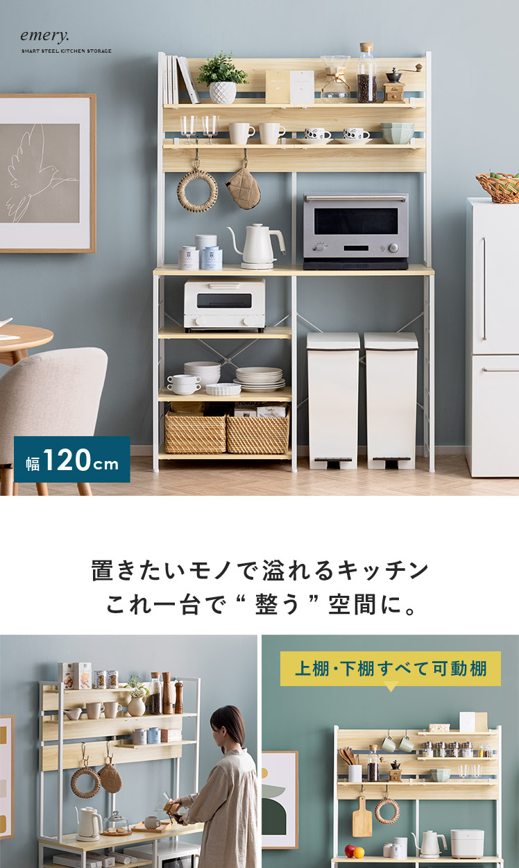 ゴミ箱収納キッチンカウンター emery〔エメリー〕 120cm幅 ハイタイプ/『レンジ、炊飯器、トースターなど置きたい家電がいっぱい』『ゴミ箱が場所をとる』などキッチンの狭さ問題を全て解消♪自由な棚板レイアウトで置きたいモノが一台にまとまるから、キッチンの見た目も、家事の導線もスッキリ整います。
