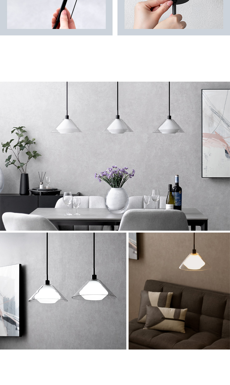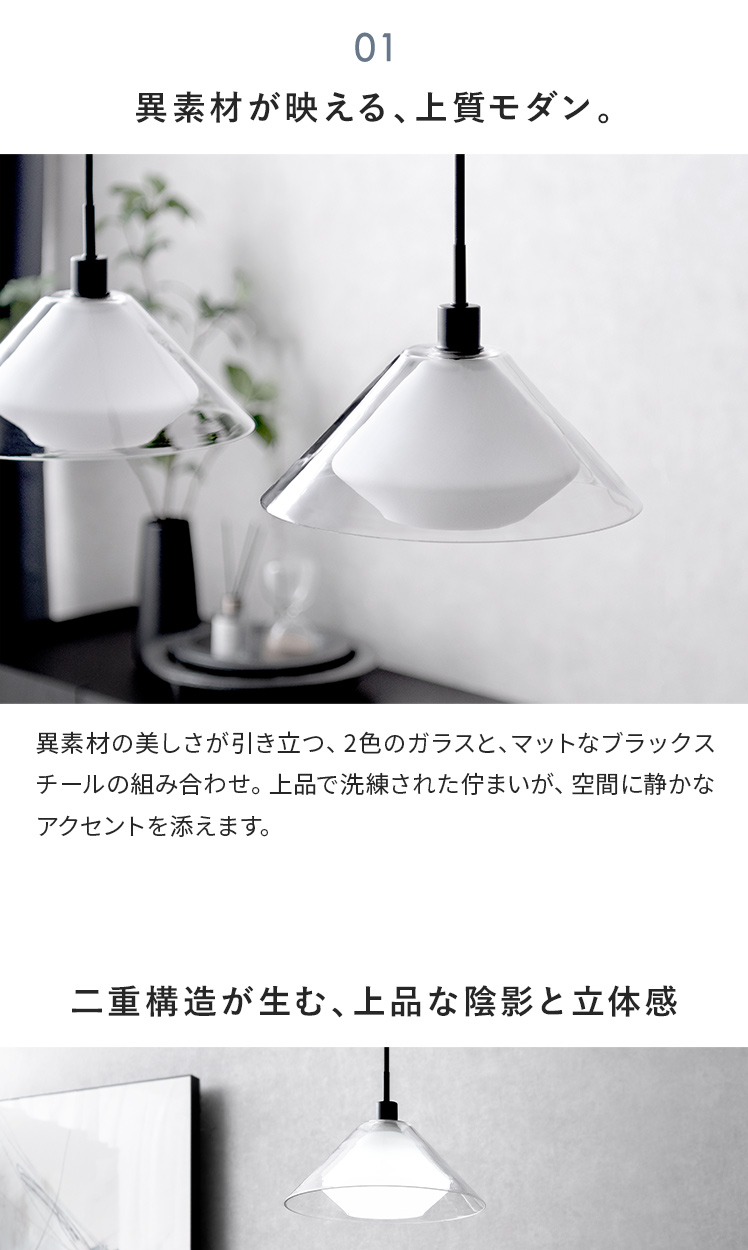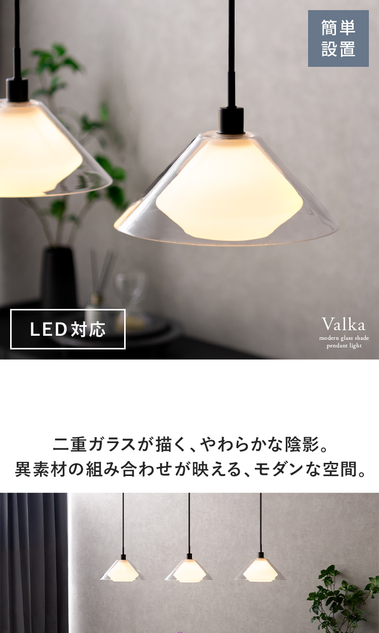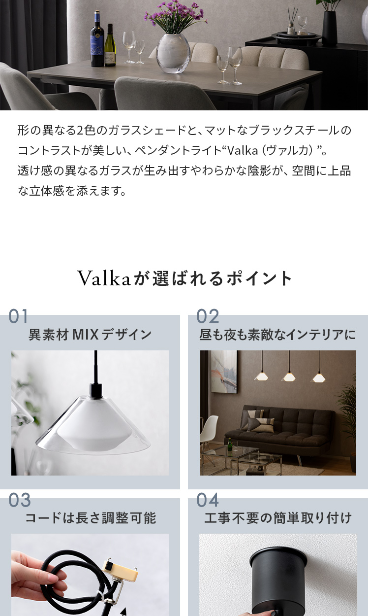 1灯ガラスペンダントライト Valka〔ヴァルカ〕/形の異なる2色のガラスシェードと、マットなブラックスチールのコントラストが美しい、ペンダントライト“Valka(ヴァルカ)”。透け感の異なるガラスが生み出すやわらかな陰影が、空間に上品な立体感を添えます。