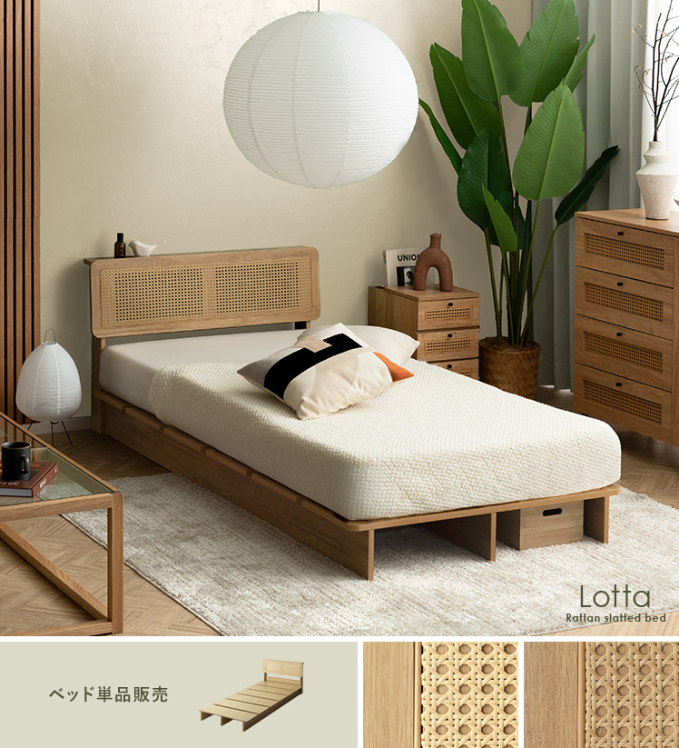 ヘッドボード付きラタン調すのこベッド Lotta〔ロッタ〕/ラタン調ヘッドボードの軽やかな抜け感が、心地よいリラックス空間をつくる、すのこベッド“Lotta(ロッタ)”。小物を置いたり、スマホを立てかけたりできる便利な宮棚付きで、お部屋を美しく快適に整えます。