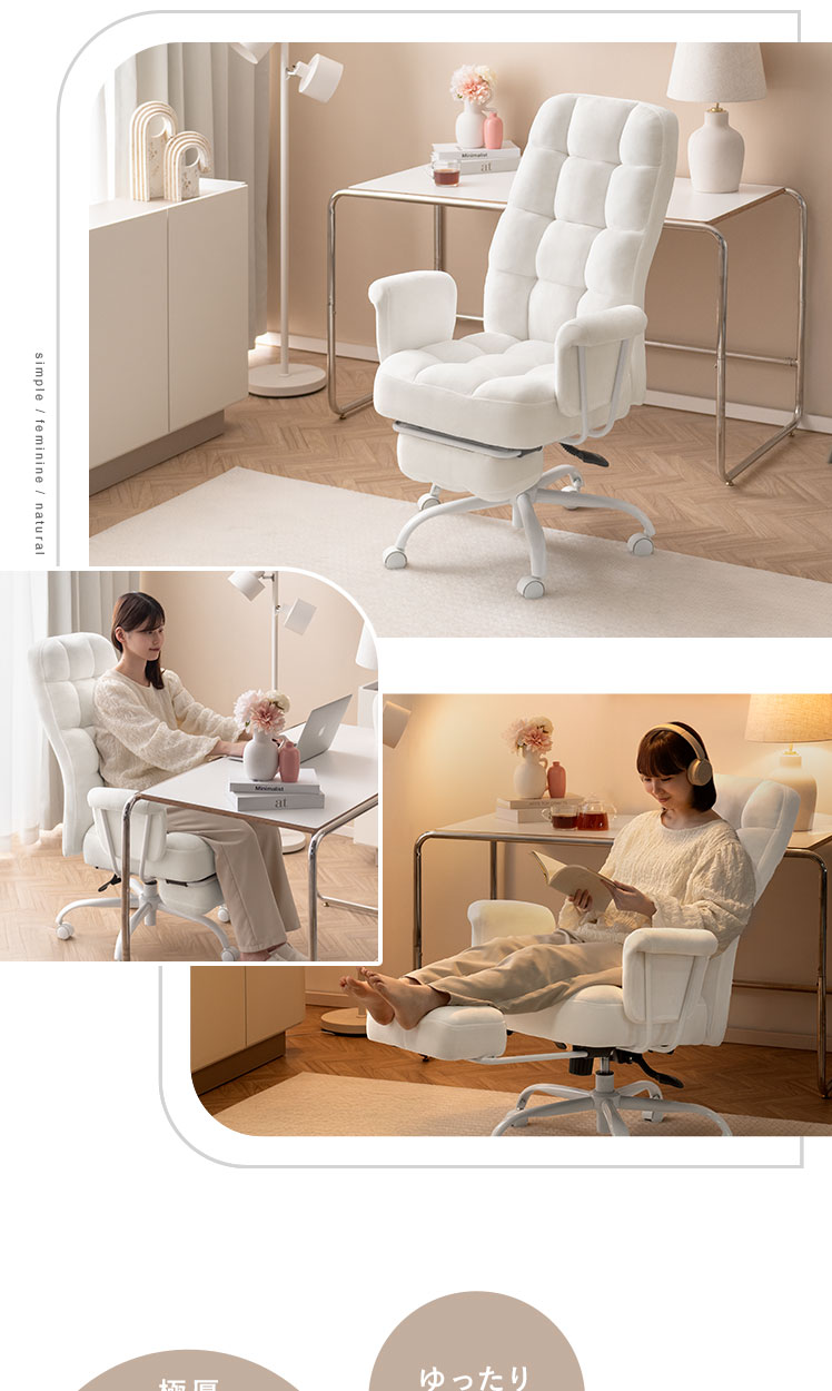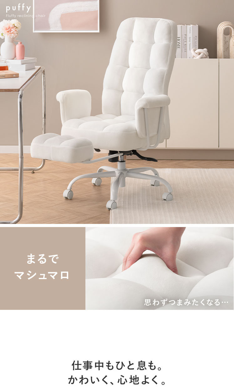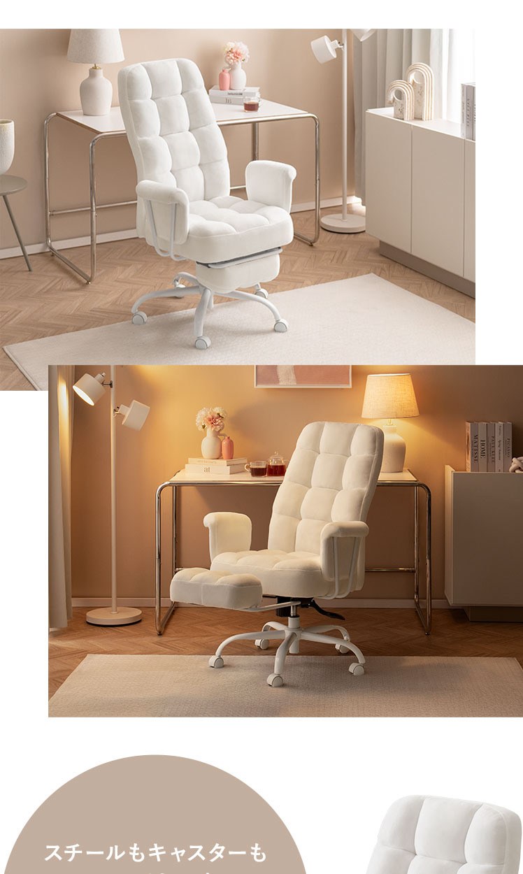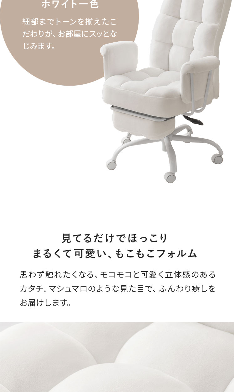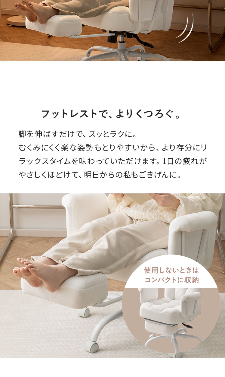 デスクチェア 椅子 フットレスト パーソナルチェア スチールチェア デザイナーズ シンプル 韓国風 大人かわいい フェミニン モノトーン 回転 昇降 キャスター付き アーム ロッキング機能 ウレタン スチール脚 もこもこ ふわふわ【5%OFFクーポン対象|公式なら毎日お得】