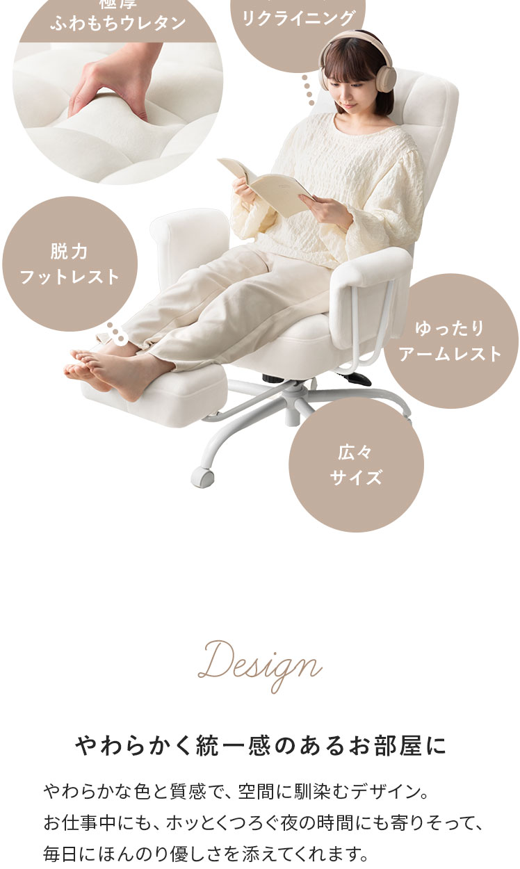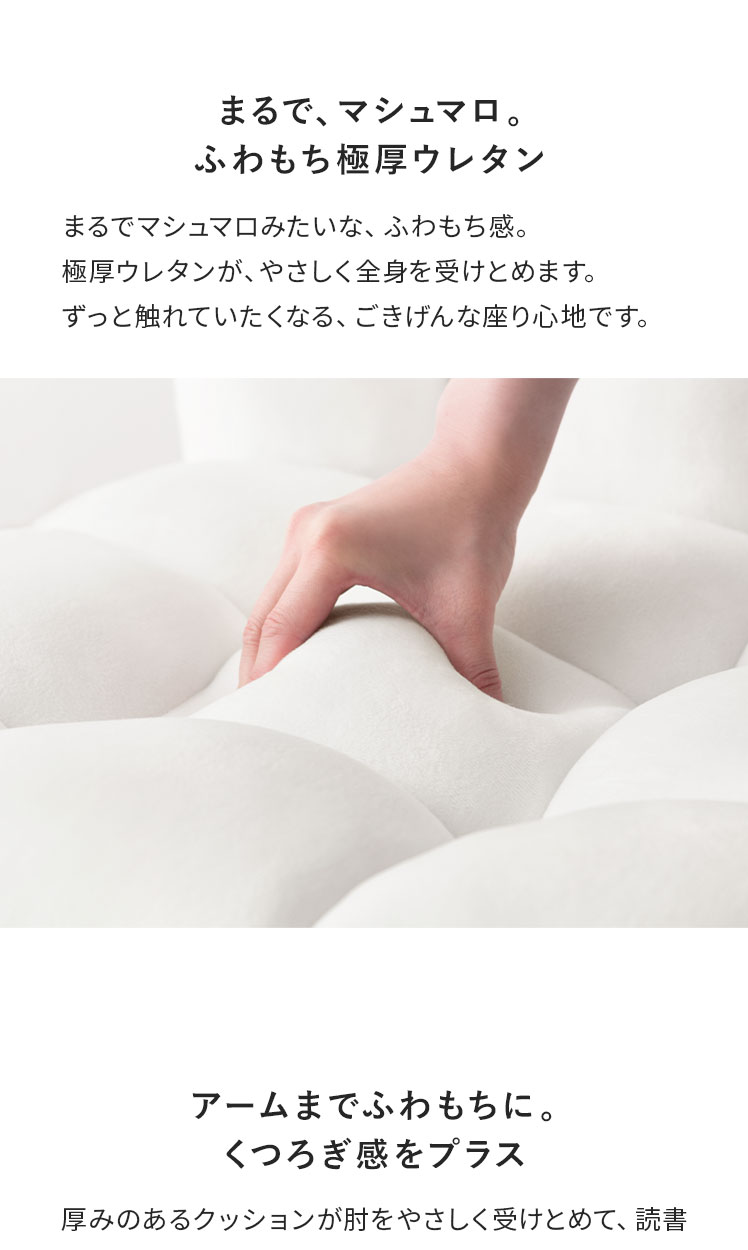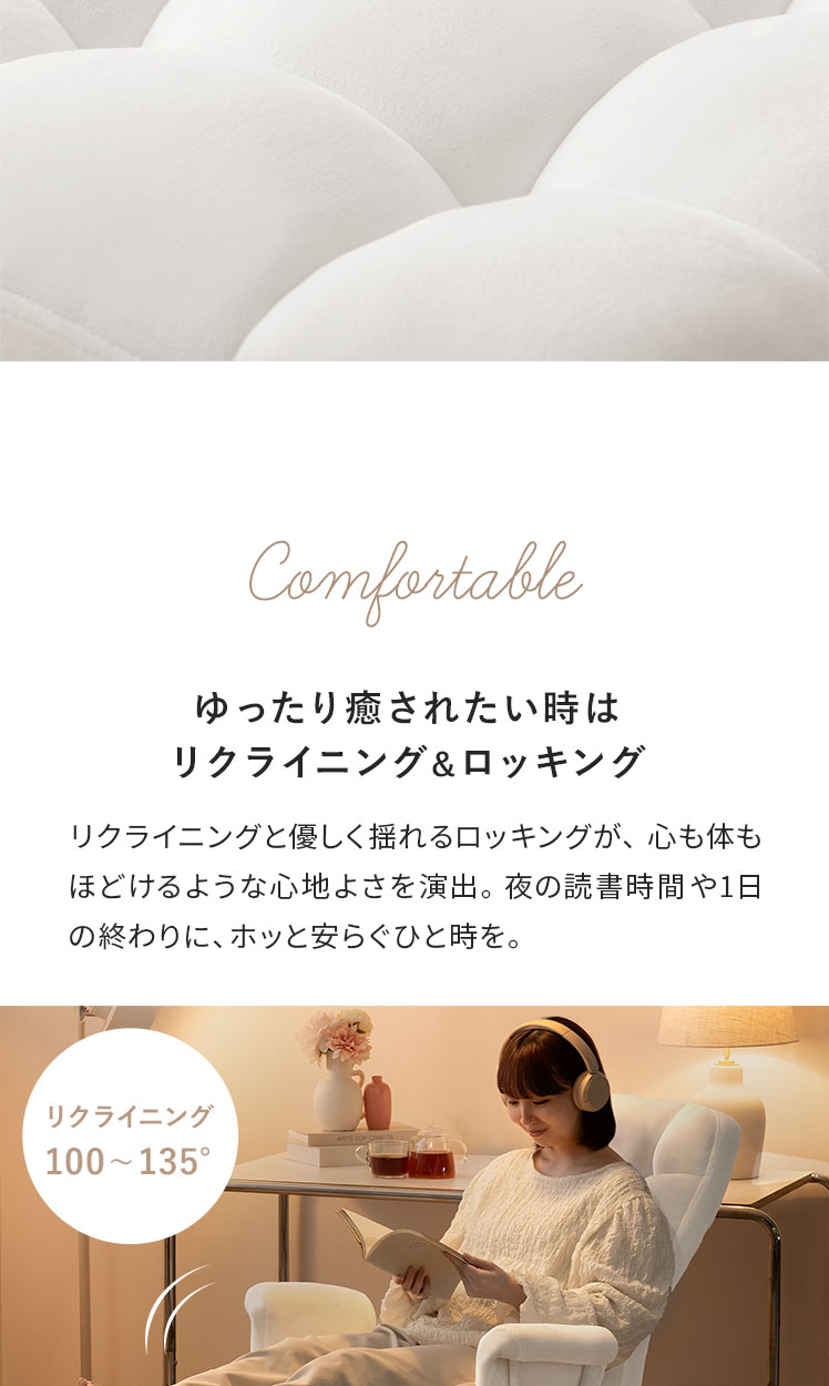 リクライニングチェア puffy〔パフィー〕/まるっと愛らしいフォルムに、リクライニング・ロッキング・フットレストのくつろぎ機能を詰め込んだチェア。夜の読書時間や1日の終わりに、心も体もほどけるような心地よさを。