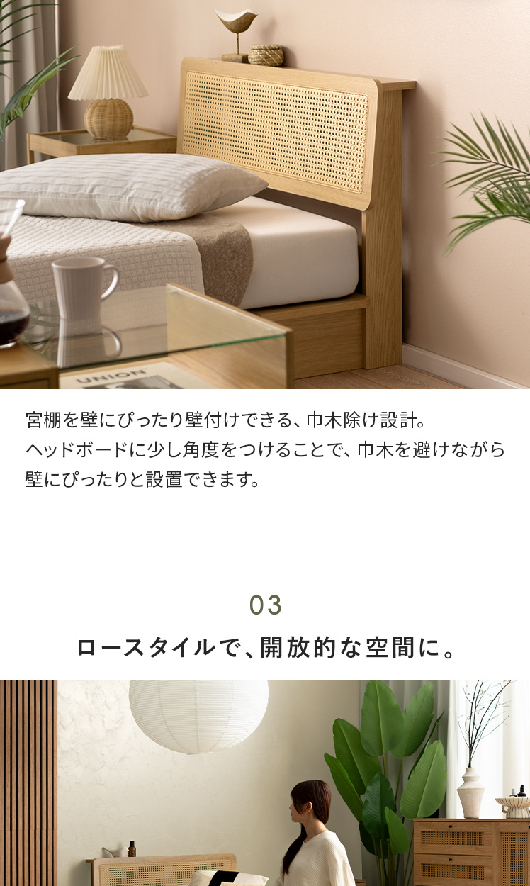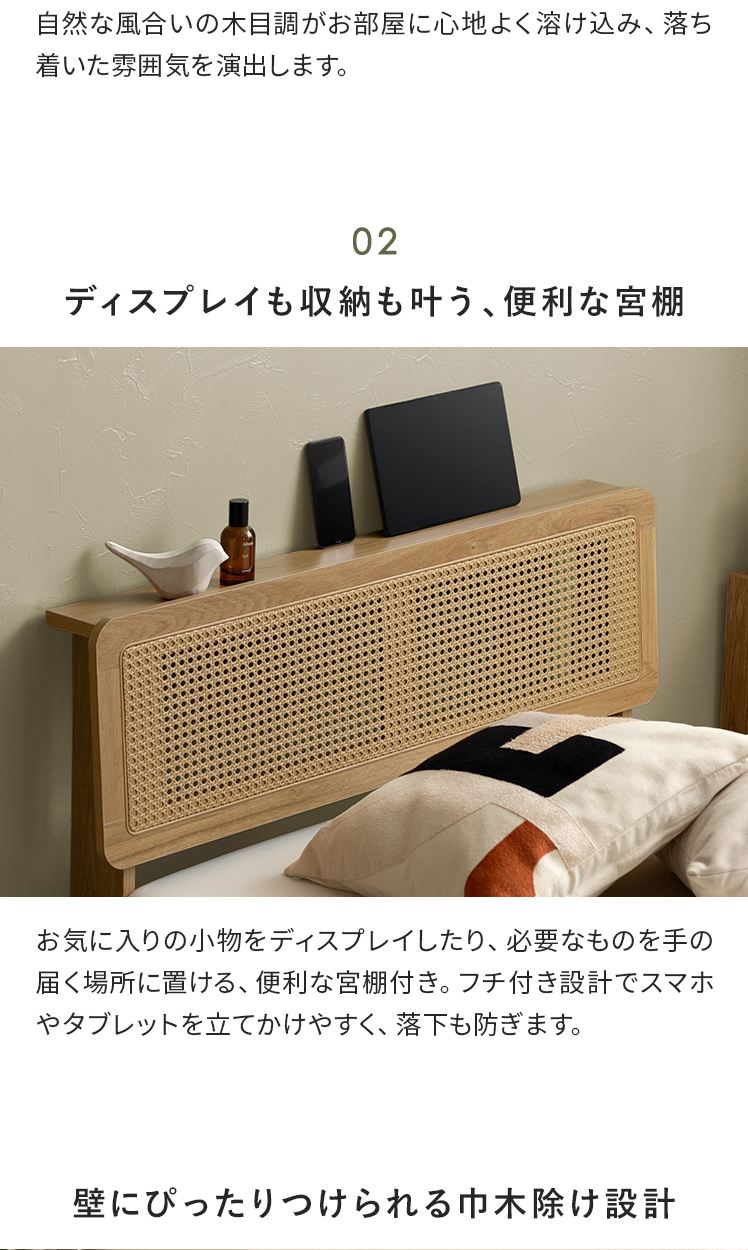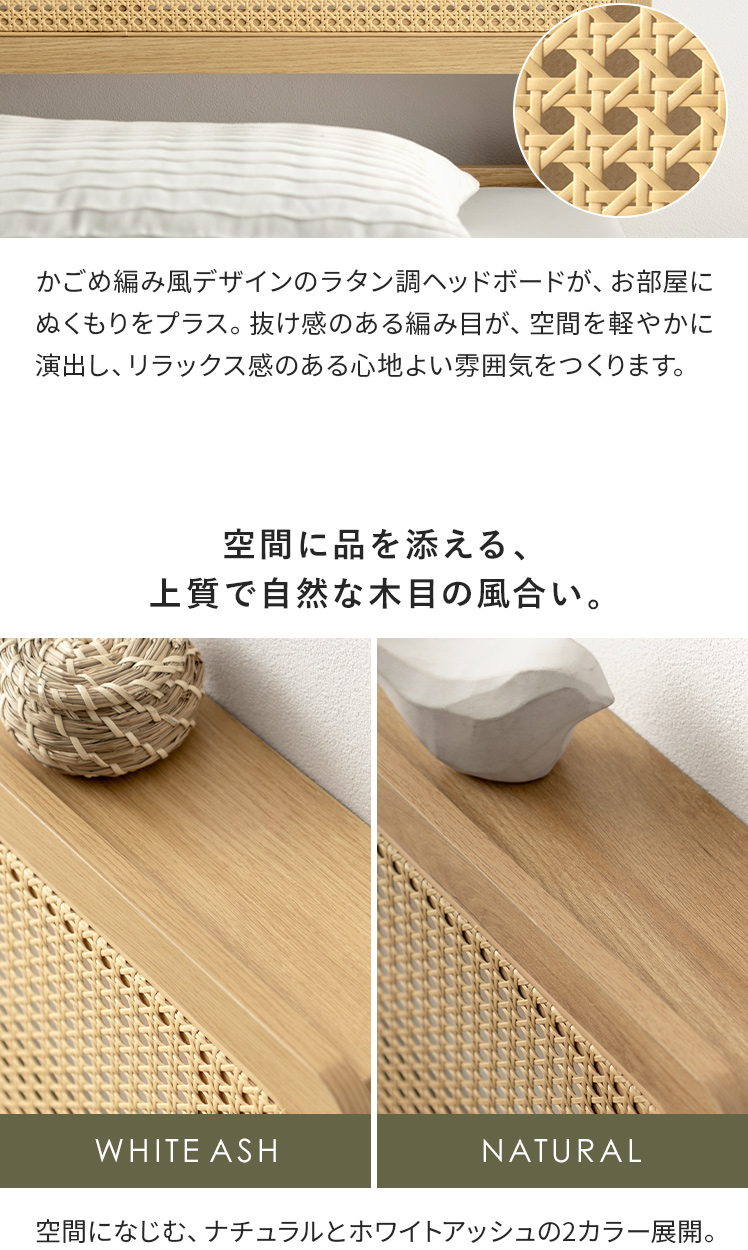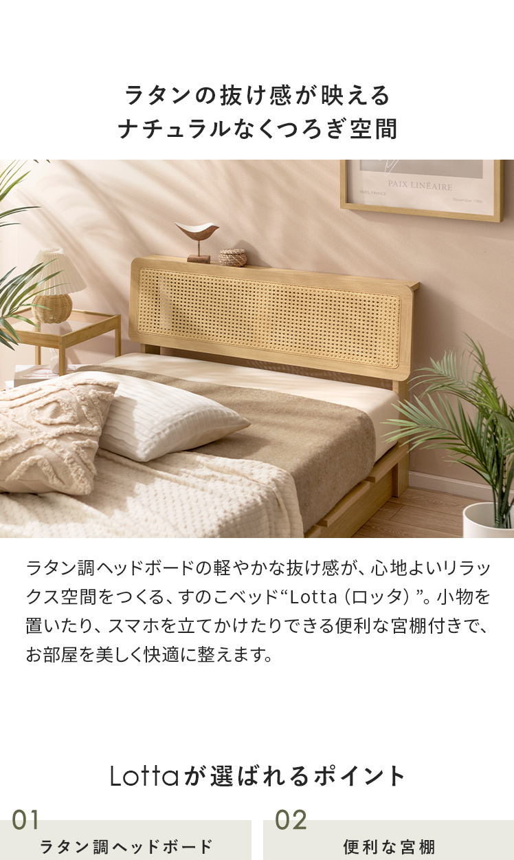 ヘッドボード付きラタン調すのこベッド Lotta〔ロッタ〕マットレスセット/ラタン調ヘッドボードの軽やかな抜け感が、心地よいリラックス空間をつくる、すのこベッド“Lotta(ロッタ)”。小物を置いたり、スマホを立てかけたりできる便利な宮棚付きで、お部屋を美しく快適に整えます。