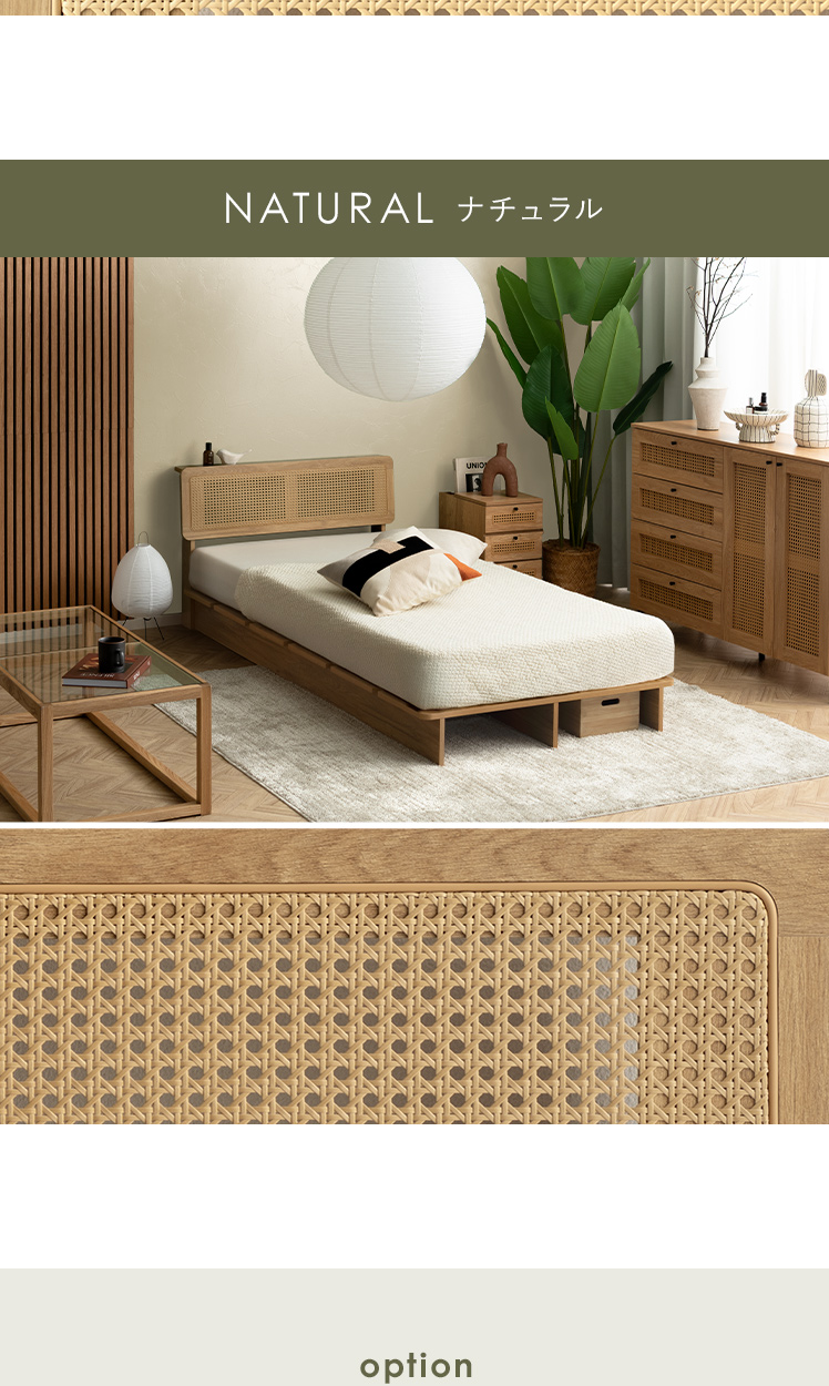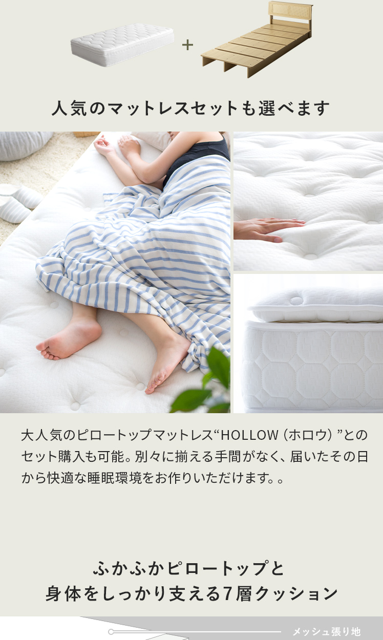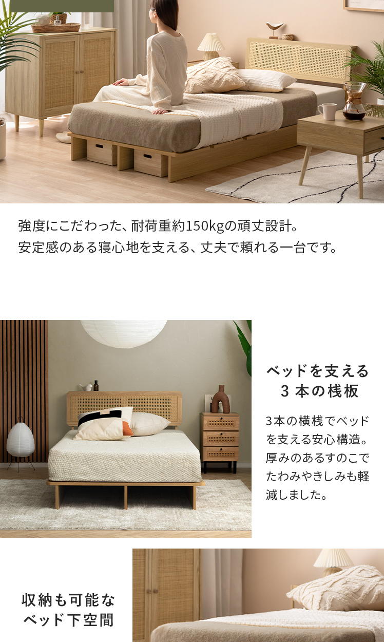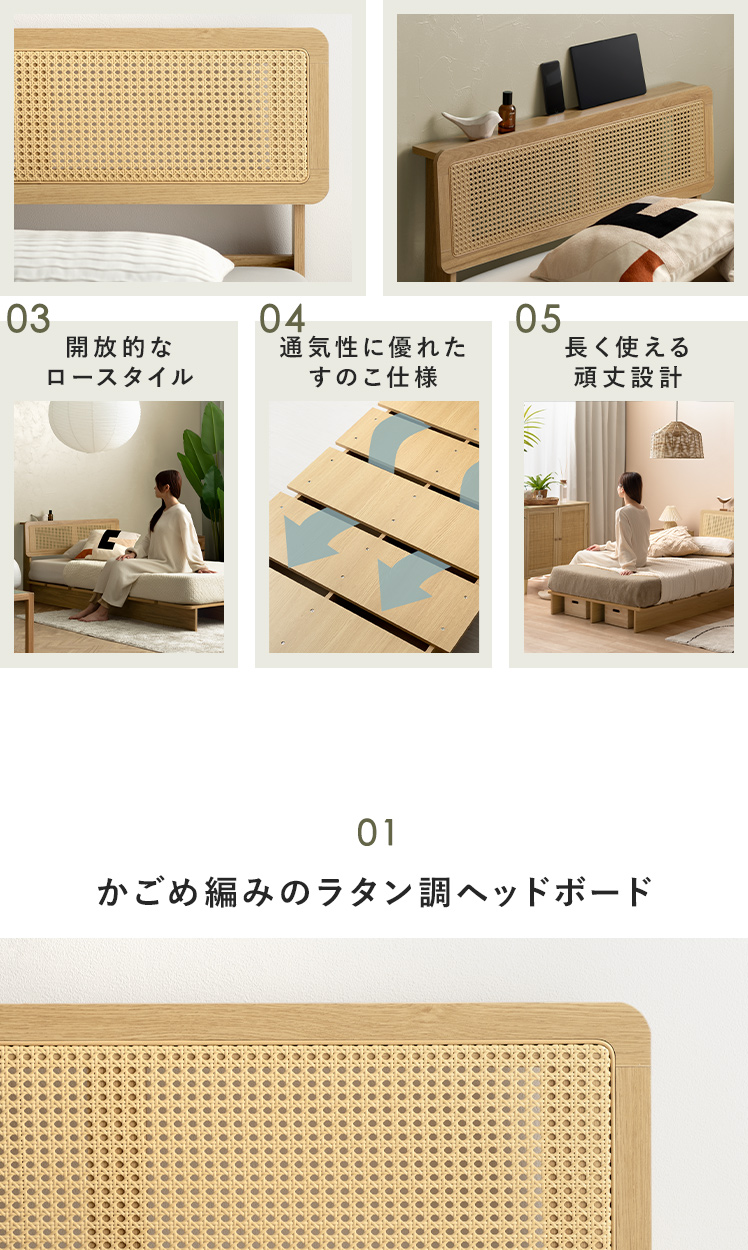 ヘッドボード付きラタン調すのこベッド Lotta〔ロッタ〕マットレスセット/ラタン調ヘッドボードの軽やかな抜け感が、心地よいリラックス空間をつくる、すのこベッド“Lotta(ロッタ)”。小物を置いたり、スマホを立てかけたりできる便利な宮棚付きで、お部屋を美しく快適に整えます。