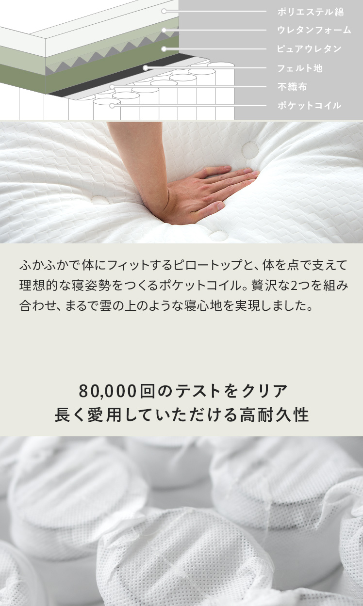 | 材質 | ベッド/合成樹脂化粧板(メラミン)、PVC(塩化ビニール) マットレス/ポケットコイル、フェルト、ウレタン、不織布、ポリエステル |