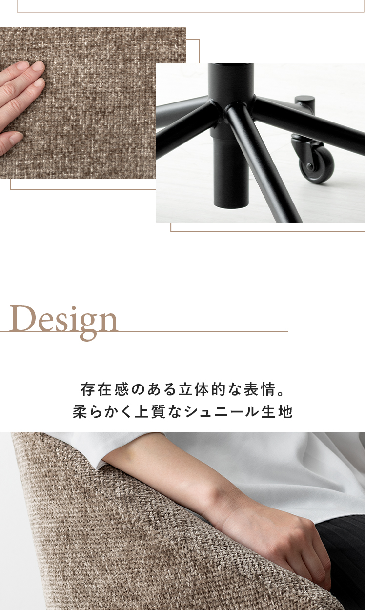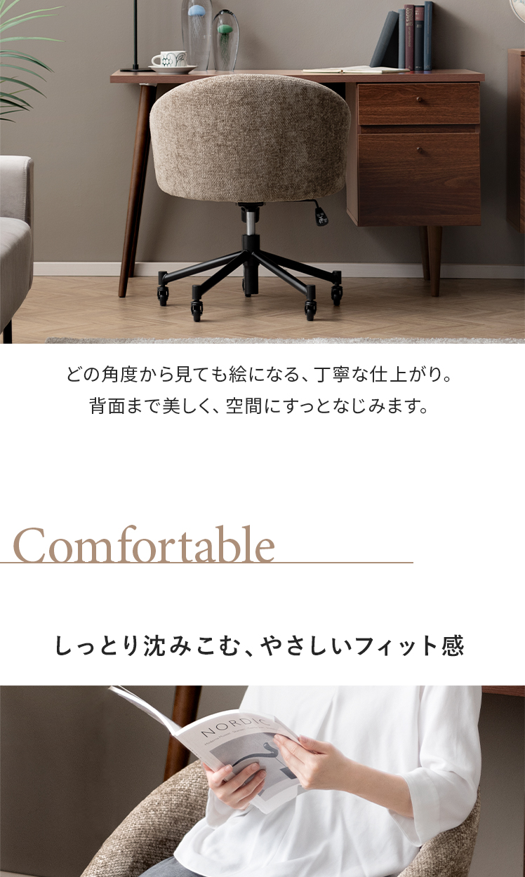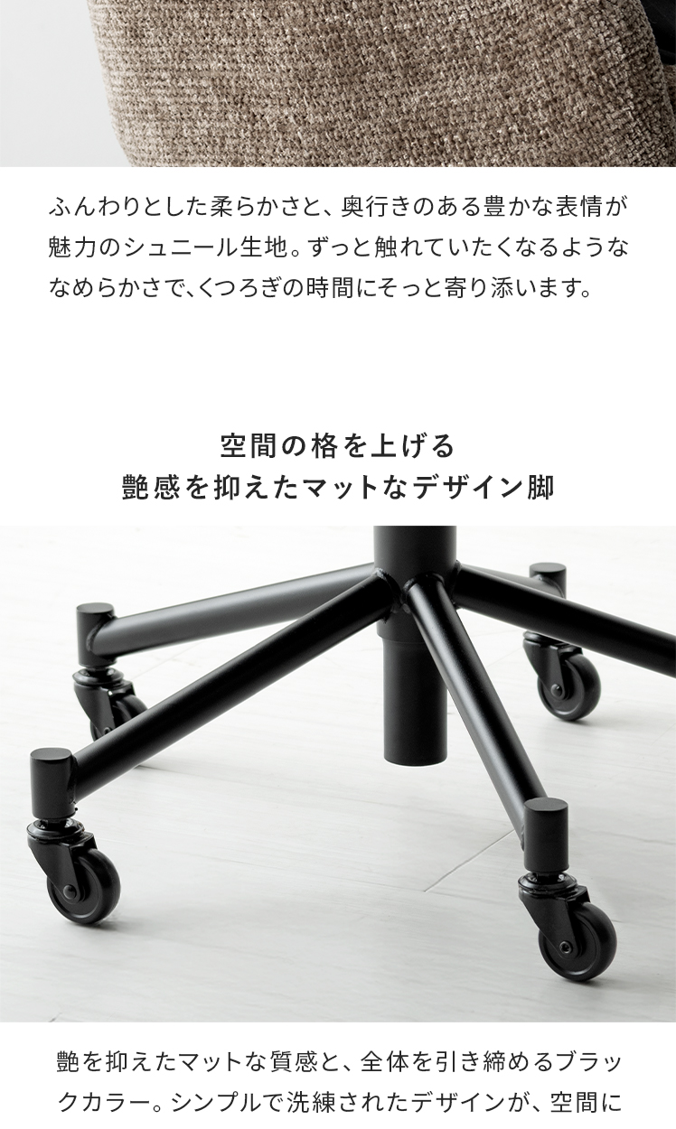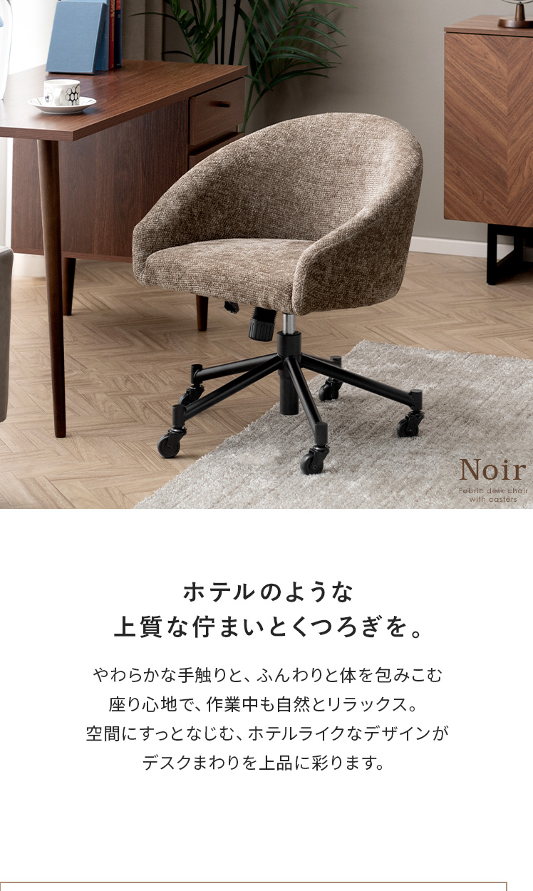 デスクチェア Noir〔ノワール〕/やわらかな手触りと、ふんわりと体を包みこむ座り心地で、作業中も自然とリラックス。空間にすっとなじむ、ホテルライクなデザインがデスクまわりを上品に彩ります。