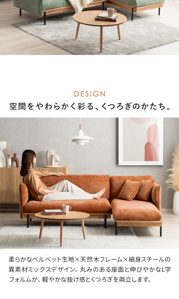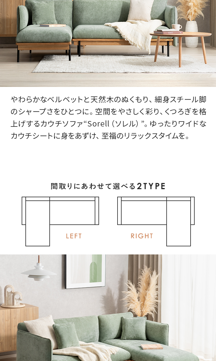 カウチソファ Sorell〔ソレル〕/やわらかなベルベットと天然木のぬくもり、細身スチール脚のシャープさをひとつに。空間をやさしく彩り、くつろぎを格上げするカウチソファ“Sorell(ソレル)”。ゆったりワイドなカウチシートに身をあずけ、至福のリラックスタイムを。