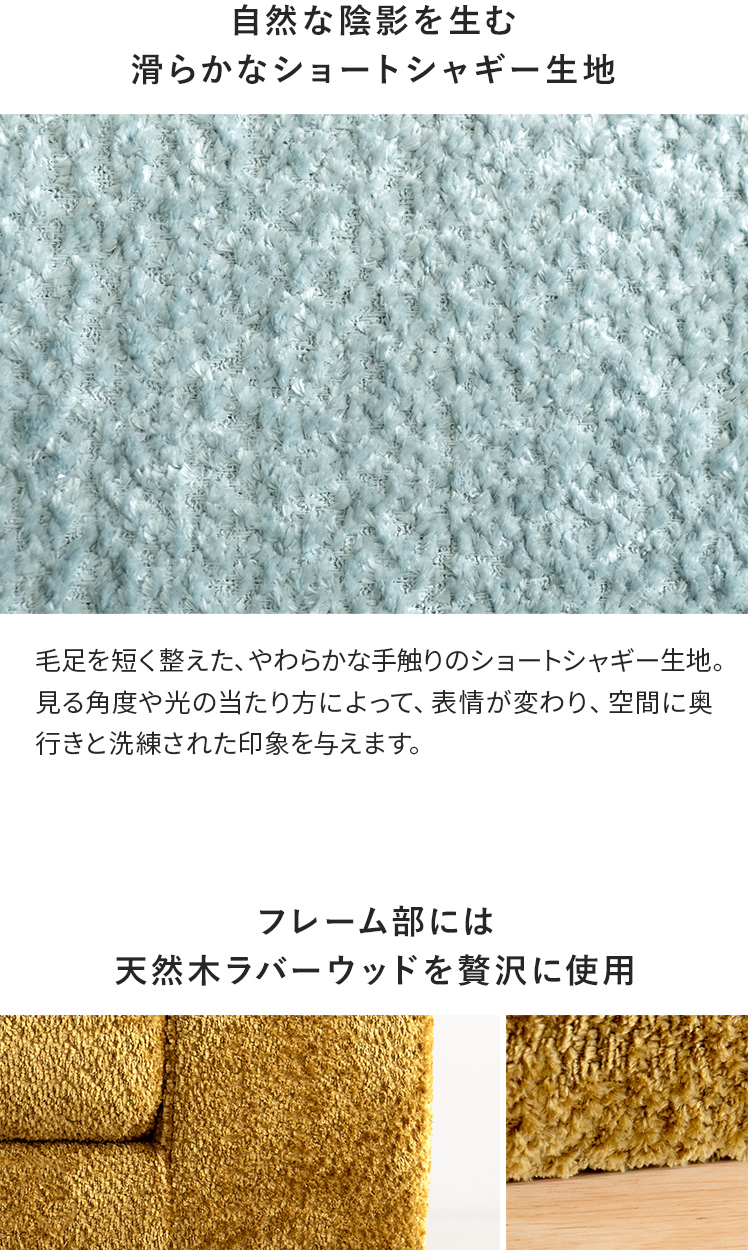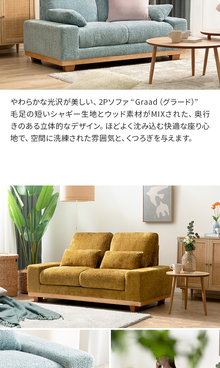 2Pソファ Graad〔グラード〕 /やわらかな光沢が美しい、2Pソファ“Graad(グラード)” 毛足の短いシャギー生地とウッド素材がMIXされた、奥行きのある立体的なデザイン。ほどよく沈み込む快適な座り心地で、空間に洗練された雰囲気と、くつろぎを与えます。