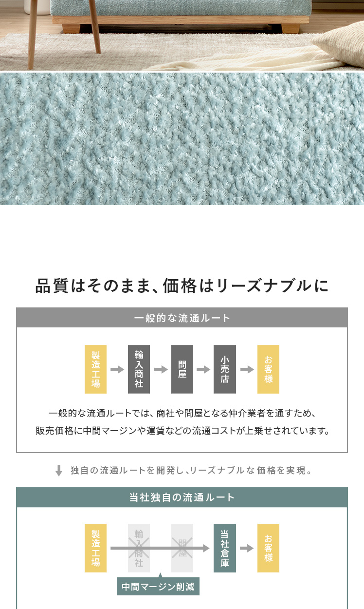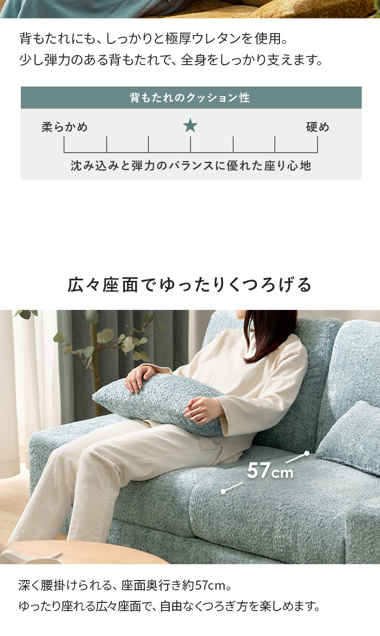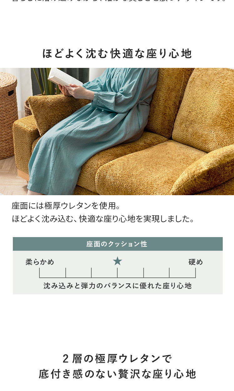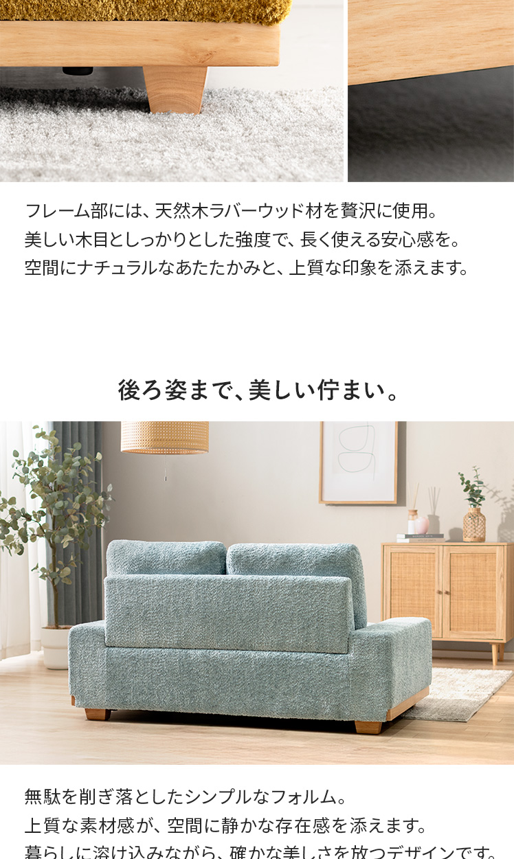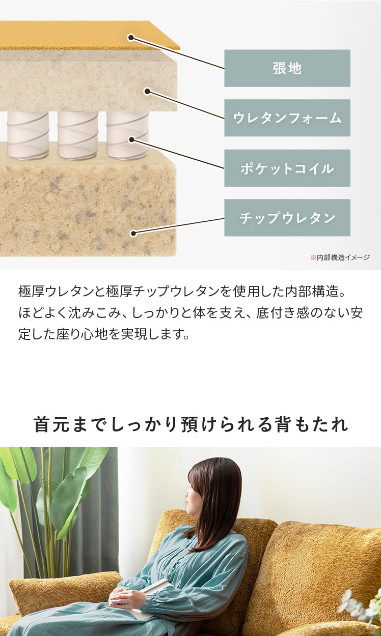 | 材質 | 張地/ポリエステル、クッション材/ウレタン、ポケットコイル、再生ウレタン フレーム部/天然木ラバーウッド材 |