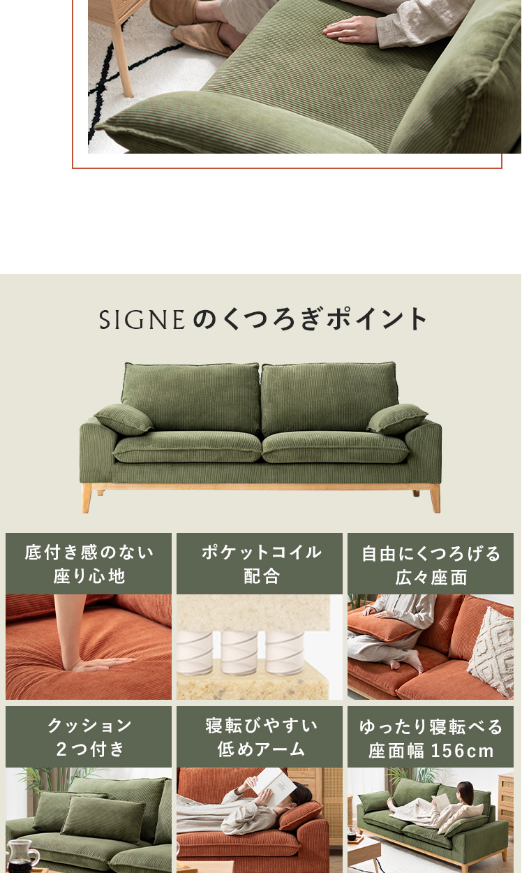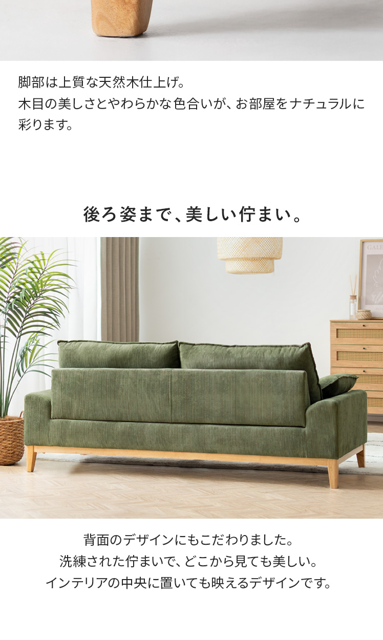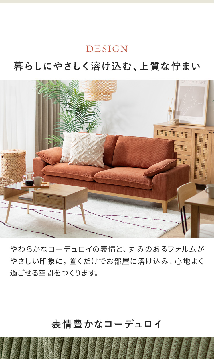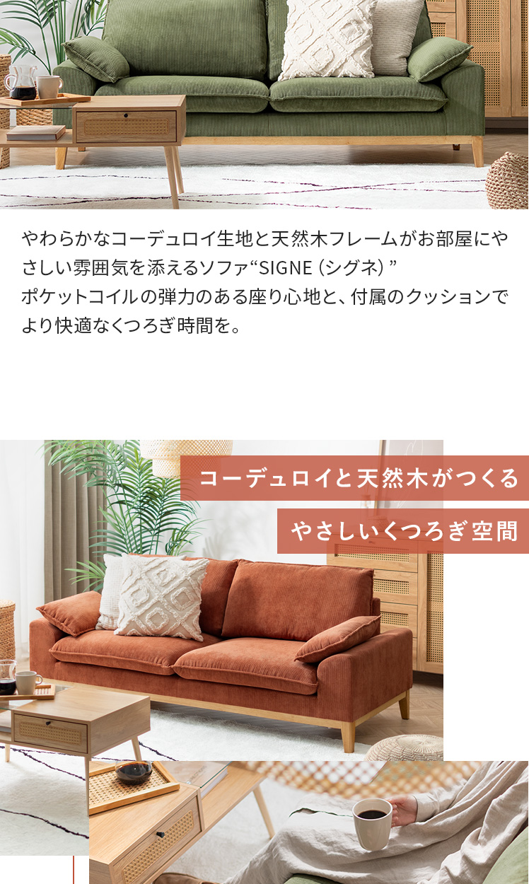 2.5Pコーデュロイソファ Signe〔シグネ〕/やわらかなコーデュロイ生地と天然木フレームがお部屋にやさしい雰囲気を添えるソファ“SIGNE(シグネ)”ポケットコイルの弾力のある座り心地と、付属のクッションでより快適なくつろぎ時間を。