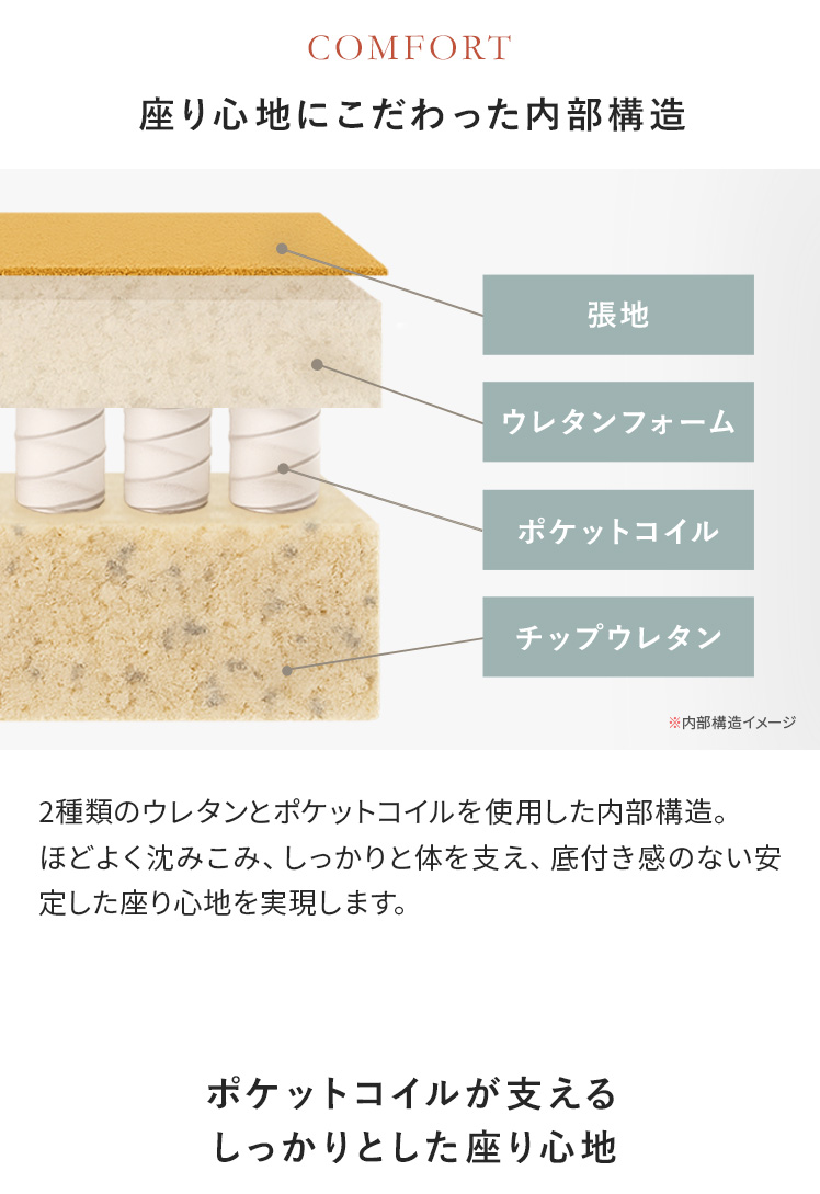 | 材質 | 天然木(ラッカー塗装)、スチール、ポケットコイル、ウレタン、ポリエステル |