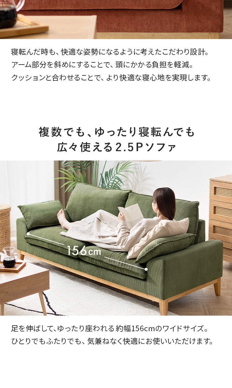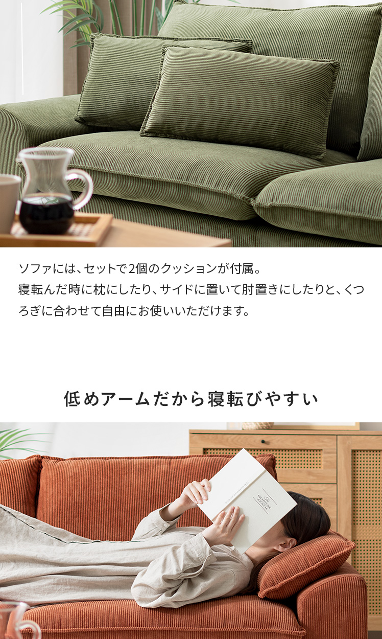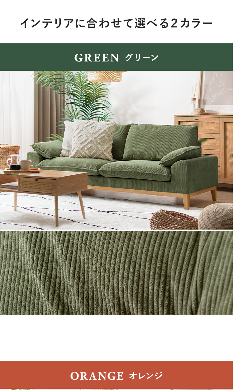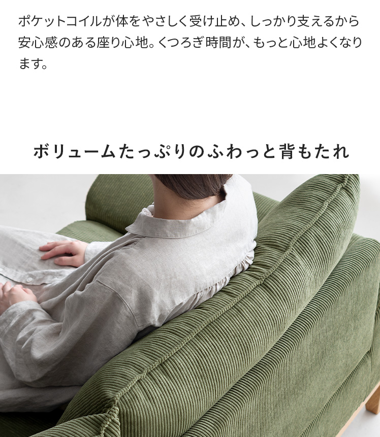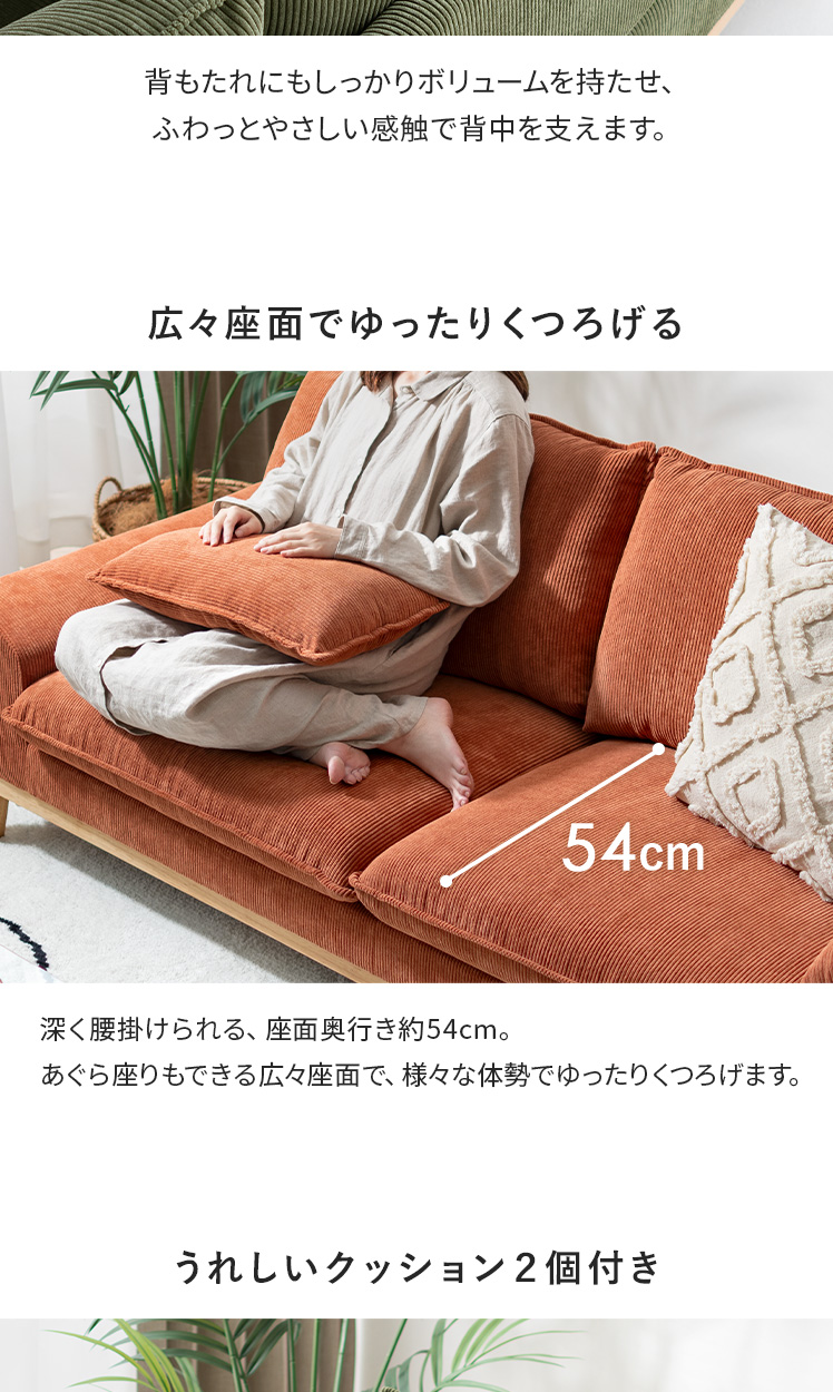 2人用 3人用 天然木フレーム ポケットコイル 天然木脚 クッション付き 低めアーム 広々座面 シンプル 北欧 リビング ナチュラル グリーン オレンジ【5%OFFクーポン対象|公式なら毎日お得】