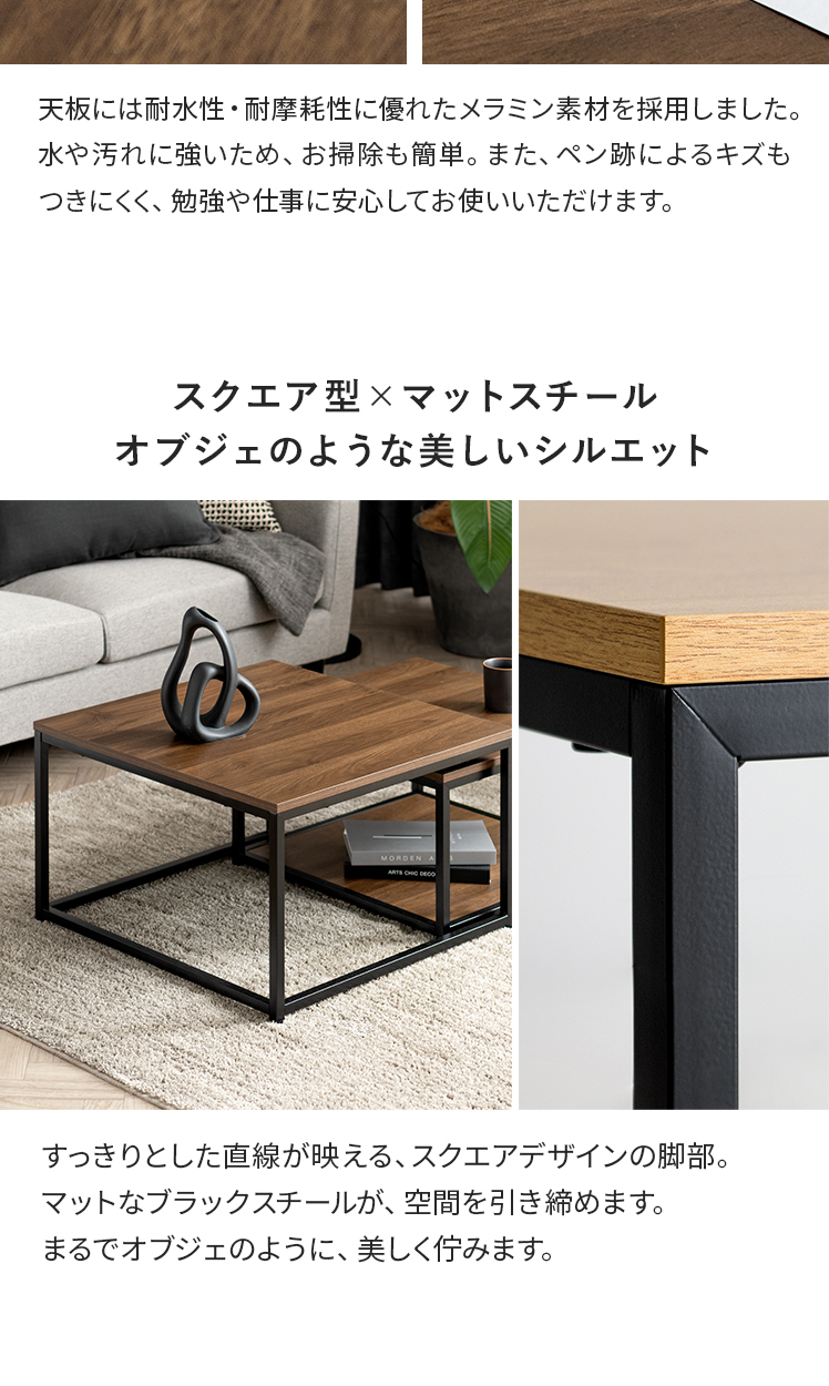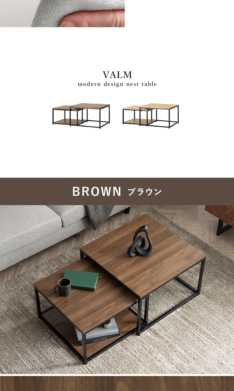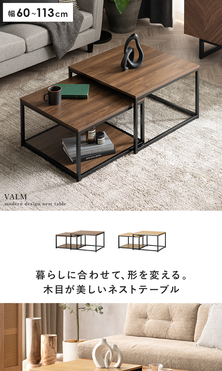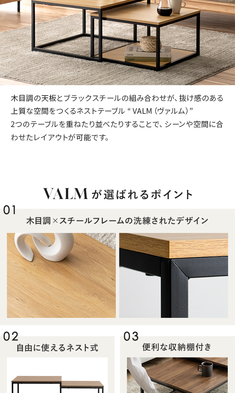 ネストテーブル VALM〔ヴァルム〕/木目調の天板とブラックスチールの組み合わせが、抜け感のある上質な空間をつくるネストテーブル“VALM(ヴァルム)”2つのテーブルを重ねたり並べたりすることで、シーンや空間に合わせたレイアウトが可能です。抜け感のあるデザインで、お部屋をセンスよく垢抜けさせます。