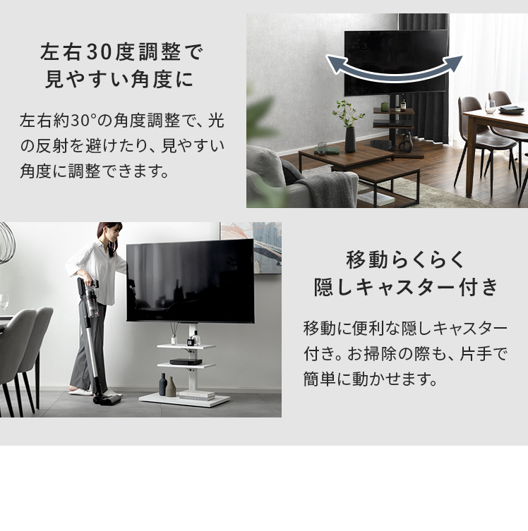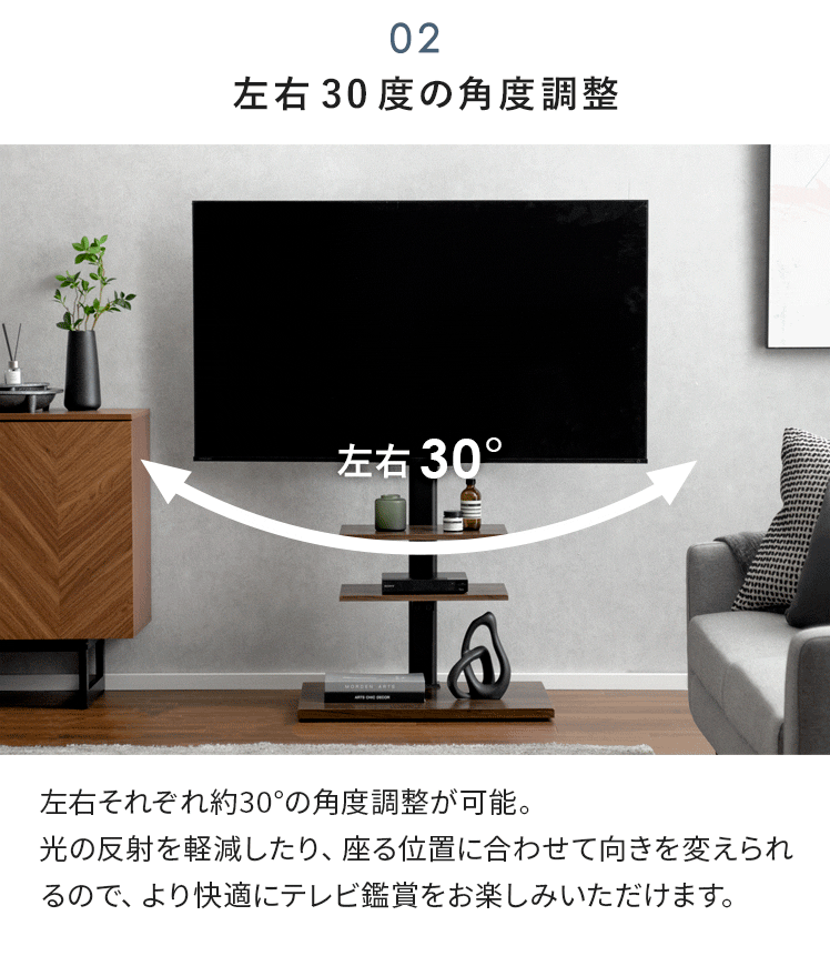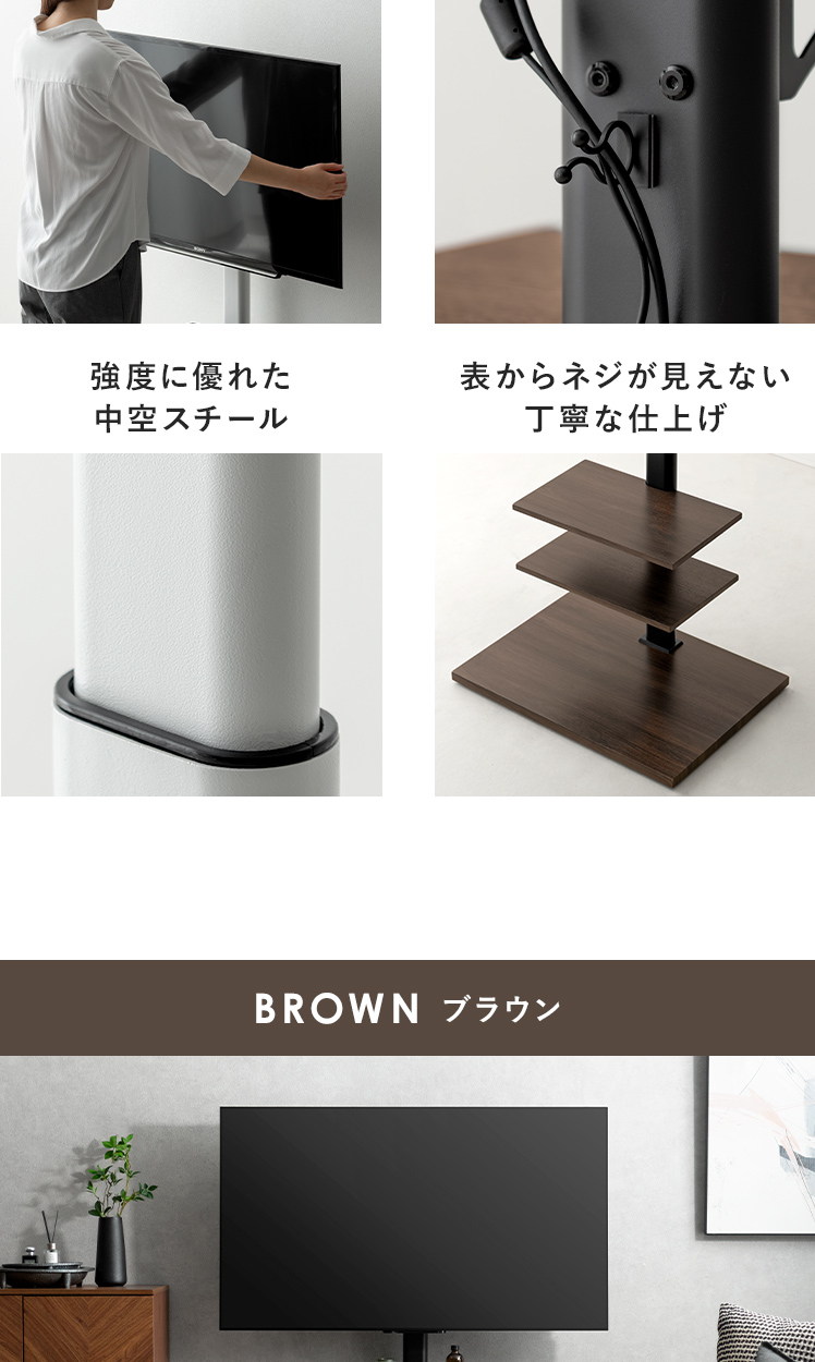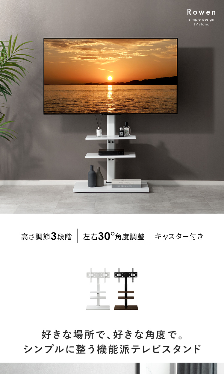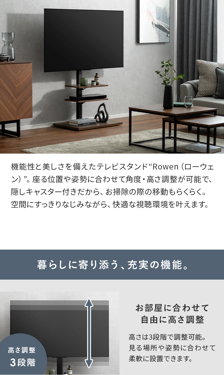 テレビスタンド Rowen〔ローウェン〕/機能性と美しさを備えたテレビスタンド“Rowen(ローウェン)”。座る位置や姿勢に合わせて角度・高さ調整が可能で、隠しキャスター付きだから、お掃除の際の移動もらくらく。空間にすっきりなじみながら、快適な視聴環境を叶えます。