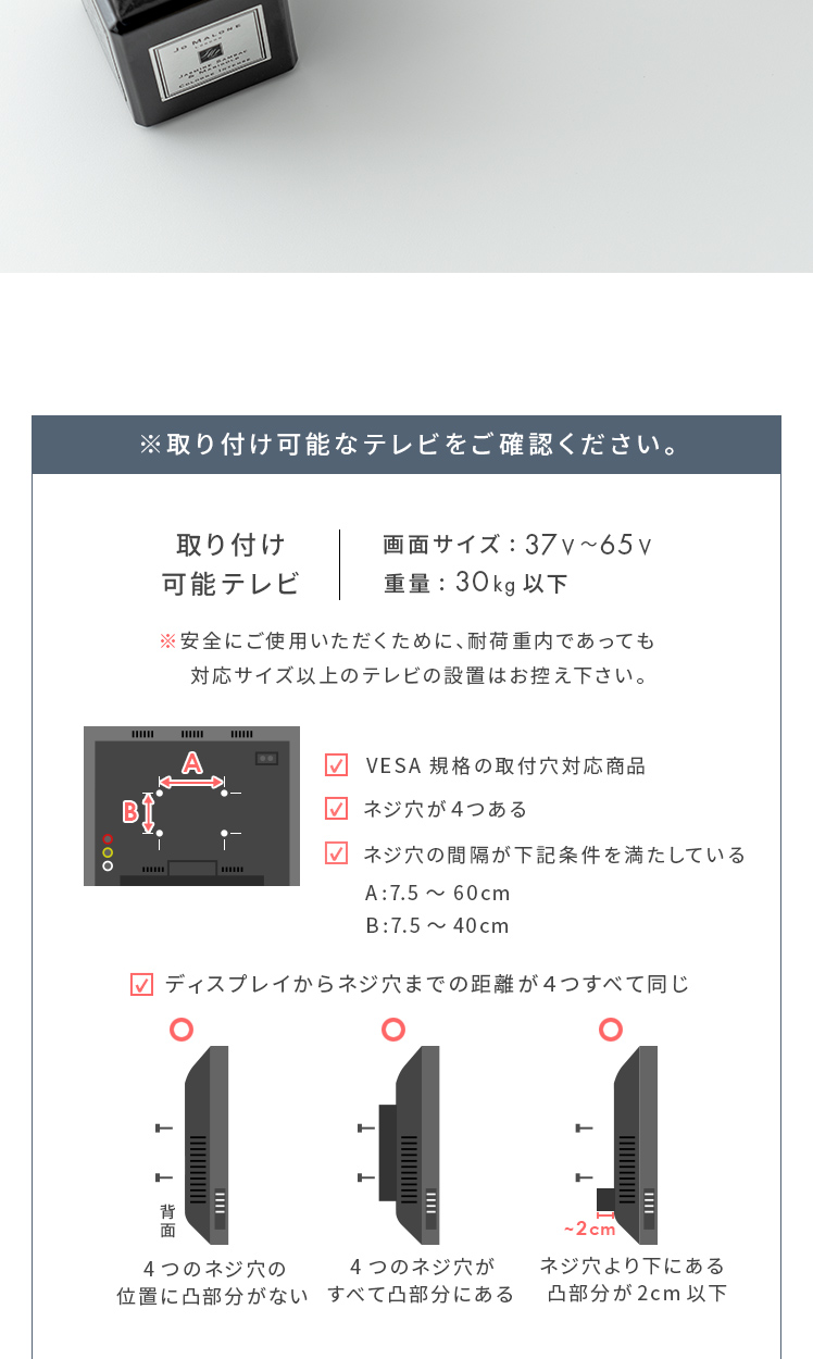 | 対応テレビサイズ | 37〜65型(VESA規格の取付穴対応商品) |