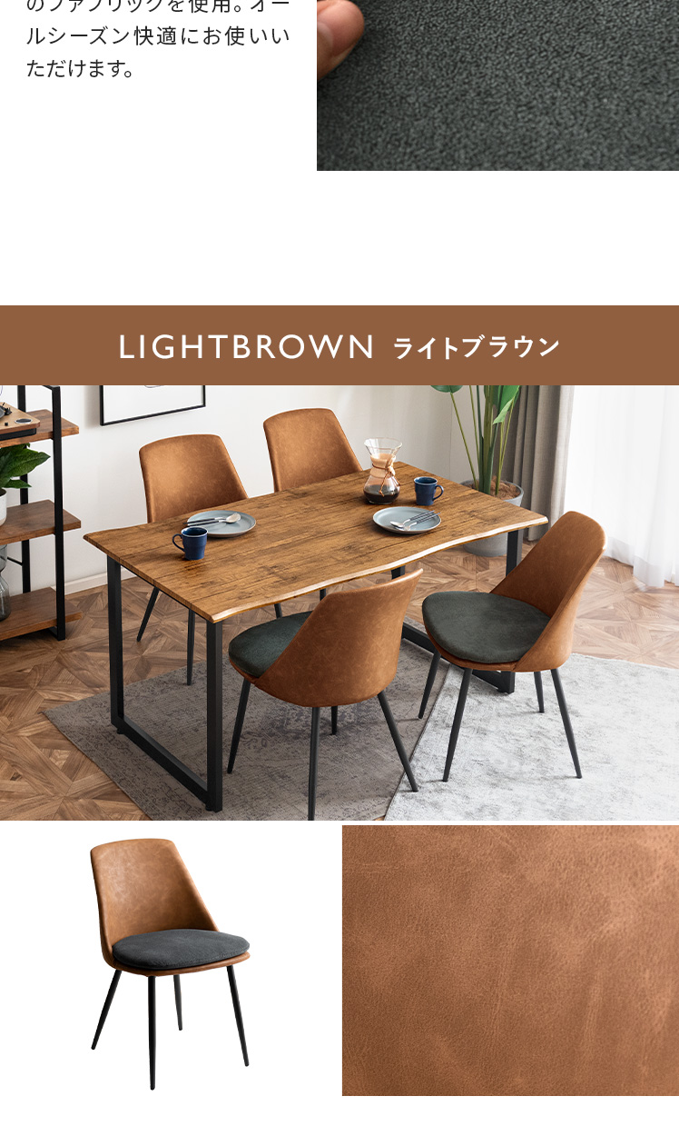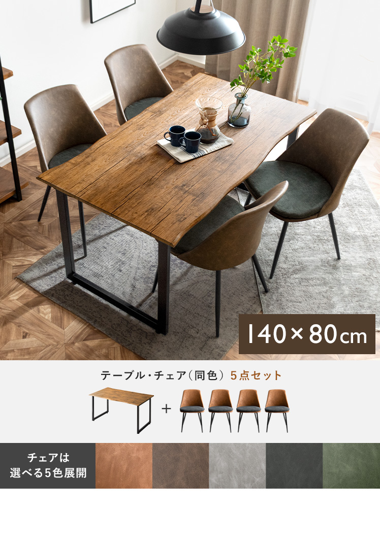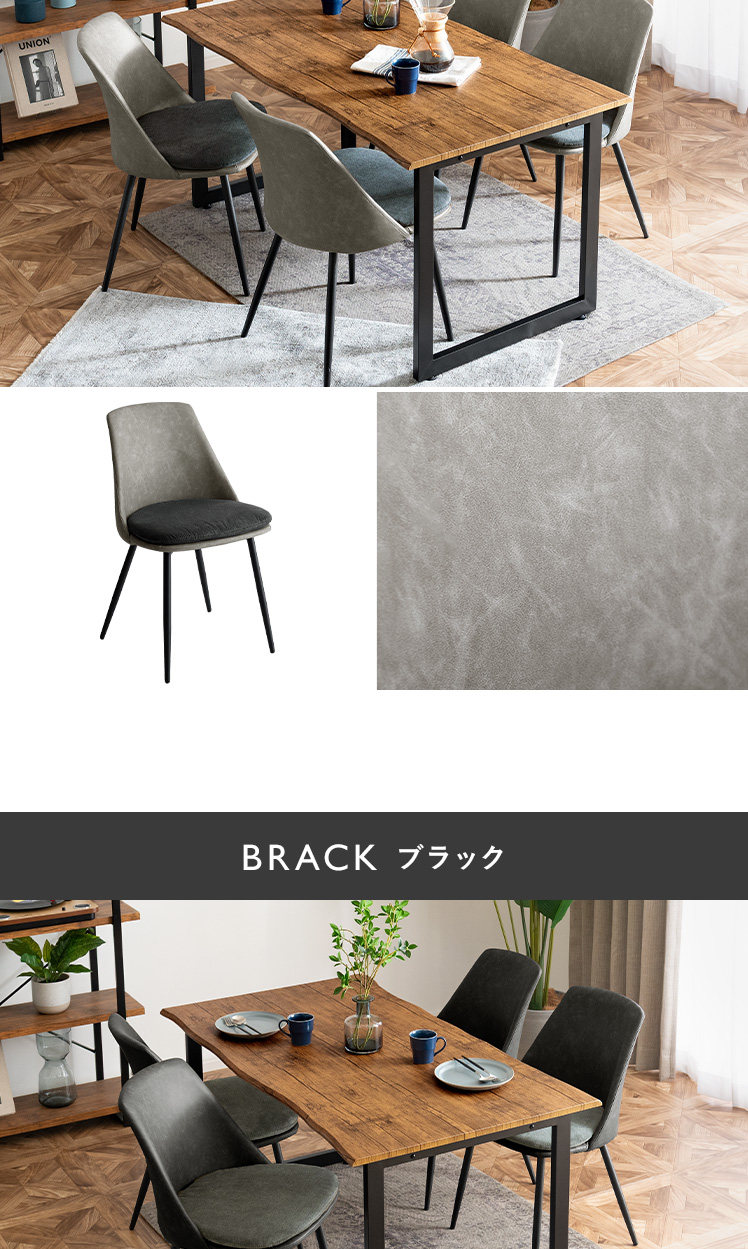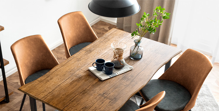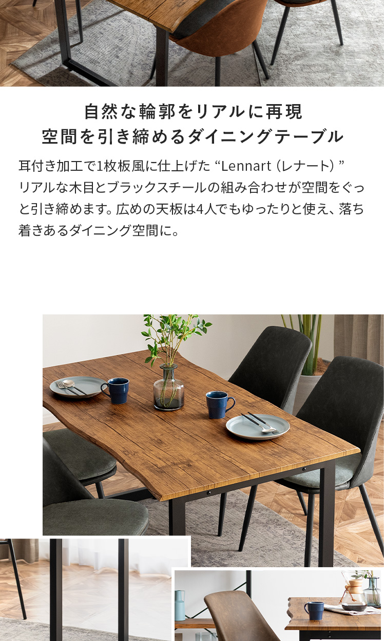 ダイニングテーブル5点セットLennart〔レナート〕/耳付き加工で1枚板風に仕上げた “Lennart(レナート)”リアルな木目とブラックスチールの組み合わせが空間をぐっと引き締めます。広めの天板は4人でもゆったりと使え、落ち着きあるダイニング空間に。