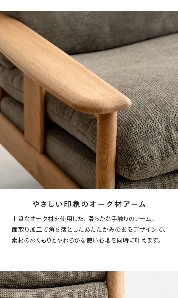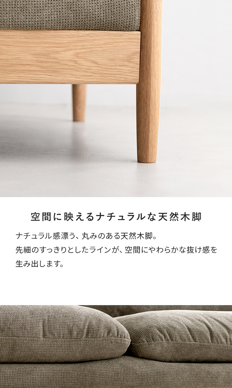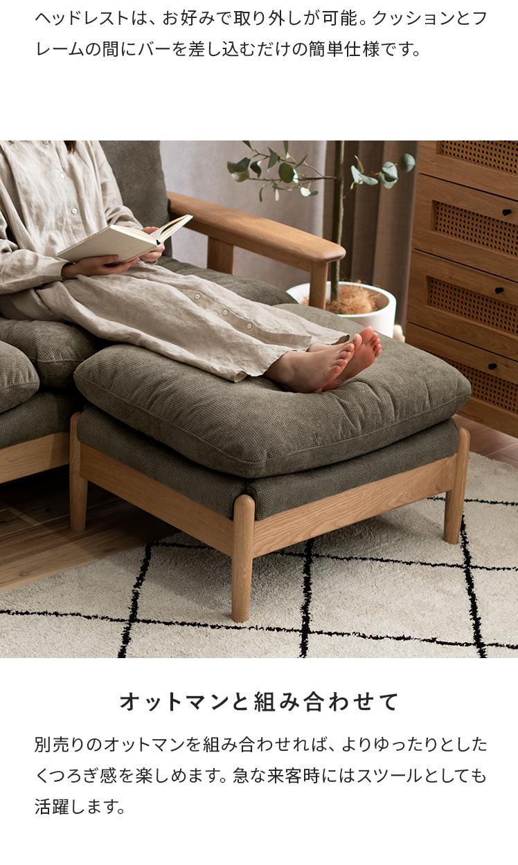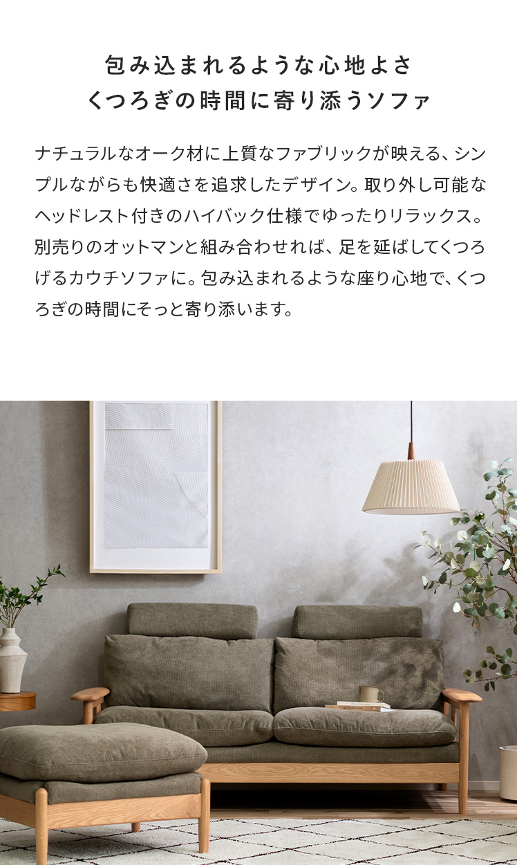 Lento〔レント〕ソファ単品/ナチュラルなオーク材に上質なファブリックが映える、シンプルながらも快適さを追求したデザイン。取り外し可能なヘッドレスト付きのハイバック仕様でゆったりリラックス。別売りのオットマンと組み合わせれば、足を延ばしてくつろげるカウチソファに。包み込まれるような座り心地で、くつろぎの時間にそっと寄り添います。