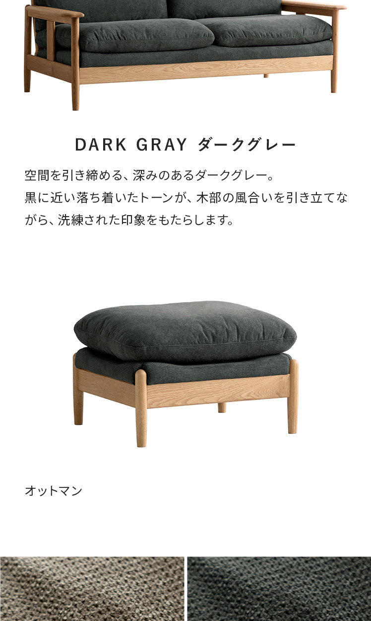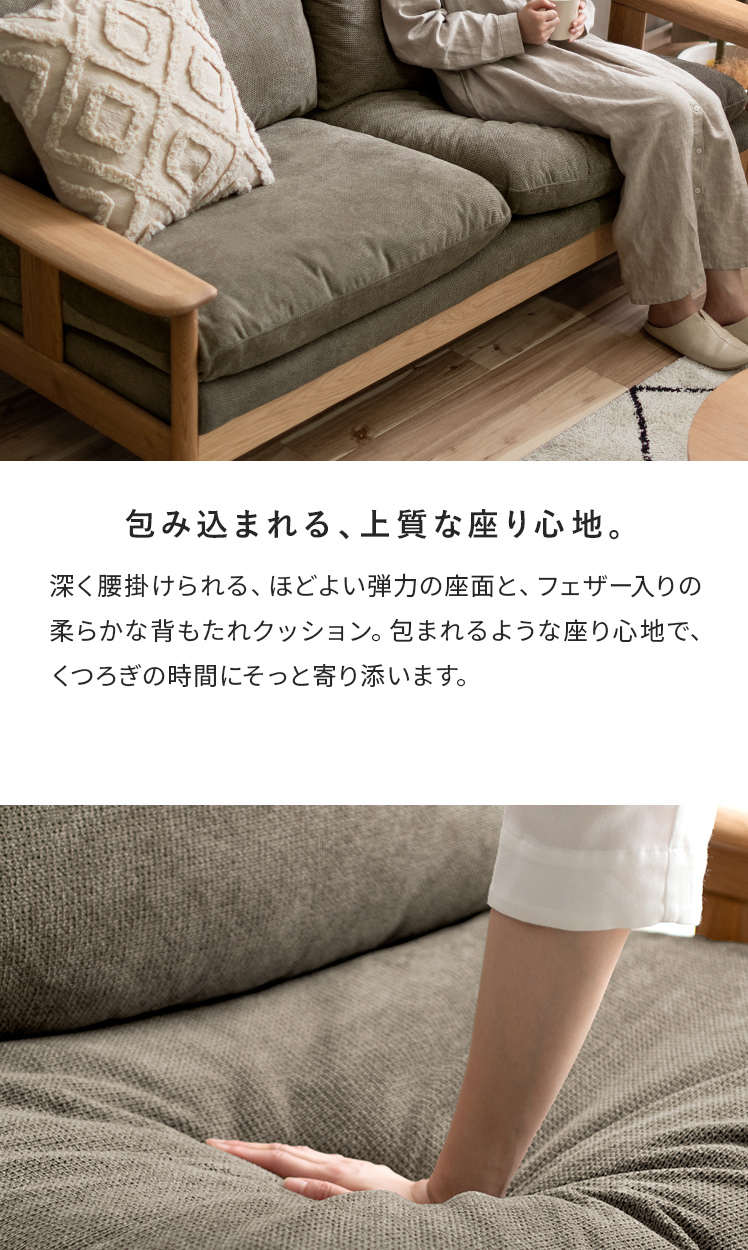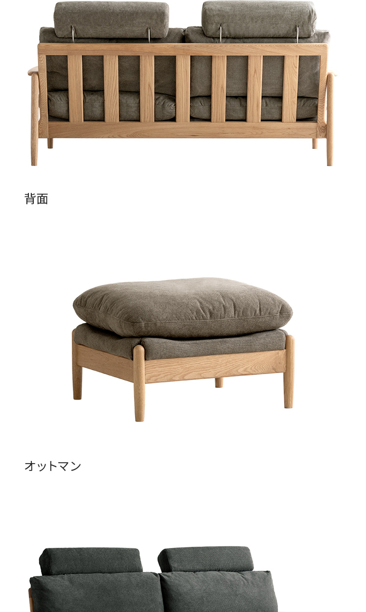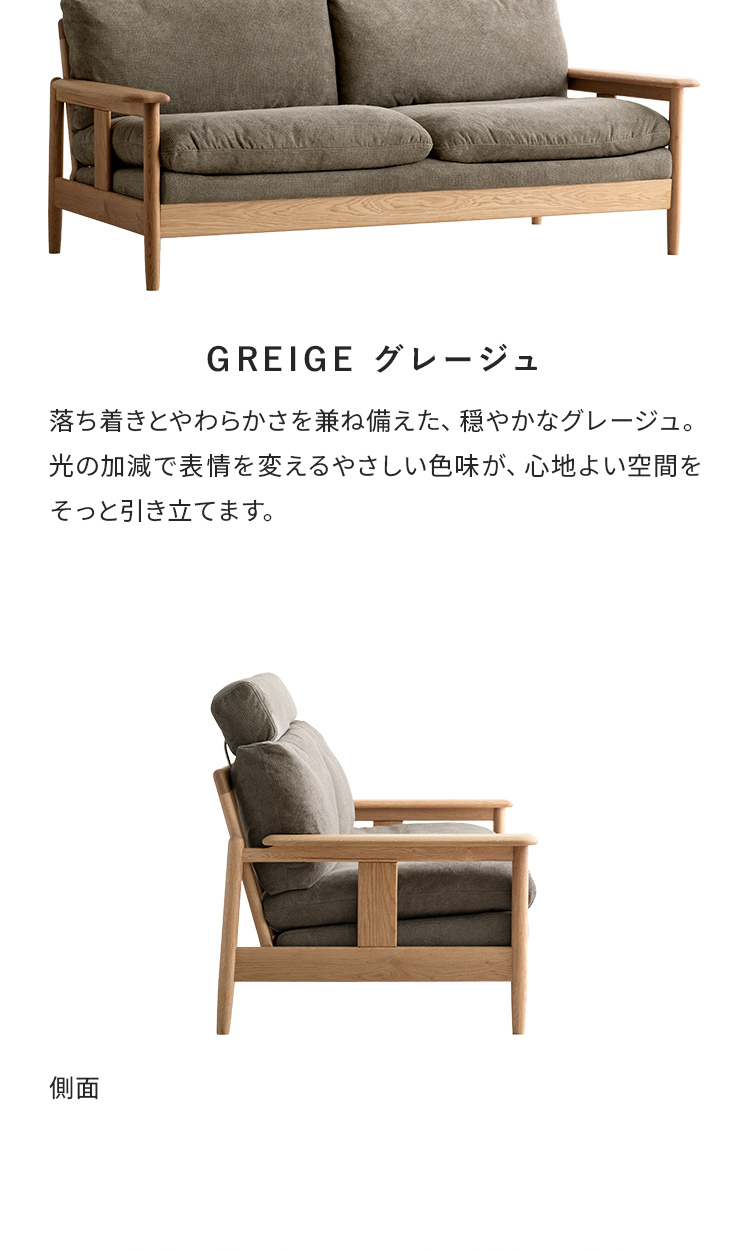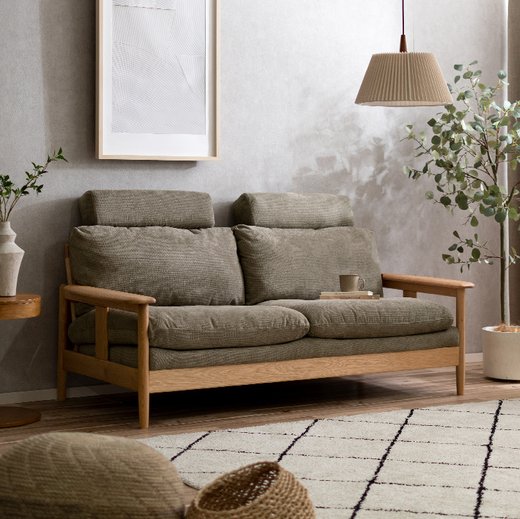 Lento〔レント〕ソファ単品/ナチュラルなオーク材に上質なファブリックが映える、シンプルながらも快適さを追求したデザイン。取り外し可能なヘッドレスト付きのハイバック仕様でゆったりリラックス。別売りのオットマンと組み合わせれば、足を延ばしてくつろげるカウチソファに。包み込まれるような座り心地で、くつろぎの時間にそっと寄り添います。