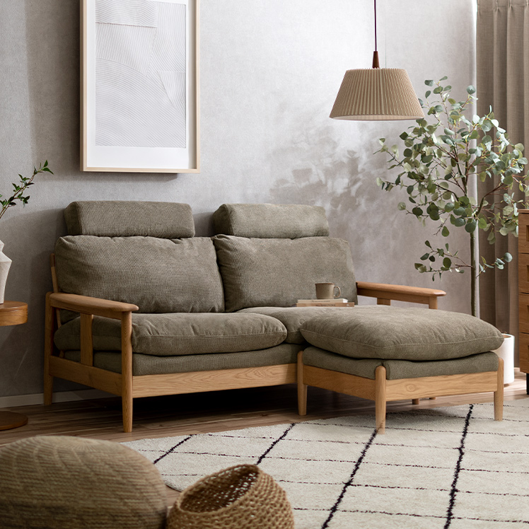 Lento〔レント〕ソファ+オットマンセット/ナチュラルなオーク材に上質なファブリックが映える、シンプルながらも快適さを追求したデザイン。取り外し可能なヘッドレスト付きのハイバック仕様でゆったりリラックス。別売りのオットマンと組み合わせれば、足を延ばしてくつろげるカウチソファに。包み込まれるような座り心地で、くつろぎの時間にそっと寄り添います。