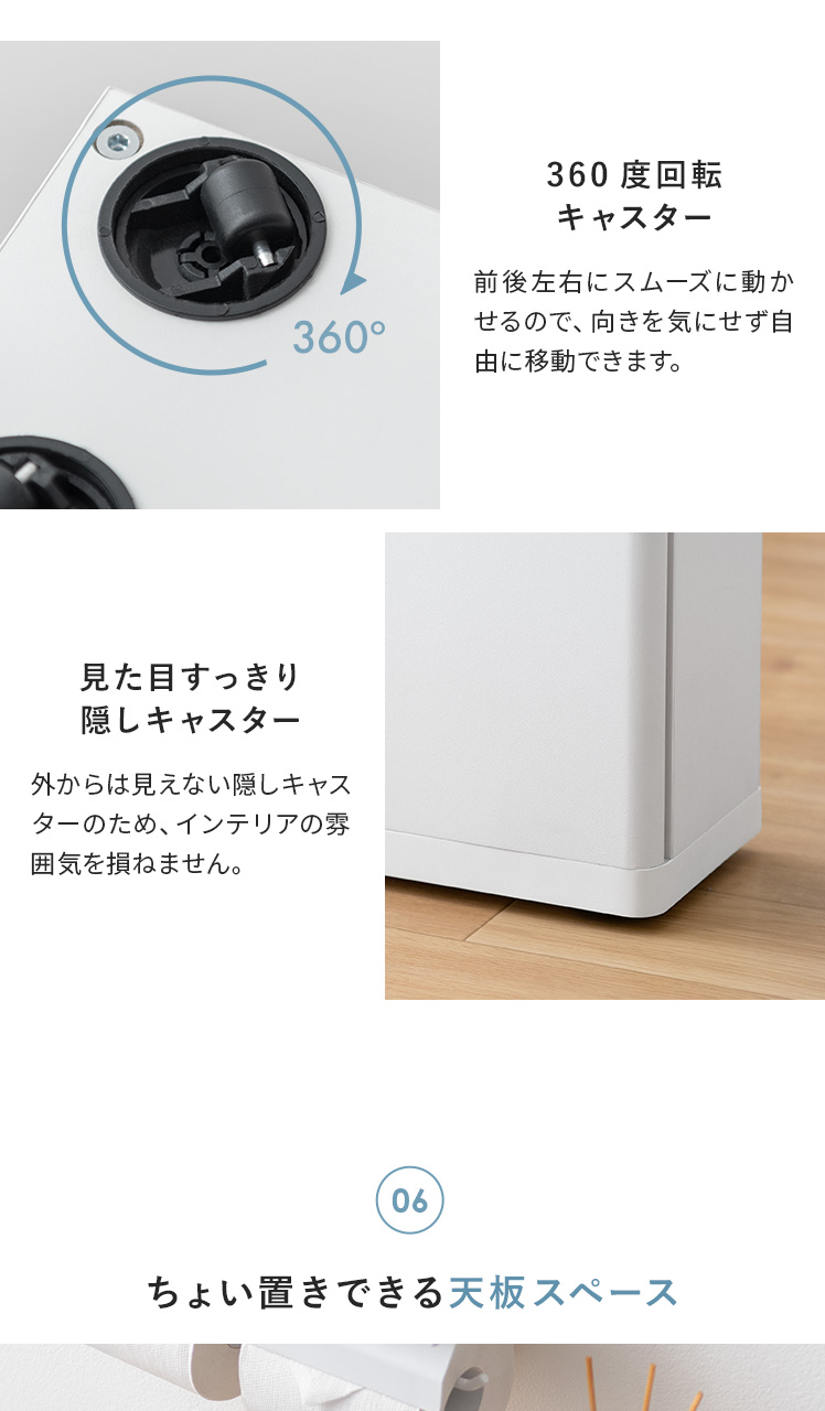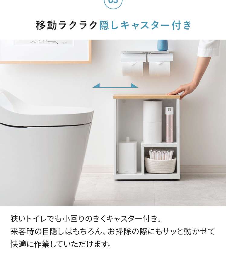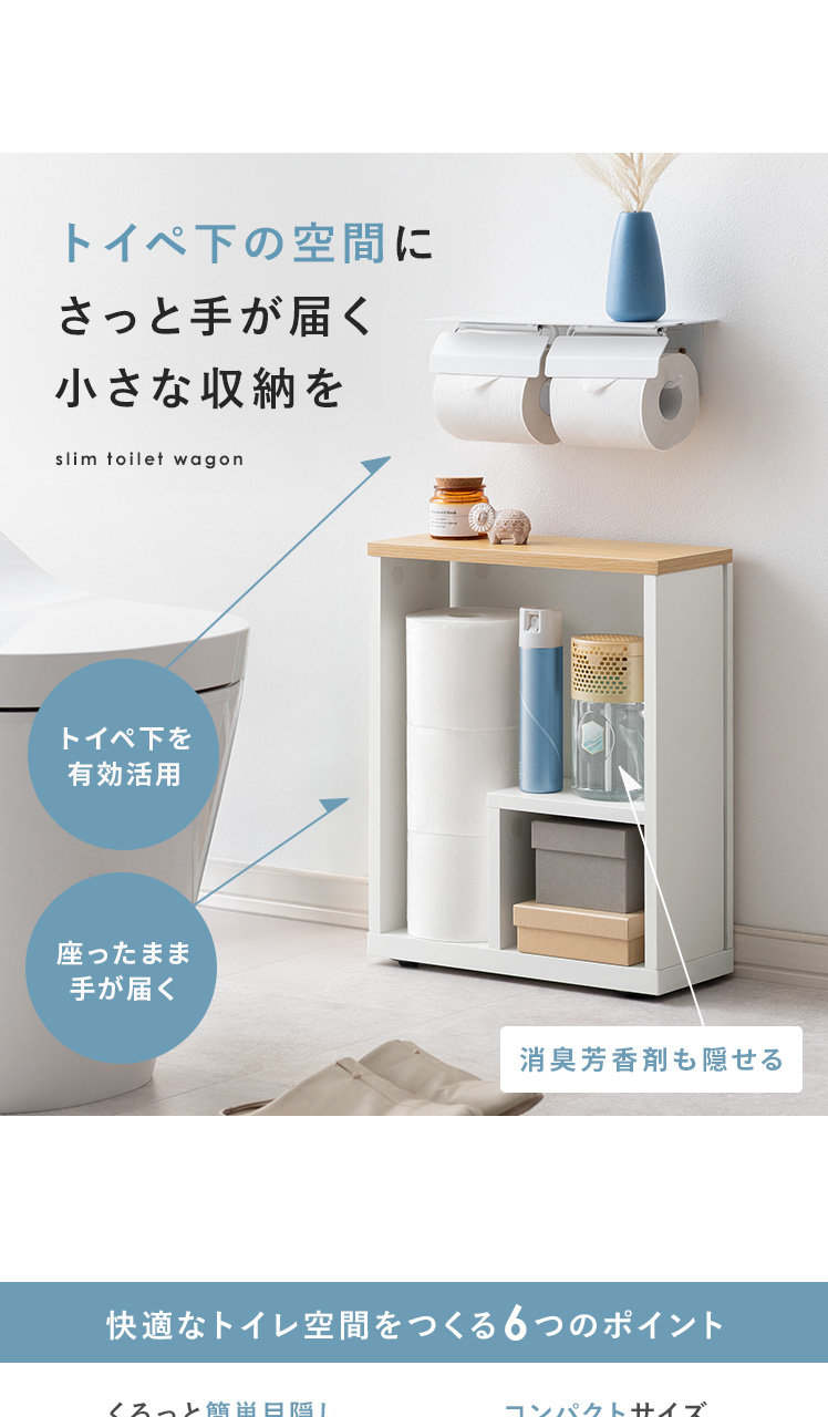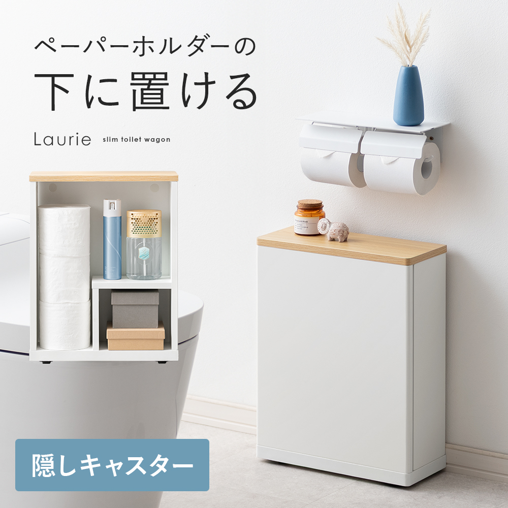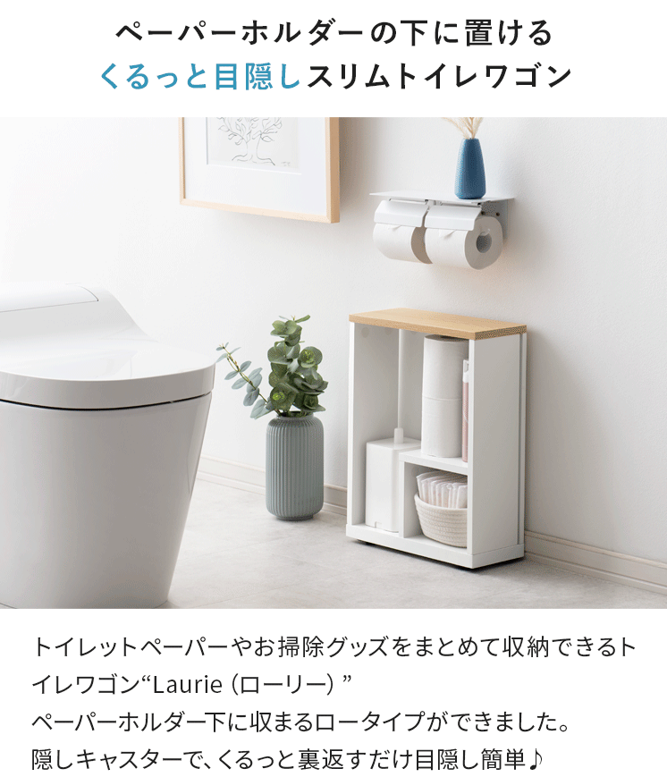 スリムトイレワゴン Laurie〔ローリー〕 ロータイプ/トイレットペーパーやお掃除グッズをまとめて収納できるトイレワゴン“Laurie(ローリー)”ペーパーホルダー下に収まるロータイプができました。隠しキャスターで、くるっと裏返すだけ目隠し簡単♪