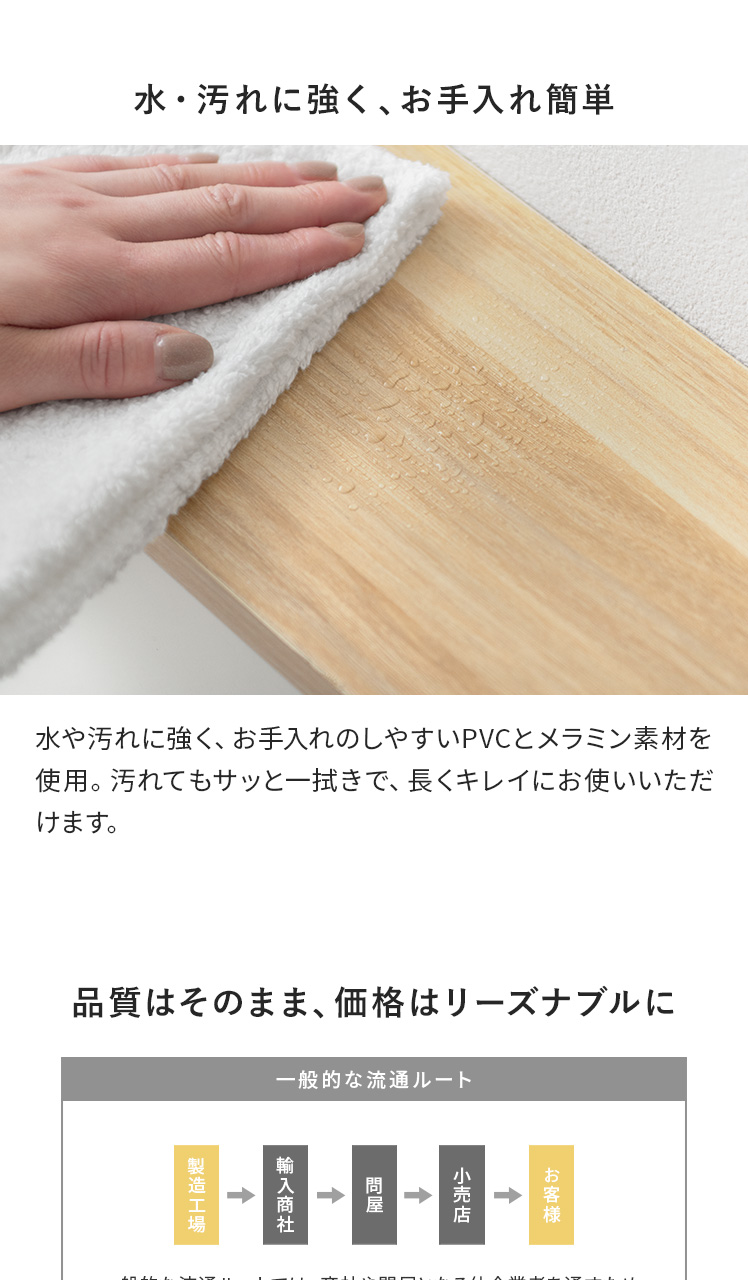 | 材質 | 合成樹脂化粧繊維板(PVC、メラミン) |