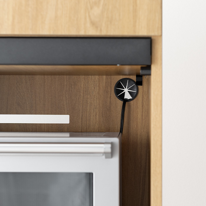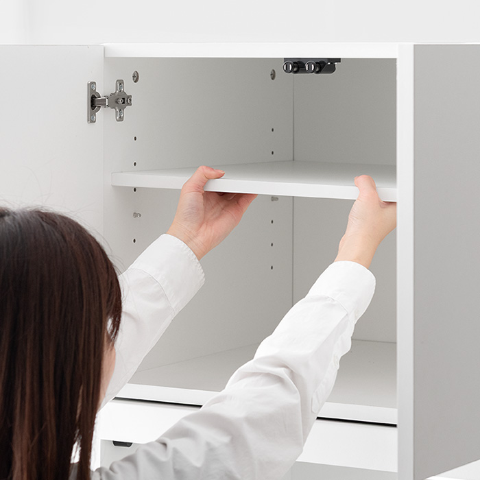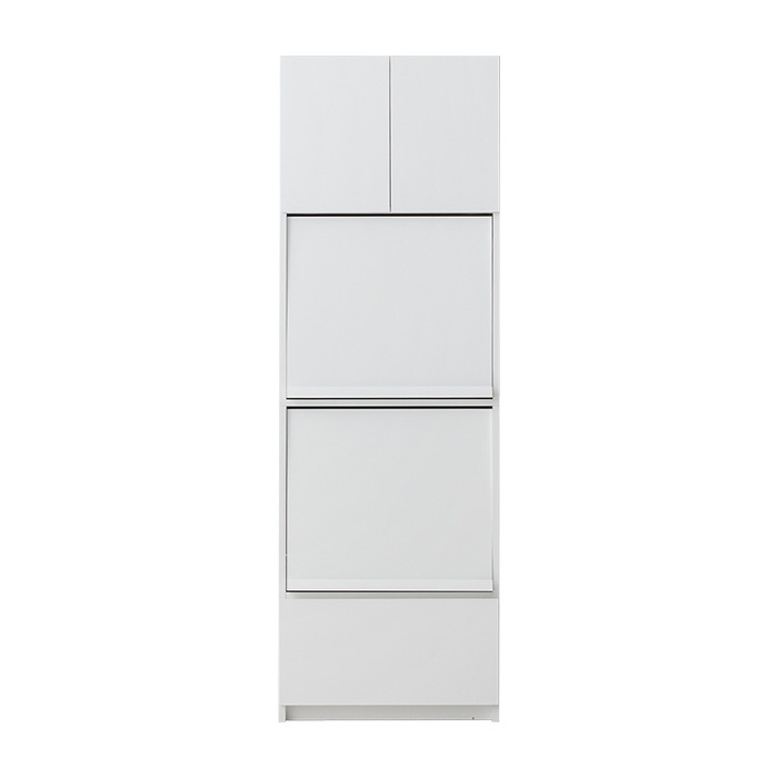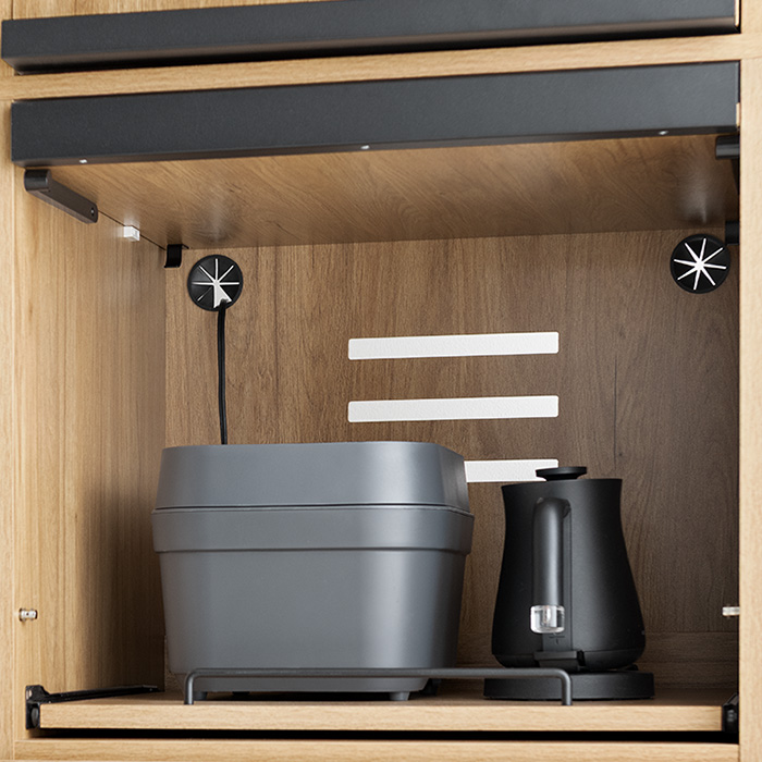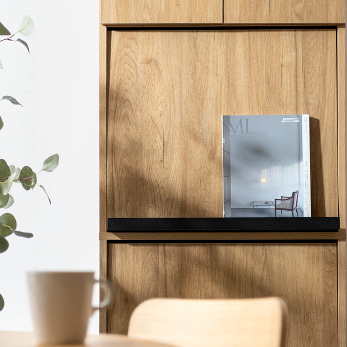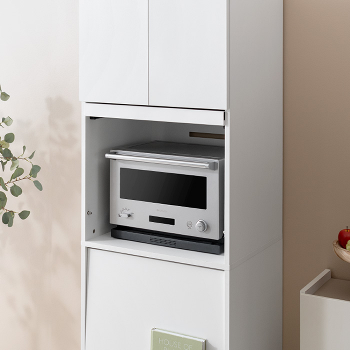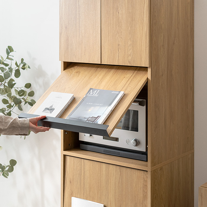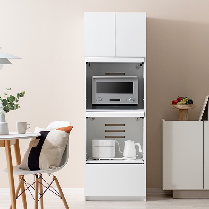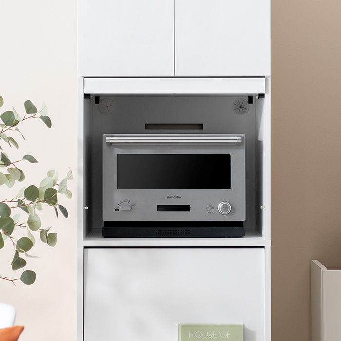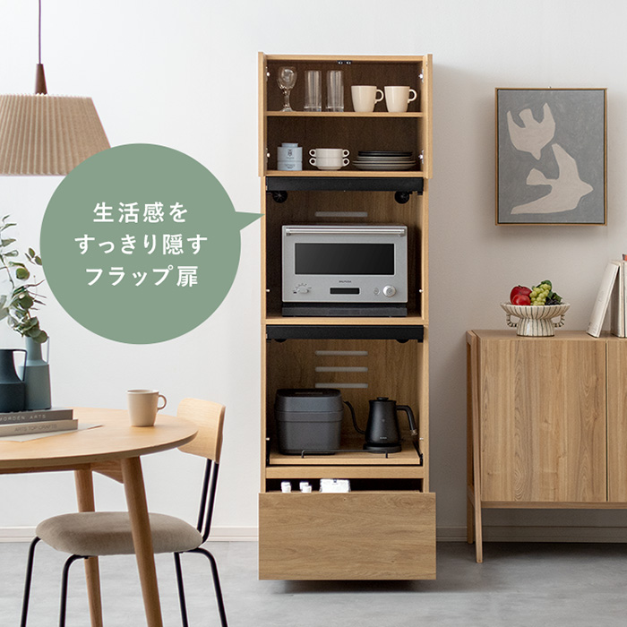隠せるレンジボード Leano〔リーノ〕/フラップ扉でレンジや家電をさっと目隠し。キッチンアイテムがすっきり収まる、スリムなレンジボード“Leano(リーノ)”省スペースでもたっぷりしまえる収納力と使いやすい工夫で毎日の家事を快適に。
