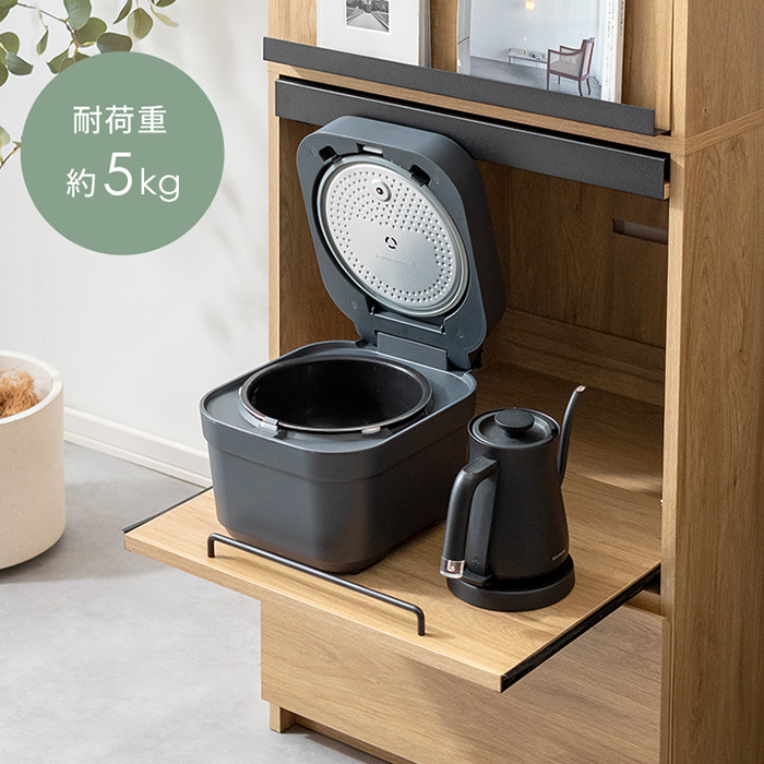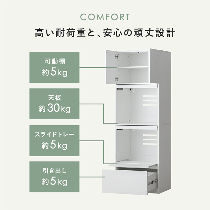 耐荷重 | 可動棚/約5kg、レンジ収納天板/約30kg、スライドトレー/約5kg、引き出し収納/約5kg |