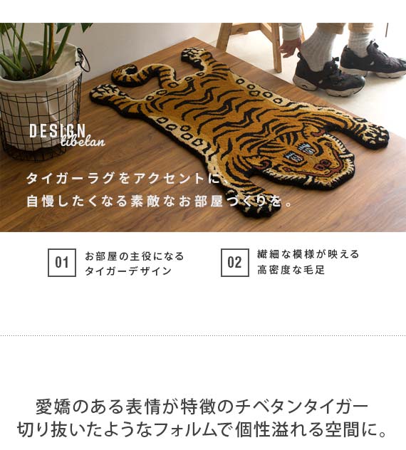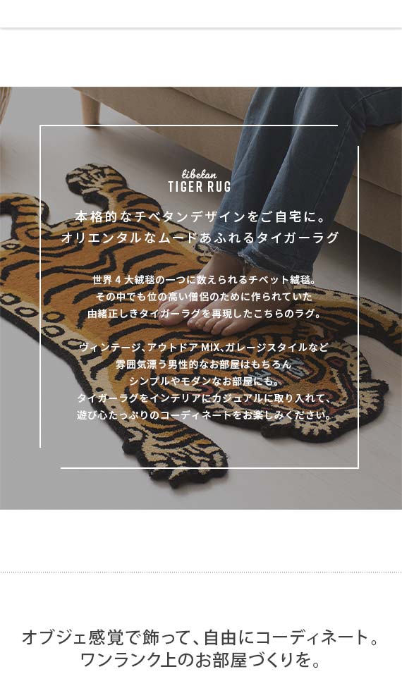 TIBETAN TIGER RUG〔チベタンタイガーラグ〕 SSサイズ 50×85cm/高いデザイン性から雑誌などでも取り上げられ、近年注目を浴びているチベタンタイガーラグ。幅広いシーンで使える4サイズをご用意しました。ヴィンテージやインダストリアルなどメンズライクなお部屋はもちろん、シンプルなお部屋にも。愛嬌のある表情や独特のフォルムが、お部屋のインテリアを格上げしてくれます。また、ぎっしり高密度に織られたウール100%の短い毛足は、ベタつきにくく1年中サラッと快適。憧れのチベタンラグでをカジュアルに取り入れて、自慢したくなるような素敵なお部屋づくりを。