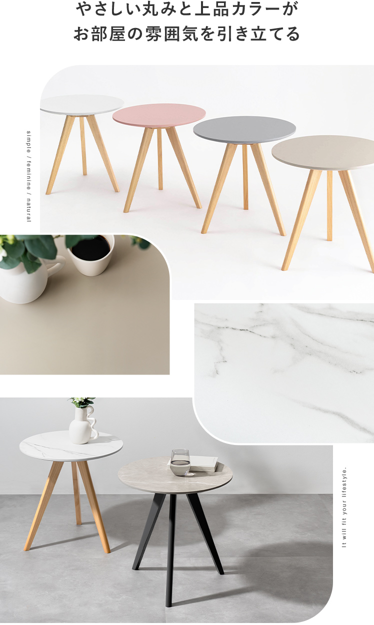 サイドテーブルRonde〔ロンデ〕 カラータイプ/ラウンドフォルムと上品なカラーで、お部屋にやさしい印象を添えるサイドテーブル。くすみ系や大理石調など、空間になじみやすいデザインと実用的なサイズ感で、ベッドやソファ横にちょうどよくフィットします。